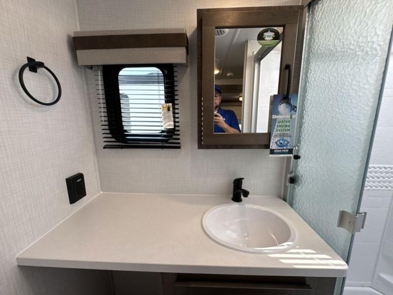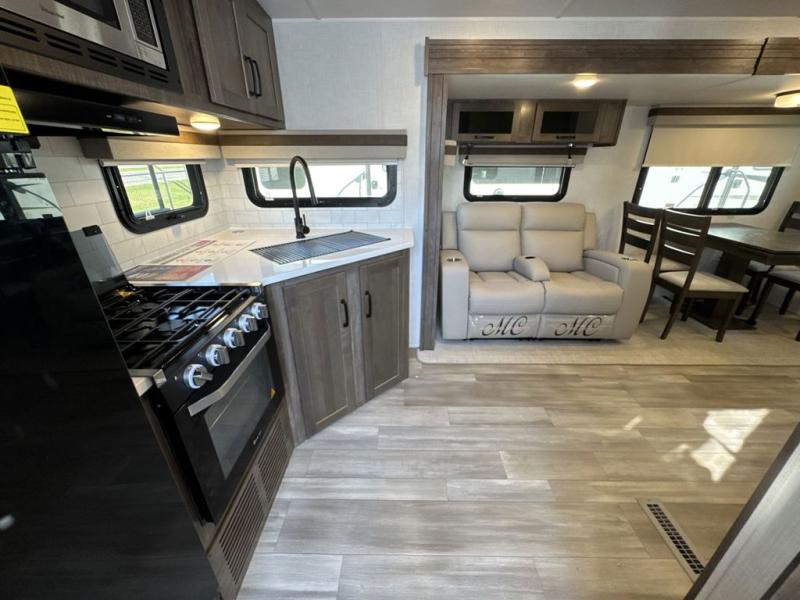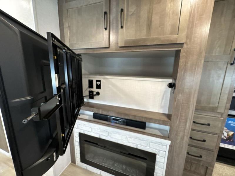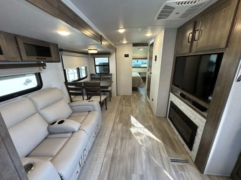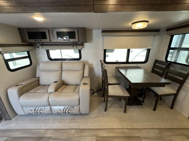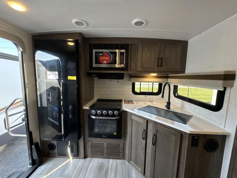 Whether you camp to relax or seek adventure, this trailer will be available for you to be comfortable indoors or outdoors! You will find there are many convenient features throughout including the dual entry doors, the 12V refrigerator and the pantry being next to the main entry for easy access, and the outside kitchen gives the cook choices when making meals. The interior rear kitchen includes full amenities, the theater seating and booth dinette slide offer seating and sleeping space, and the full bathroom gives you counter space to place your toiletries and such plus a shower to get cleaned up in each night. The front bedroom offers privacy, a queen bed slide, clothing storage and the second entry door.