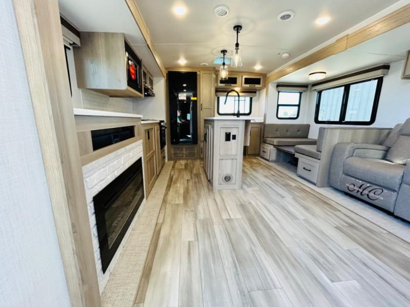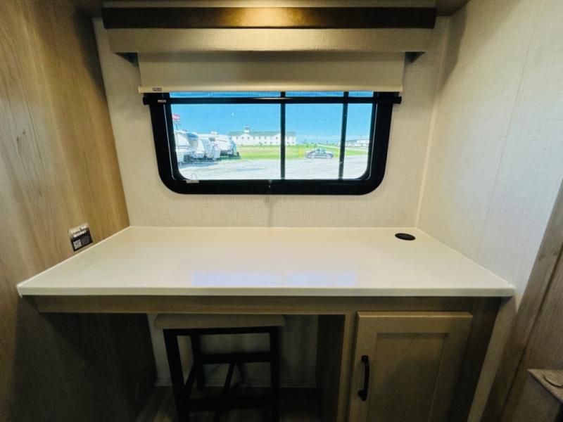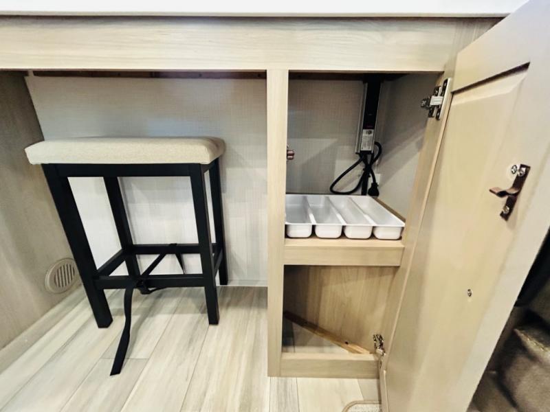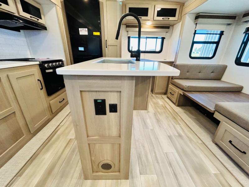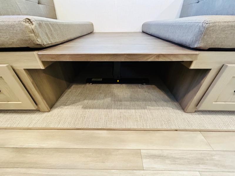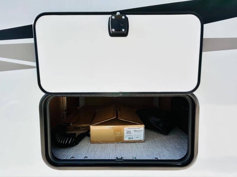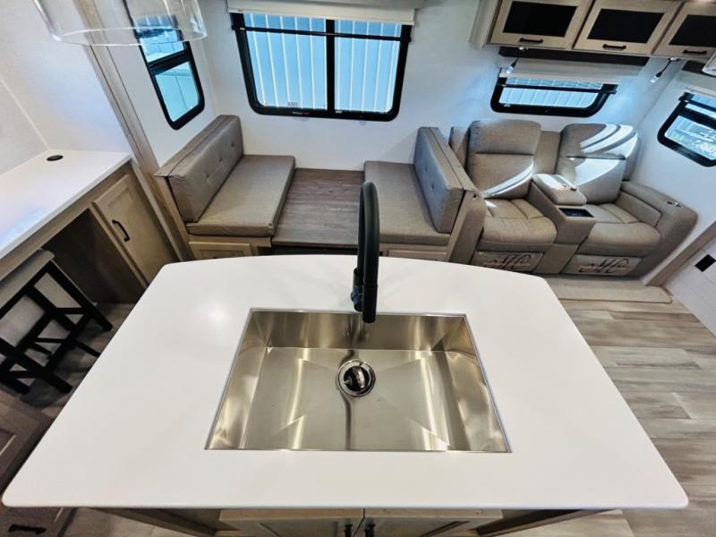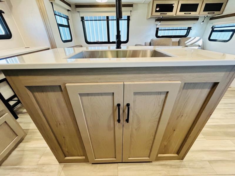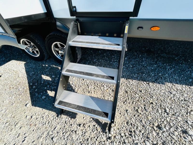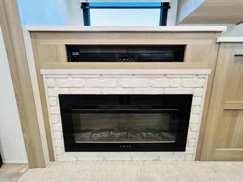 Hike the trails, fish the lake, and relax indoors after the cook whips up a meal with full amenities in the rear kitchen. Here, you'll find a kitchen island, a large pantry, and a desk area that can used to get some work done. The 44" booth dinette allows you to eat your meals together and watch the Smart TV with a fireplace below, and this can be optioned out for a hide-a-bed sofa. The theater seating is another comfortable place to relax, and the double entry bathroom is convenient especially at night. This model also includes an outside kitchen, two power awnings, plus Solid Step entry steps!