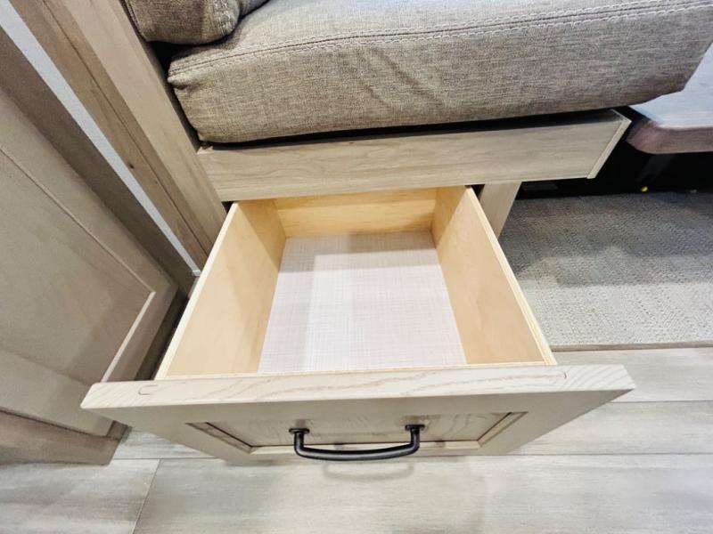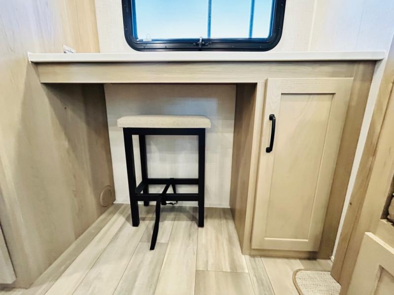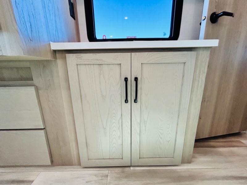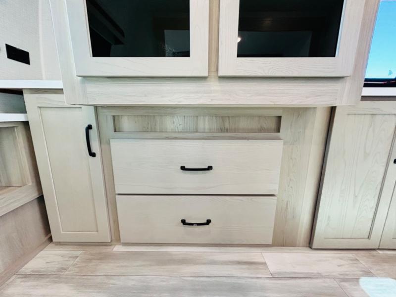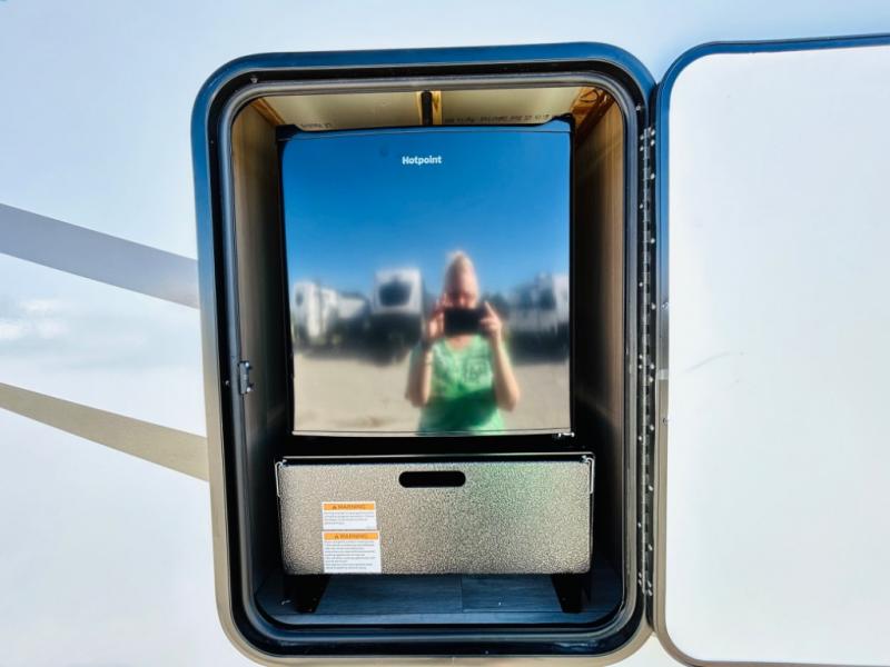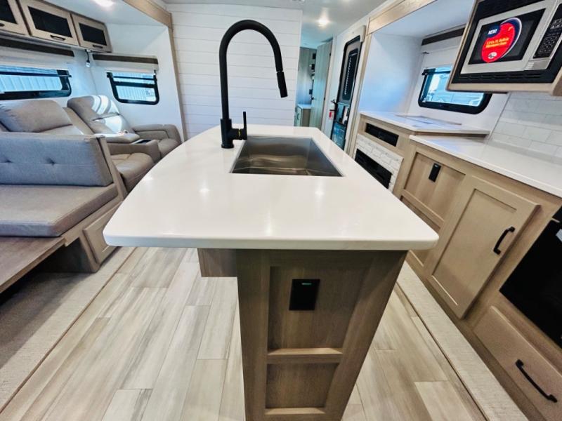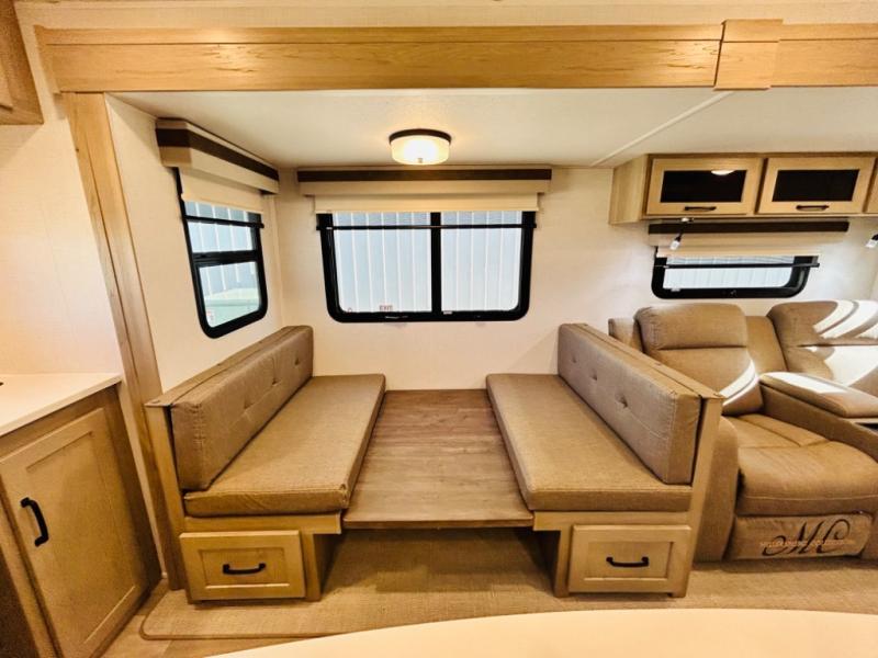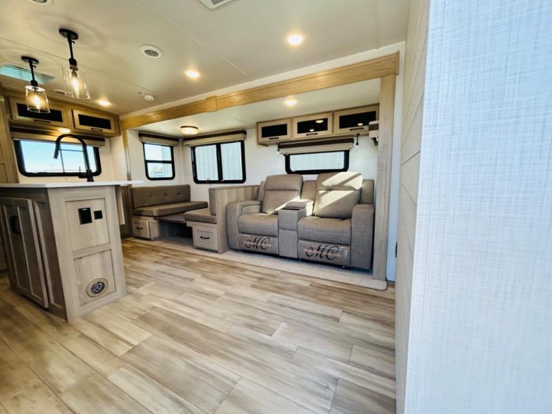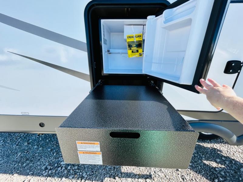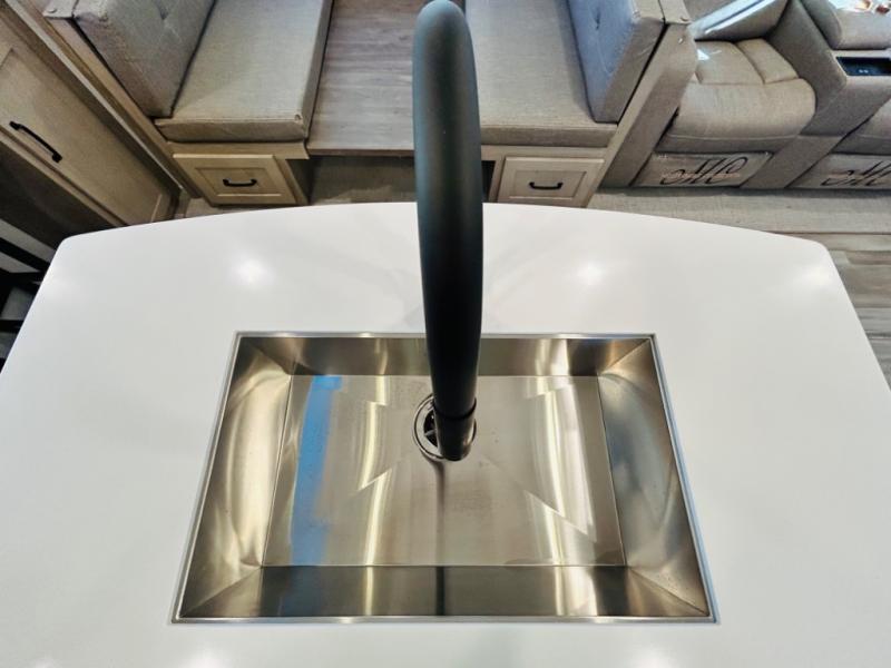 Hike the trails, fish the lake, and relax indoors after the cook whips up a meal with full amenities in the rear kitchen. Here, you'll find a kitchen island, a large pantry, and a desk area that can used to get some work done. The 44" booth dinette allows you to eat your meals together and watch the Smart TV with a fireplace below, and this can be optioned out for a hide-a-bed sofa. The theater seating is another comfortable place to relax, and the double entry bathroom is convenient especially at night. This model also includes an outside kitchen, two power awnings, plus Solid Step entry steps!