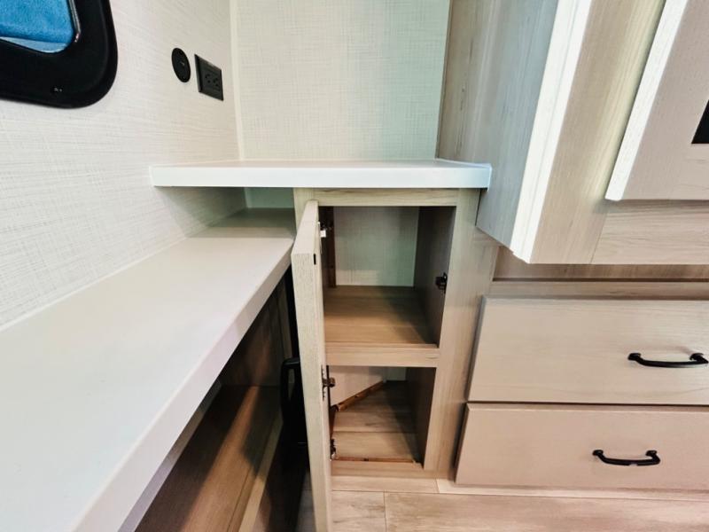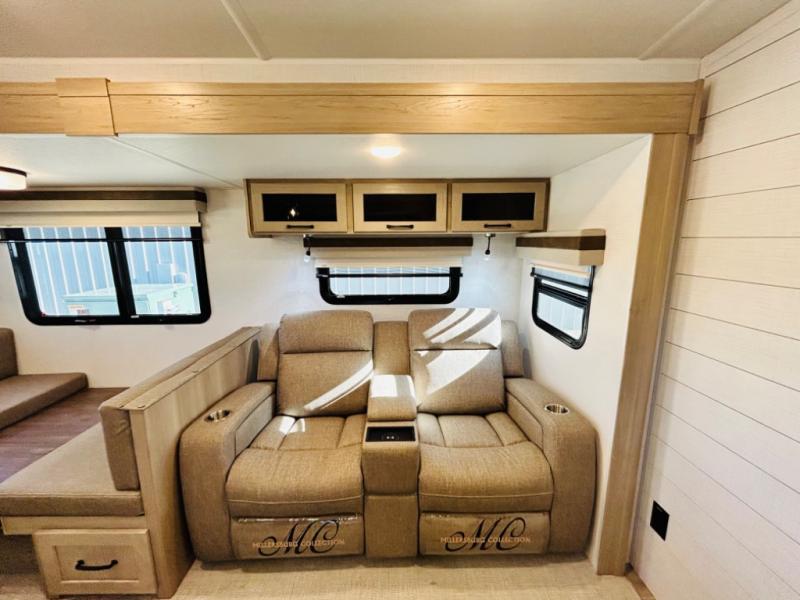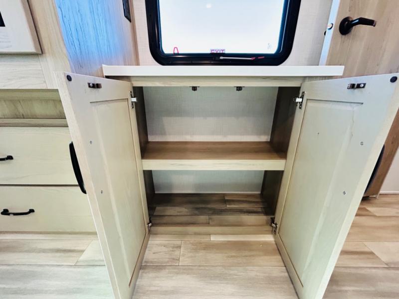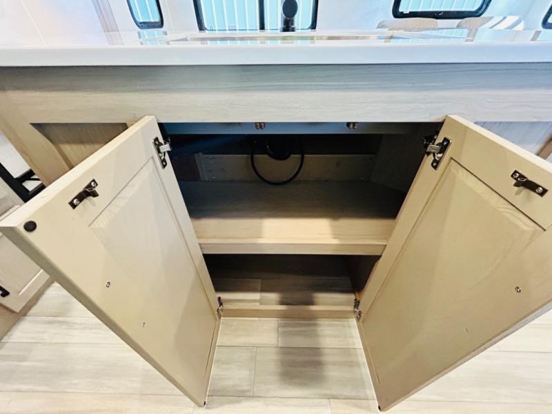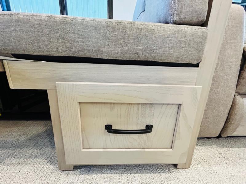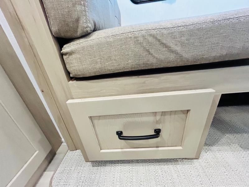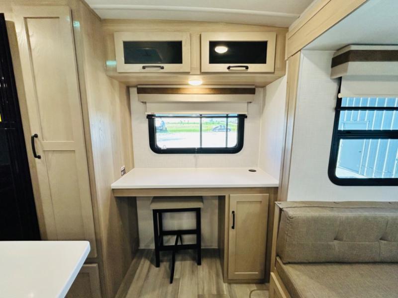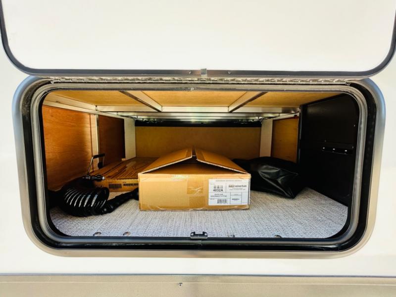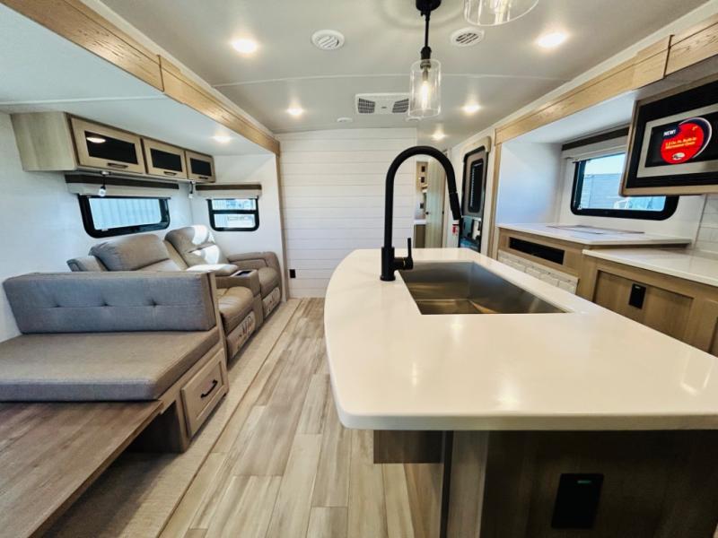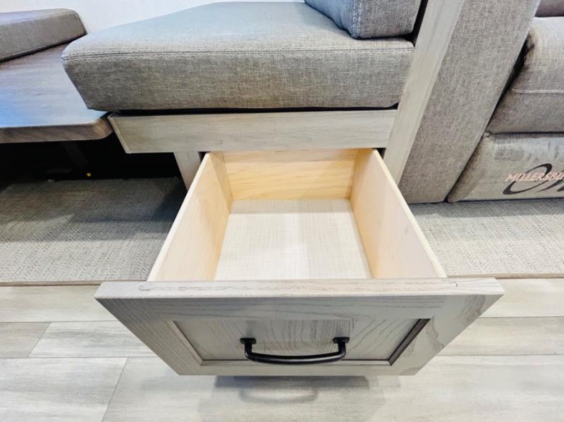 Hike the trails, fish the lake, and relax indoors after the cook whips up a meal with full amenities in the rear kitchen. Here, you'll find a kitchen island, a large pantry, and a desk area that can used to get some work done. The 44" booth dinette allows you to eat your meals together and watch the Smart TV with a fireplace below, and this can be optioned out for a hide-a-bed sofa. The theater seating is another comfortable place to relax, and the double entry bathroom is convenient especially at night. This model also includes an outside kitchen, two power awnings, plus Solid Step entry steps!
