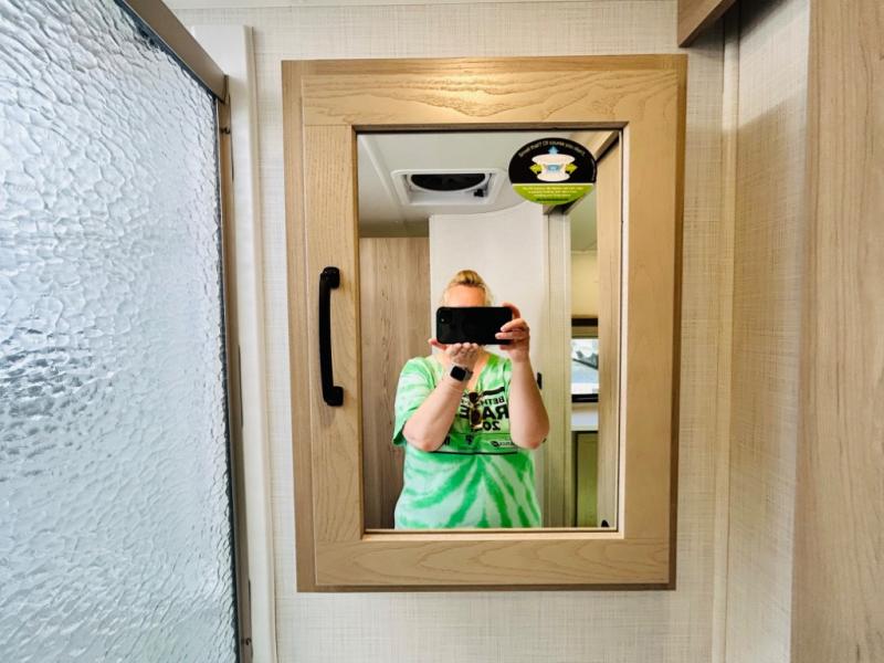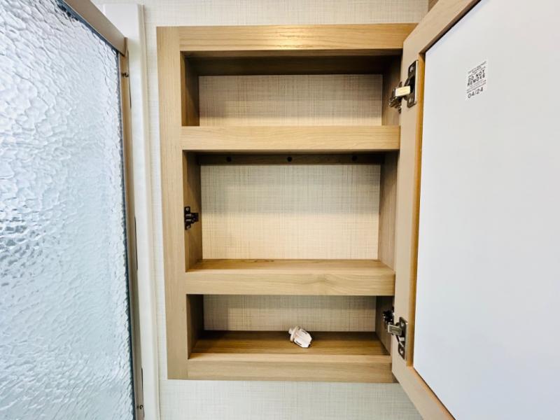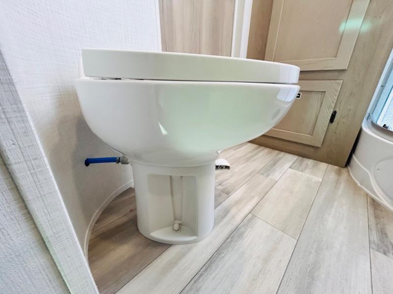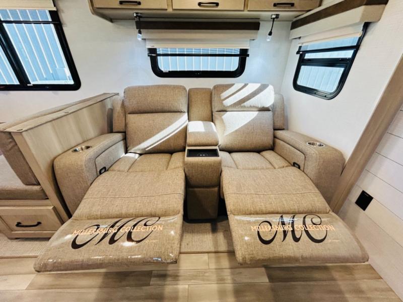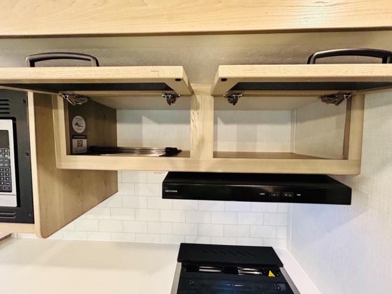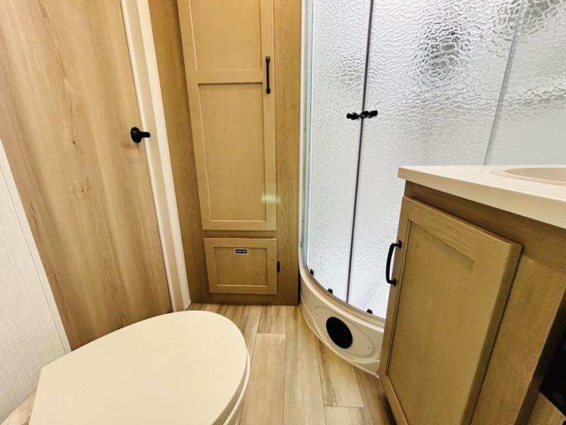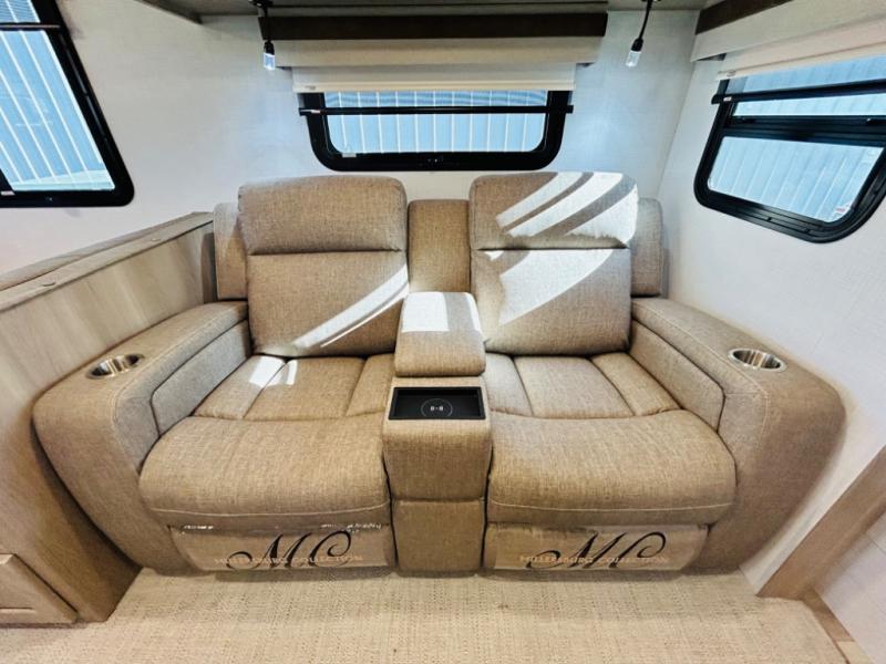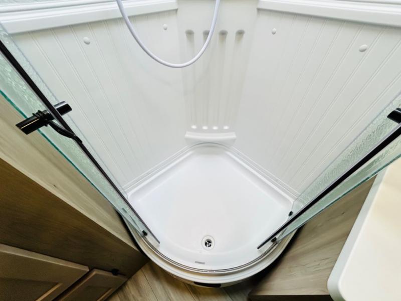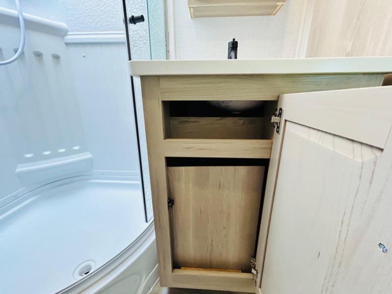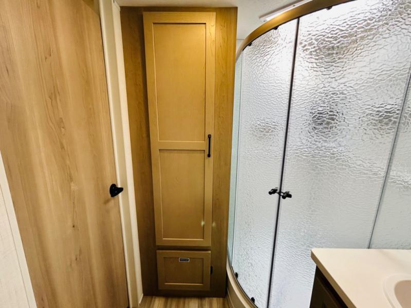 Hike the trails, fish the lake, and relax indoors after the cook whips up a meal with full amenities in the rear kitchen. Here, you'll find a kitchen island, a large pantry, and a desk area that can used to get some work done. The 44" booth dinette allows you to eat your meals together and watch the Smart TV with a fireplace below, and this can be optioned out for a hide-a-bed sofa. The theater seating is another comfortable place to relax, and the double entry bathroom is convenient especially at night. This model also includes an outside kitchen, two power awnings, plus Solid Step entry steps!