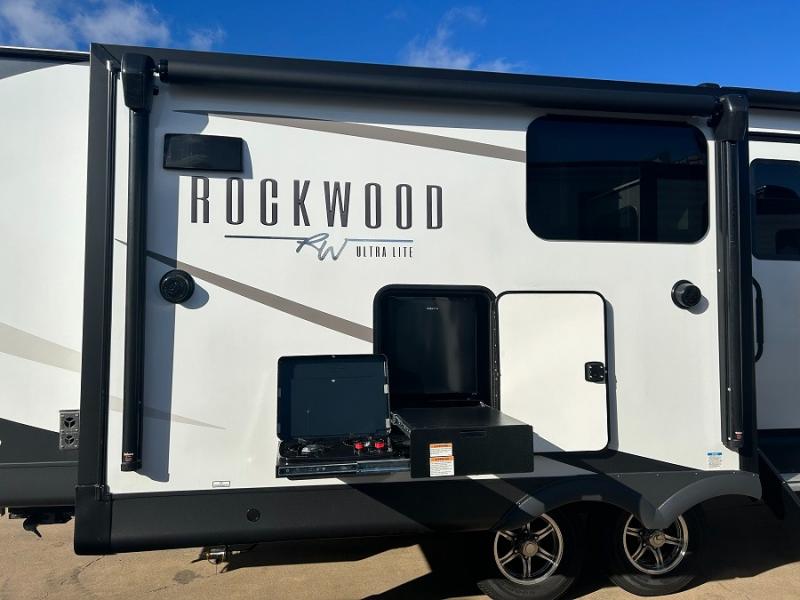 Each Rockwood Ultra Lite travel trailer by Forest River includes superior construction with a high gloss front cap, laminated white fiberglass sidewalls, and tinted frameless windows for a sleek look. You will love how easy it will be to charge a few electronics with the 200W roof solar panel with an 1800W inverter, and the AIR 360+ omnidirectional antenna with WiFi prep will let you stay connected to the outside world as you camp. The torsion axle, Rubber-Ryde suspension will make towing smooth and hassle-free, along with the nitrogen filled, Goodyear Endurance tires and the tire pressure monitor system. Interior comforts include designer kitchen backsplash, solid wood cabinet doors with hidden hinges, and night roller shades to name a few. Choose a Rockwood Ultra Lite travel trailer today!