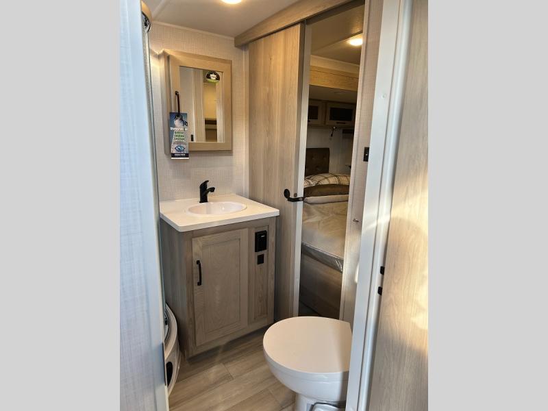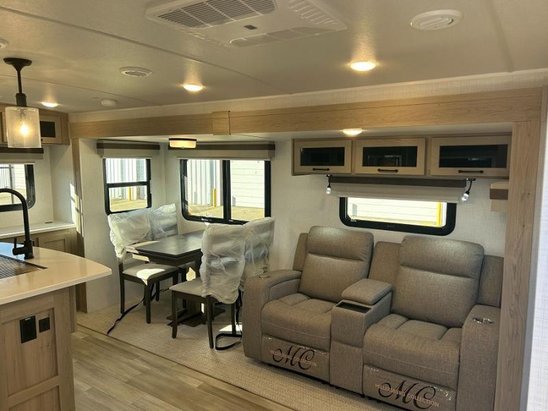 Hike the trails, fish the lake, and relax indoors after the cook whips up a meal with full amenities in the rear kitchen. Here, you'll find a kitchen island, a large pantry, and a desk area that can used to get some work done. The 44" booth dinette allows you to eat your meals together and watch the Smart TV with a fireplace below, and this can be optioned out for a hide-a-bed sofa. The theater seating is another comfortable place to relax, and the double entry bathroom is convenient especially at night. This model also includes an outside kitchen, two power awnings, plus Solid Step entry steps!