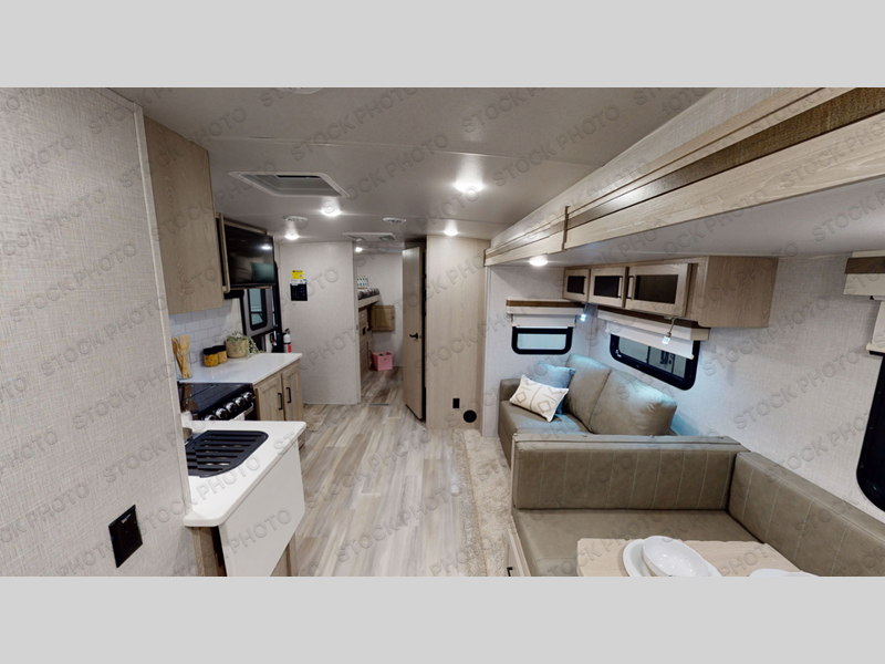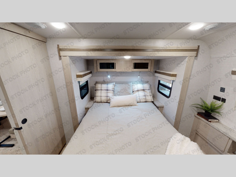 Go camping to explore the outdoors or enjoy the scenery and do it all over again thanks to the comfort of your own trailer at the campsite! The dual entry doors make entering and exiting easy to the private rear bunkhouse with two bunks and a 68" sofa. You will find lots of storage in the front bedroom, plus a queen bed slide and the second entry, and the full bathroom has access from the main living and kitchen area. Everyone can relax on the theater seating or U-shaped dinette while the cook uses the L-shaped kitchen area with full amenities to make meals. And the exterior gives you an outside kitchen, a griddle, plus exterior storage for larger camp gear!