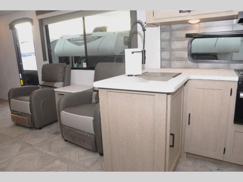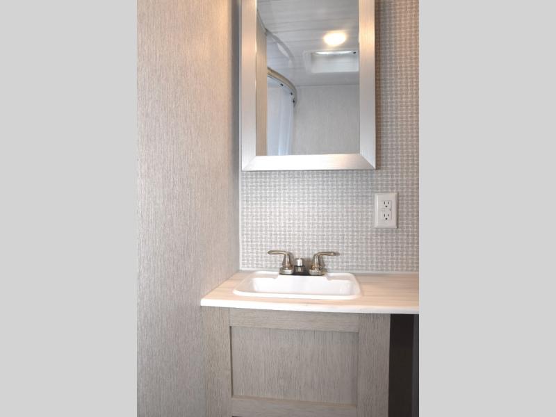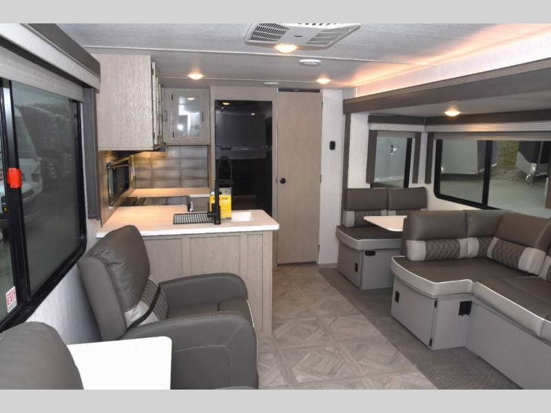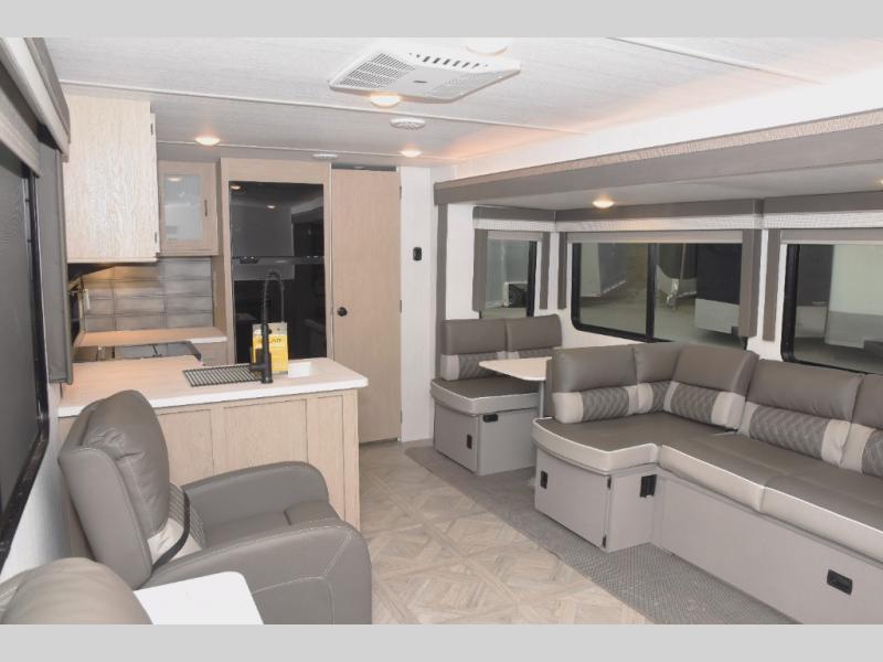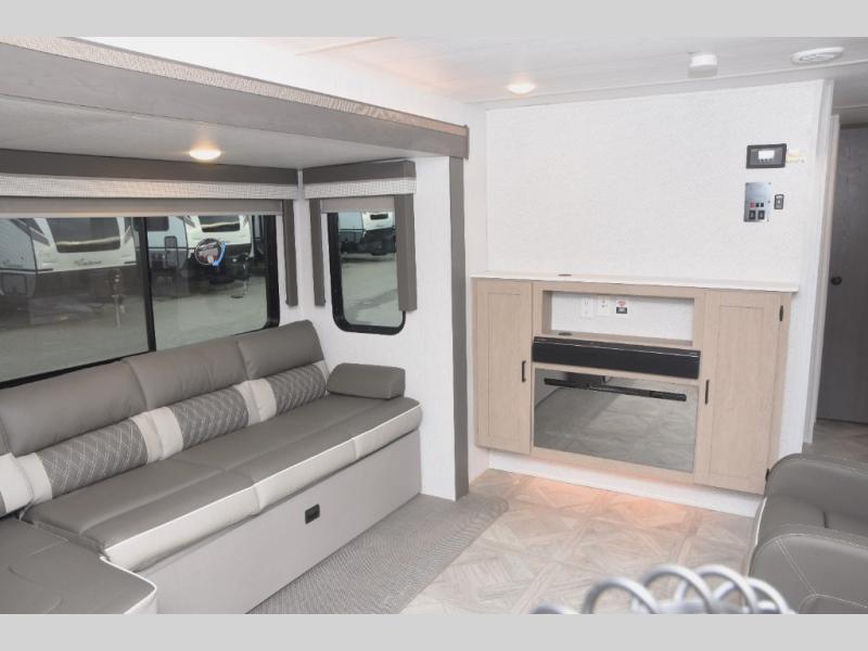 With a spacious kitchen and panoramic windows, this travel trailer is sure to stand out! The Versa Lounge is customizable for you to reconfigure for your needs. Your nights will be spent in true comfort by playing games at the booth dinette or relaxing in one of the two chairs by the fireplace. You can either cook a delicious meal in the rear kitchen or you can use the exterior camp kitchen to breathe in some fresh air while you cook outdoors. After a fun-filled day, you can rinse off in the walk-in shower then head to the front private bedroom where you will find a Versa-Tilt custom king bed for a good night's rest!
