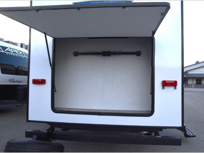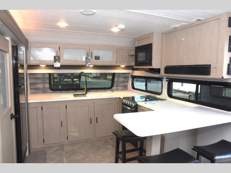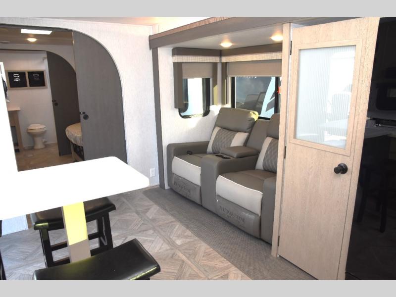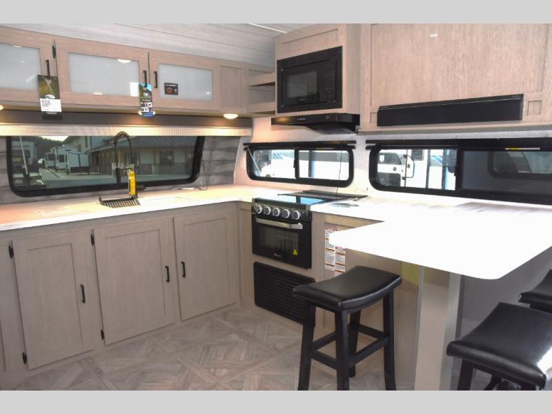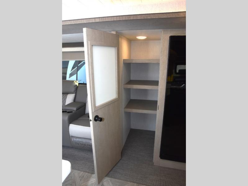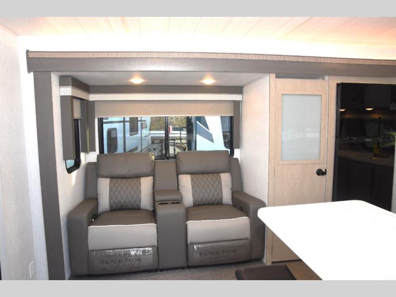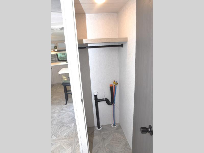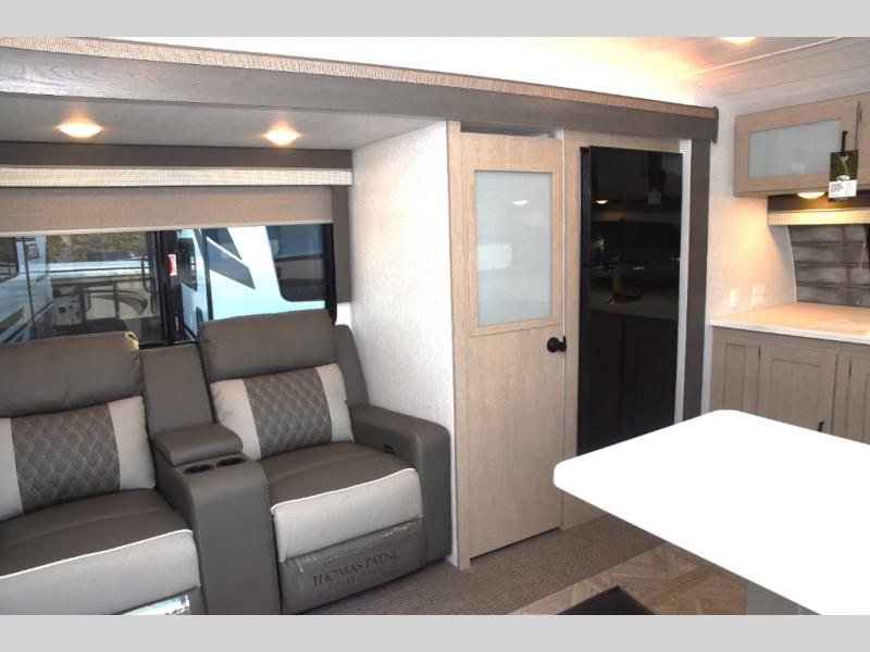 You will fall in love with this travel trailer as soon as you walk through the door! One of the dual entry doors leads directly into the front kitchen and living area which has theater seating, four bar stools to enjoy meals at the countertop, plus a bench right at the entrance to make putting your shoes on easier. Inside the master suite is a Versa-Tilt custom king bed slide across from a dresser with TV prep, an area prepped to add an optional washer and dryer, and access to the full rear bathroom. You will find a walk-in shower to freshen up in each morning, recessed storage, and the second entrance/exit door to the unit. You even have an exterior camp kitchen to prepare meals outdoors, a 20' awning to protect you rain or shine and a Versa garage for your items!