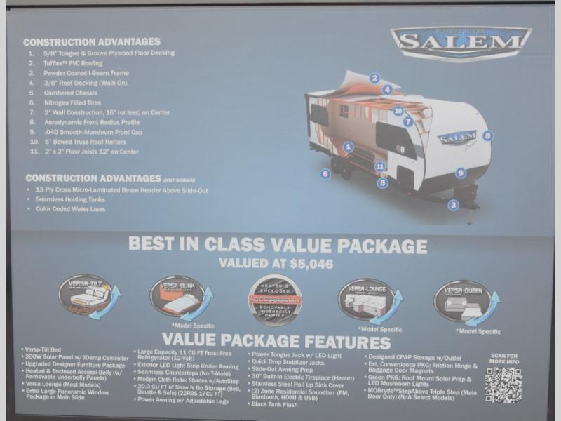 Enjoy years and years of memories with any one of these Forest River Salem travel trailers! They are built with a one piece, SuperFlex roof, a powder coated I-beam frame, and an aerodynamic front radius profile for an easier tow. The triple seal slide out system prevents water from seeping inside and keeps it outside where it belongs. The Best In Class Value Package includes upgraded designer furniture, seamless countertops with no T-mold, and two zone residential soundbars with FM, Bluetooth, HDMI and USB. You will also appreciate the heated and enclosed Accessi-Belly with removable underbelly panels, the power tongue jack with an LED light, and the designated CPAP storage. Some new upgraded features include: an upgraded slide-out fascia, a Versa-Tilt bed, an upgraded shower head, and a 60K tankless water heater, and so much more!