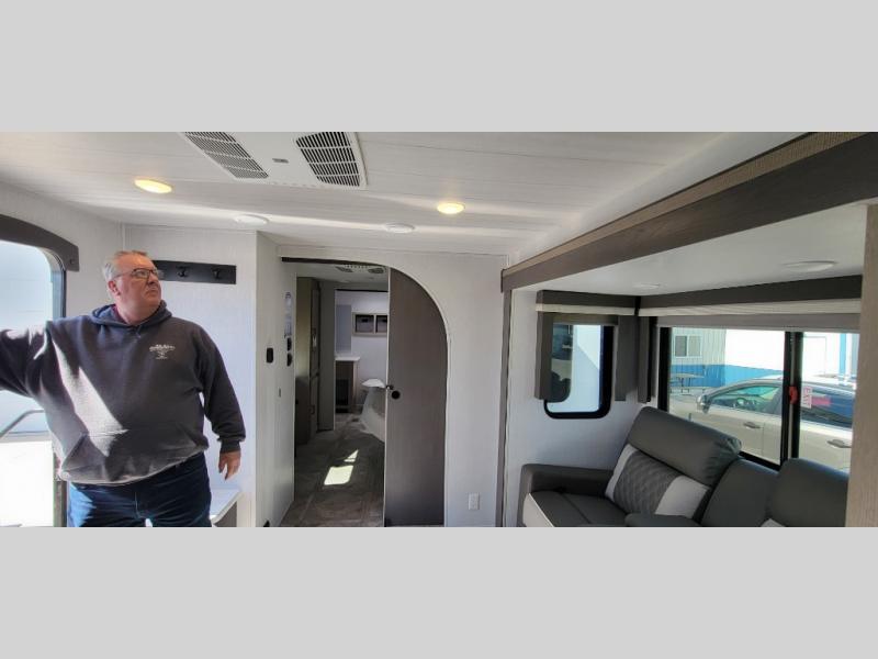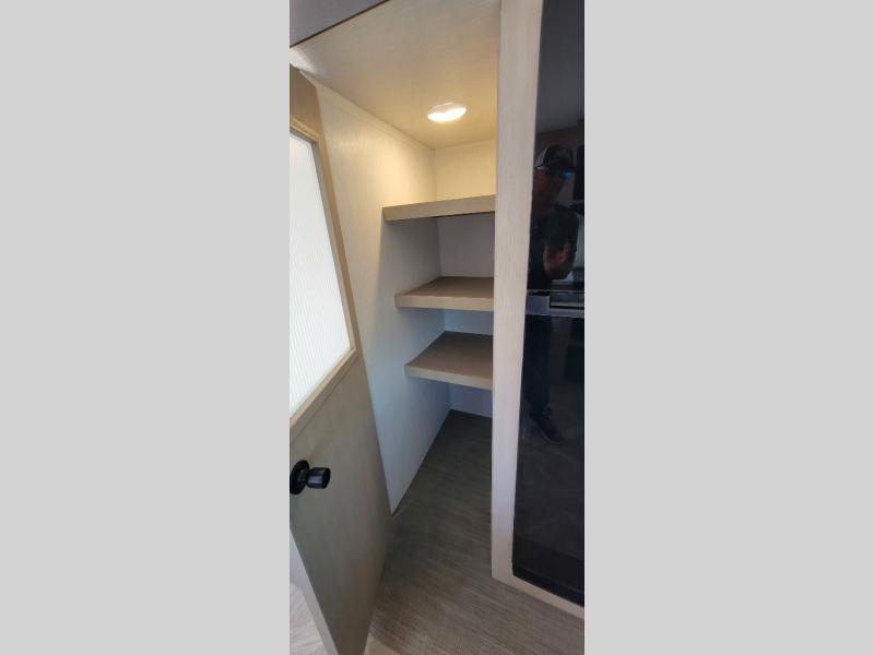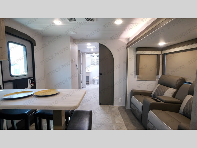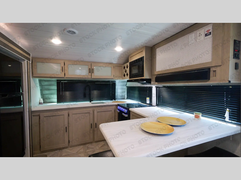 You will fall in love with this travel trailer as soon as you walk through the door! One of the dual entry doors leads directly into the front kitchen and living area which has theater seating, four bar stools to enjoy meals at the countertop, plus a bench right at the entrance to make putting your shoes on easier. Inside the master suite there is a Versa-Tilt custom king bed slide across from a dresser with TV prep above, a washer and dryer prep option, and access to the full rear bathroom. You will find a walk-in shower to freshen up in each morning, recessed storage, and the second entrance/exit door to the unit. You even have an exterior camp kitchen to prepare meals outdoors, a 20' awning to protect you rain or shine, and a Versa garage for your items!