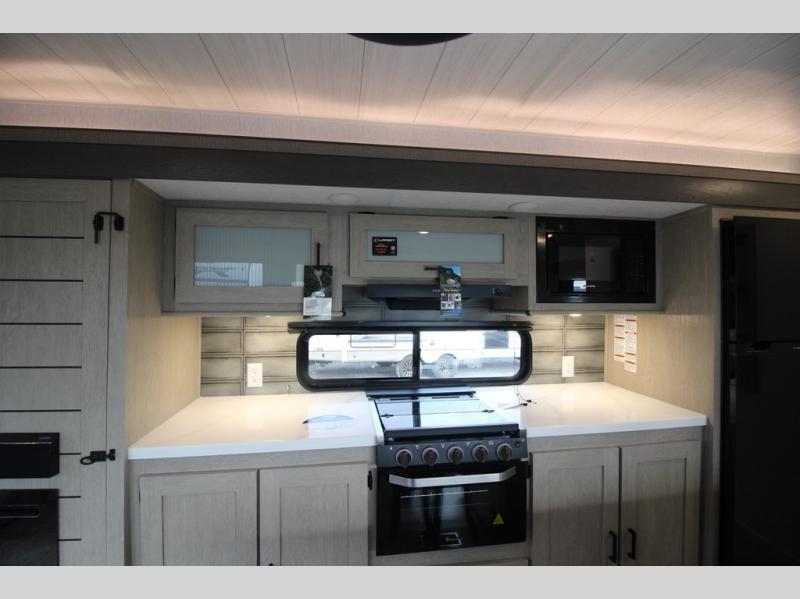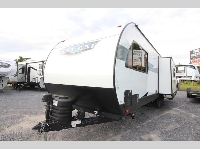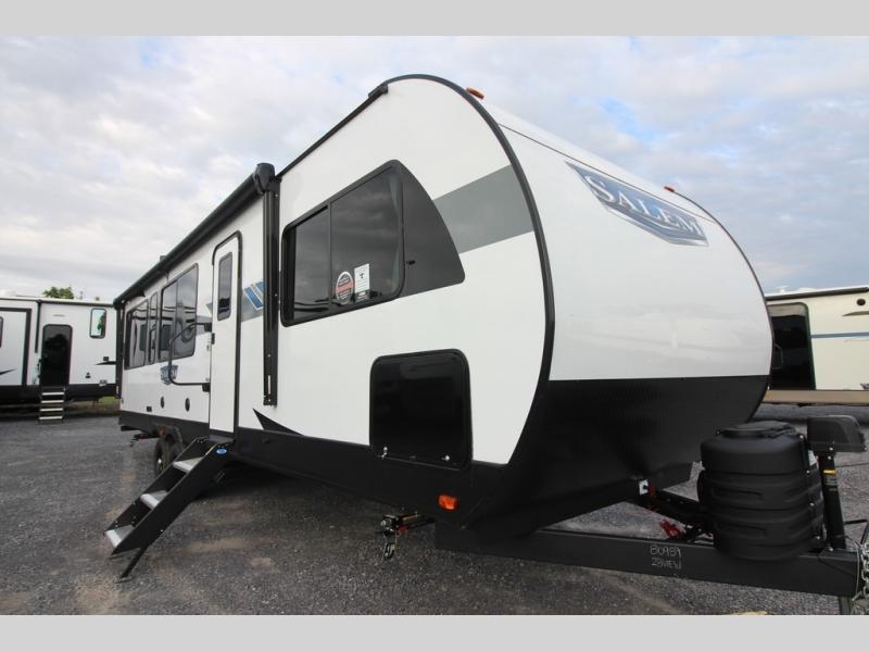 Choose any Salem View travel trailer if you are looking to bring the outdoors inside. With loads of windows you will easily be soaking up your surroundings. All models feature a cambered chassis with a 2" wall construction, 16" (or less) on center, a powder coated I-beam frame with a 3/8" walk-on roof decking and 5/8" tongue and groove plywood floor decking, plus smooth hung fiberglass exterior along with an aerodynamic front radius profile. These units feature seamless holding tanks and color coded water lines as well. The heated and enclosed underbelly allows you to camp through more seasons, and you will enjoy the power tongue jack with LED light, quick drop stabilizer jacks for easy set up, as well as a power awning with adjustable legs, and so much more!