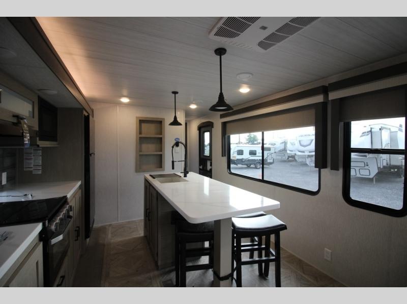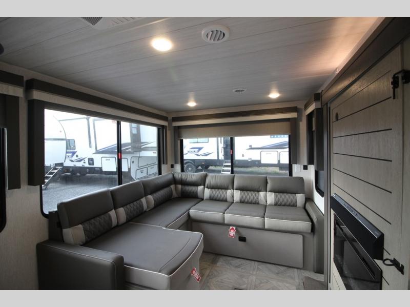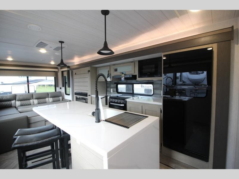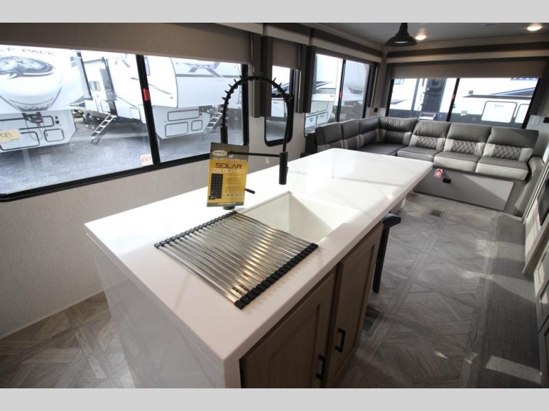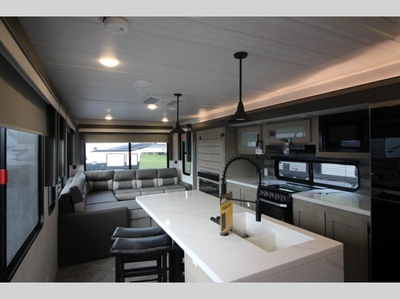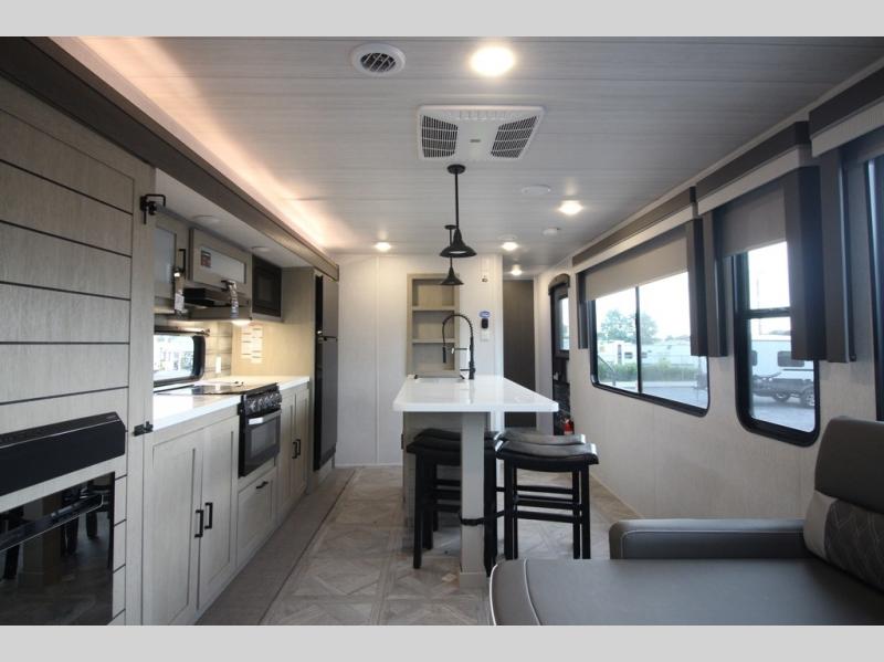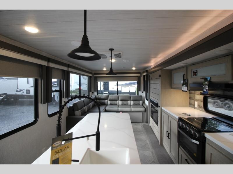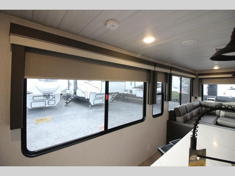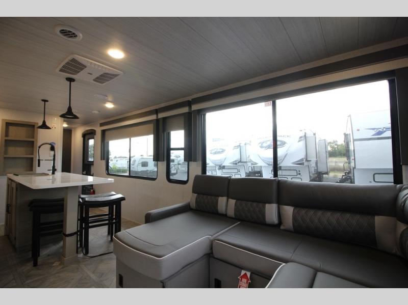 The perfect couple's coach with a view! This Salem View features a 7' kitchen island with a waterfall edge and five bar stools for dining and prep space. The island also houses a double kitchen sink for easy clean-up. Thanks to the island, you will enjoy 15 linear feet of countertop space throughout. The view will be of your choosing thanks to 95.5 square feet of windows that will easily bring the outdoors inside. A sectional sofa across the back of the unit provides ample seating to relax and enjoy a good book or the entertainment center. Behind the entertainment center, you will find hidden storage space with shelves so everything can be tucked out of sight, and an oversized refrigerator will provide enough space for your perishables while you are on vacation as well. A full bath is conveniently located near the main entry featuring StepAbove entry steps. The bath provides a walk-in shower, vanity with sink, toilet, and linen storage. In the private front bedroom, a Versa-Tilt custom king bed will allow you a relaxing and comfortable night's rest, and once again, a great view out the dual opposing windows. On the outside, a 23' awning offers additional living space protected from the elements, and a spacious pass-through storage compartment will allow you to stow away your camp chairs and outdoor equipment and games easily for transport.