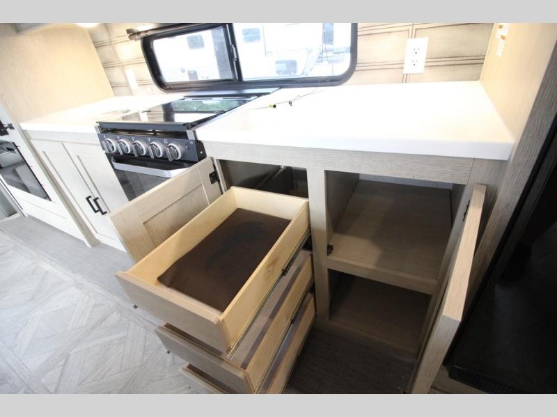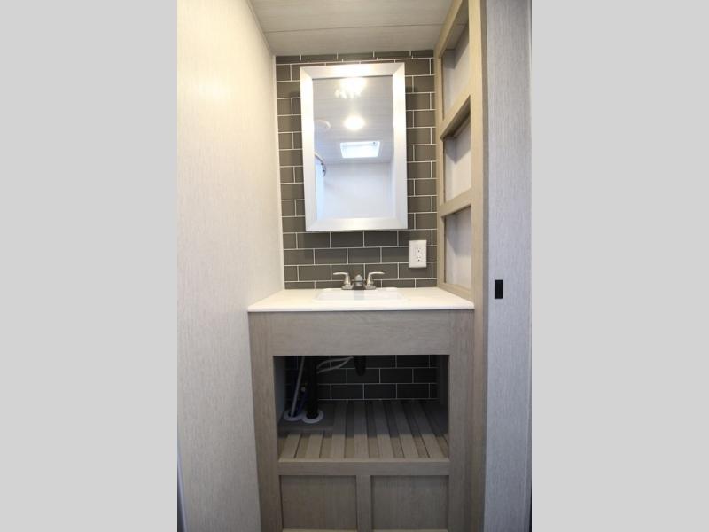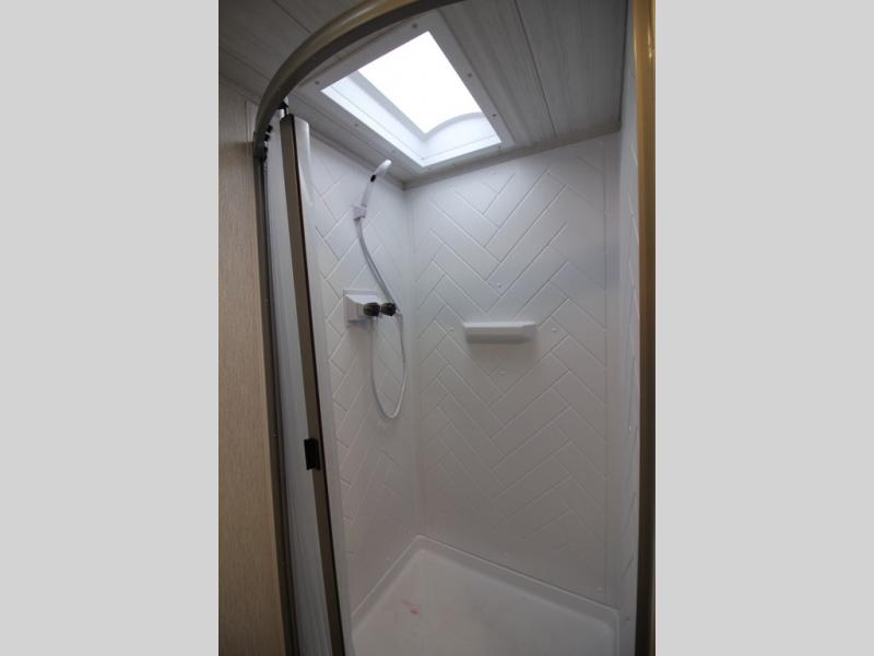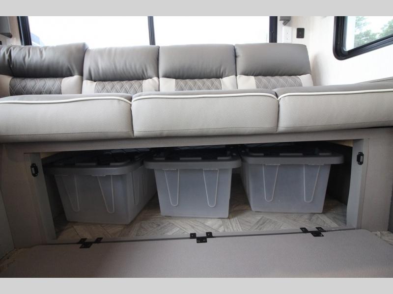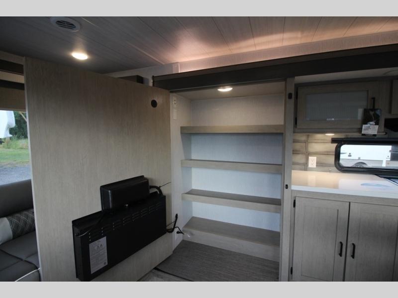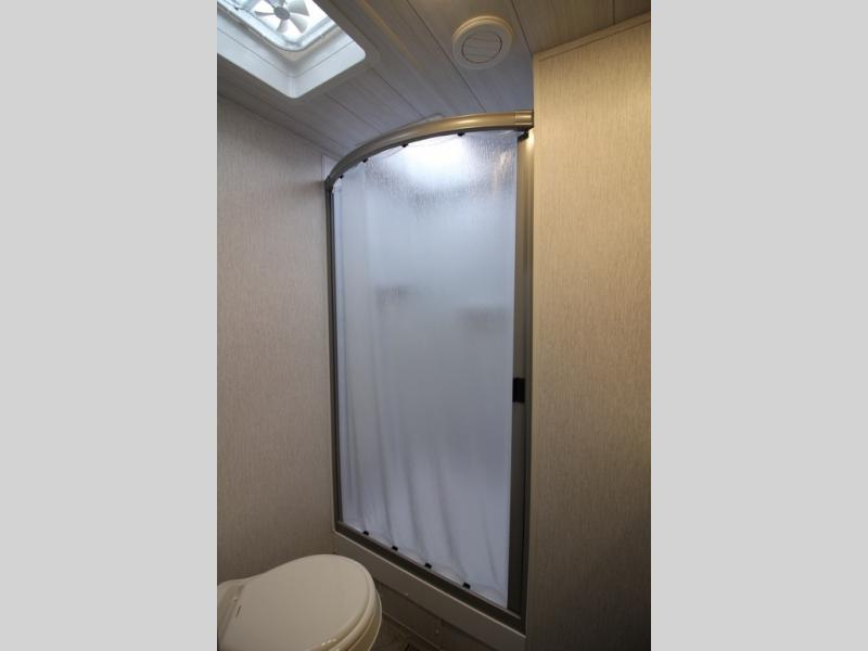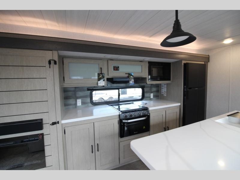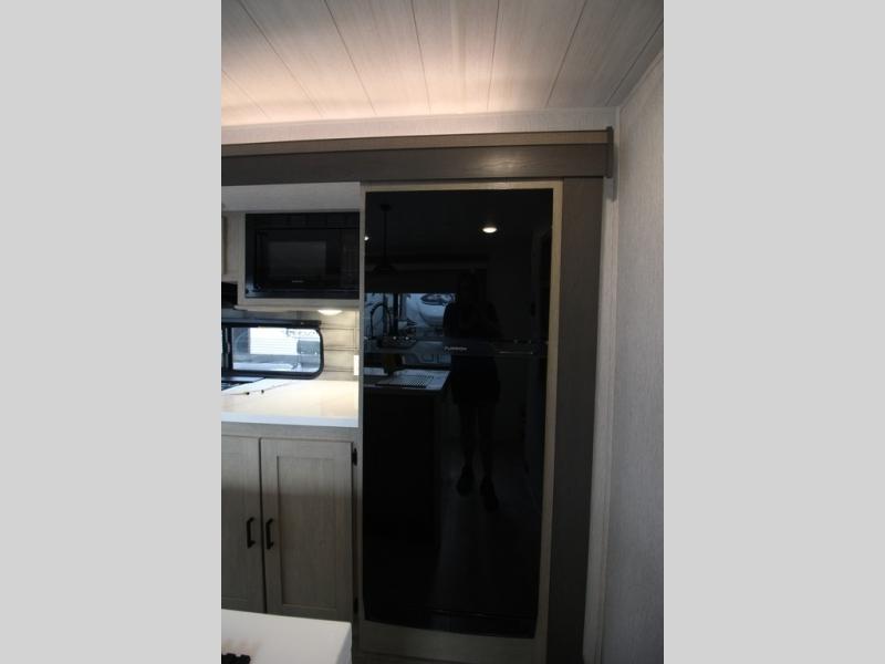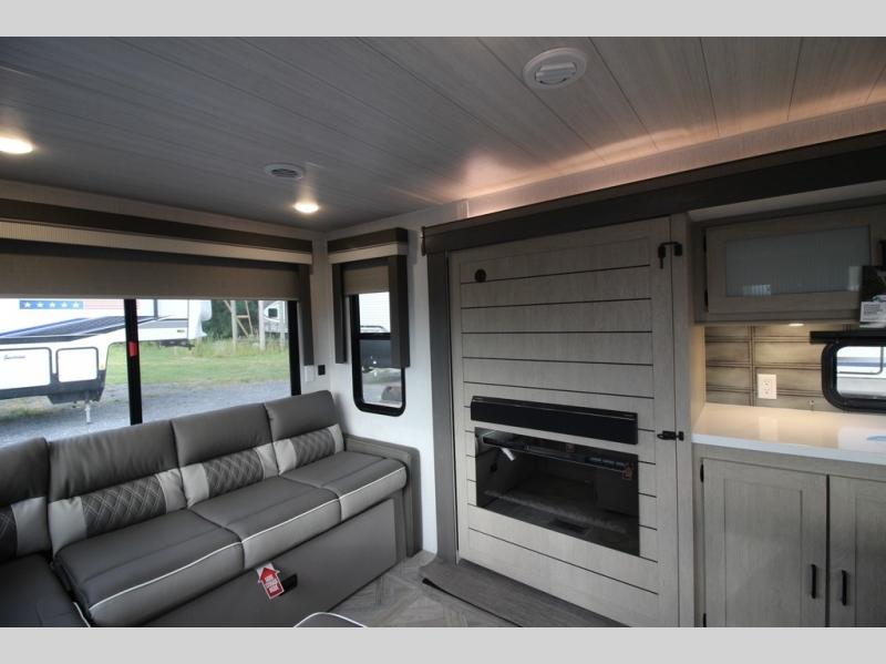 The perfect couple's coach with a view! This Salem View features a 7' kitchen island with a waterfall edge and five bar stools for dining and prep space. The island also houses a double kitchen sink for easy clean-up. Thanks to the island, you will enjoy 15 linear feet of countertop space throughout. The view will be of your choosing thanks to 95.5 square feet of windows that will easily bring the outdoors inside. A sectional sofa across the back of the unit provides ample seating to relax and enjoy a good book or the entertainment center. Behind the entertainment center, you will find hidden storage space with shelves so everything can be tucked out of sight, and an oversized refrigerator will provide enough space for your perishables while you are on vacation as well. A full bath is conveniently located near the main entry featuring StepAbove entry steps. The bath provides a walk-in shower, vanity with sink, toilet, and linen storage. In the private front bedroom, a Versa-Tilt custom king bed will allow you a relaxing and comfortable night's rest, and once again, a great view out the dual opposing windows. On the outside, a 23' awning offers additional living space protected from the elements, and a spacious pass-through storage compartment will allow you to stow away your camp chairs and outdoor equipment and games easily for transport.