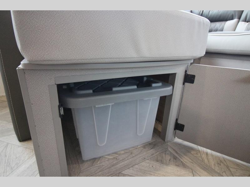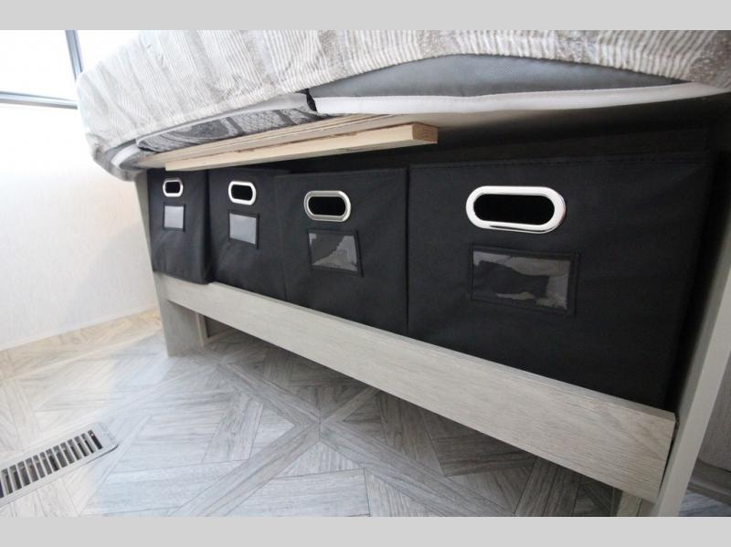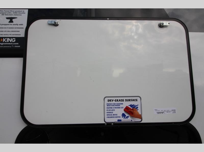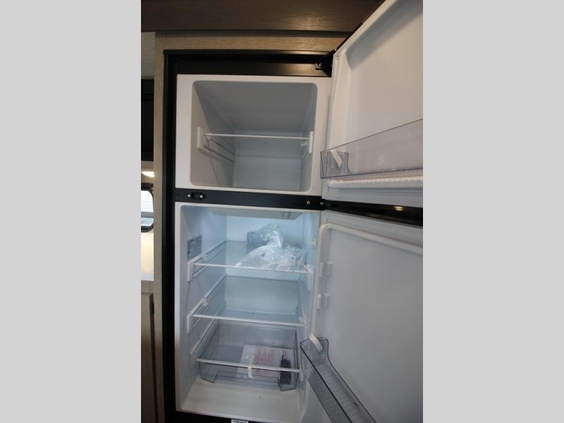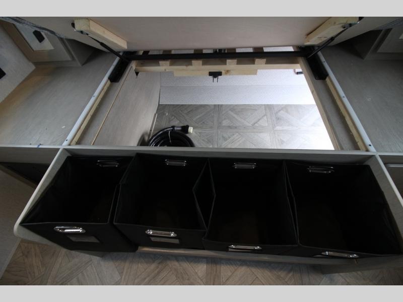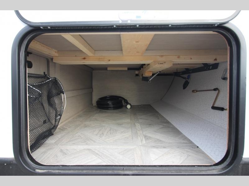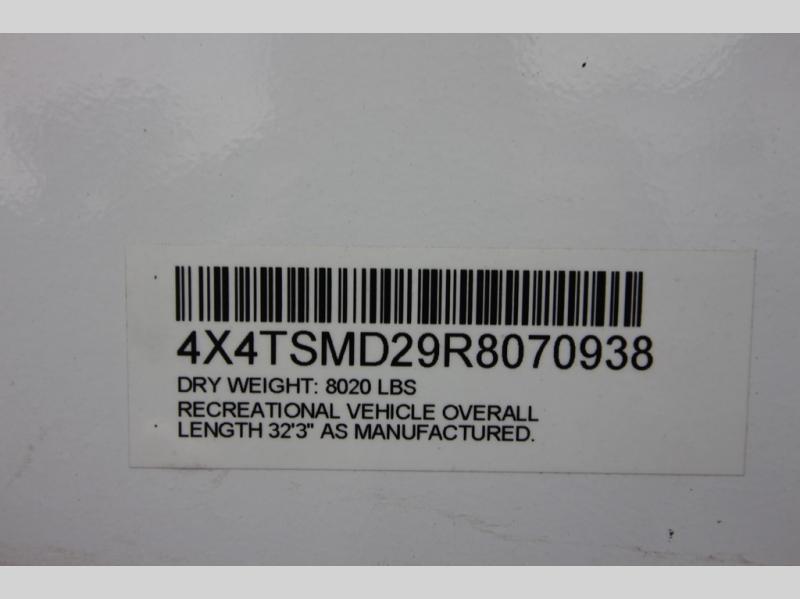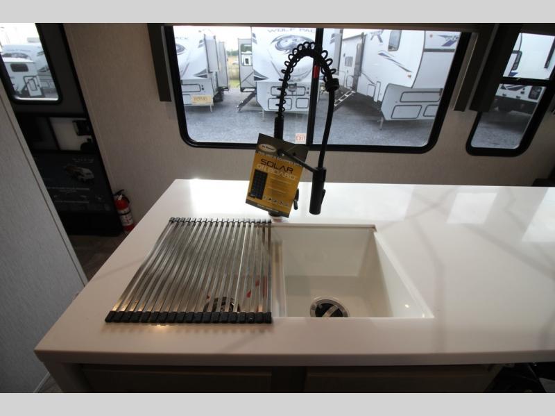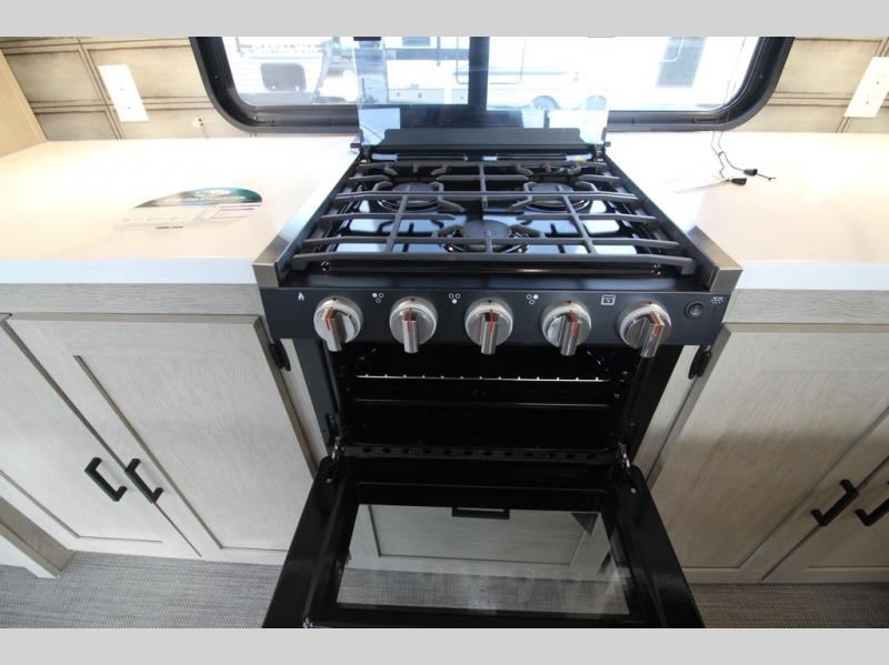 The perfect couple's coach with a view! This Salem View features a 7' kitchen island with a waterfall edge and five bar stools for dining and prep space. The island also houses a double kitchen sink for easy clean-up. Thanks to the island, you will enjoy 15 linear feet of countertop space throughout. The view will be of your choosing thanks to 95.5 square feet of windows that will easily bring the outdoors inside. A sectional sofa across the back of the unit provides ample seating to relax and enjoy a good book or the entertainment center. Behind the entertainment center, you will find hidden storage space with shelves so everything can be tucked out of sight, and an oversized refrigerator will provide enough space for your perishables while you are on vacation as well. A full bath is conveniently located near the main entry featuring StepAbove entry steps. The bath provides a walk-in shower, vanity with sink, toilet, and linen storage. In the private front bedroom, a Versa-Tilt custom king bed will allow you a relaxing and comfortable night's rest, and once again, a great view out the dual opposing windows. On the outside, a 23' awning offers additional living space protected from the elements, and a spacious pass-through storage compartment will allow you to stow away your camp chairs and outdoor equipment and games easily for transport.