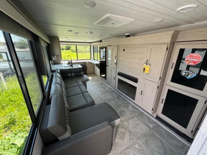 Your family of four will enjoy this Salem View bunk model featuring 105 square feet of window space for unbelievable views of your surroundings. A Versa Slide features a refrigerator, pantry, and entertainment center with a door leading to a bunk space including a set of 30" x 70" bunks with top flip-up bunk, storage cubbies for your things, and a desk with bar stool for any office work that you may need to do while you travel. All is neatly tucked away within the slide behind a shiplap featured entertainment wall with fireplace opposite the sectional sofa which is great for relaxing and entertaining family and friends indoors. The rear kitchen area offers 18 linear feet of countertop space with four bar stools, plus a three burner range and double sink. Your refrigerator and pantry will hold all of your perishables and dry goods, and those are nearby within the Versa slide. Up front, a private bedroom with Versa-Tilt custom king bed which provides 14-1/2" of additional walking around space, plus you will find a wardrobe that has been prepped for a washer and dryer if you choose to add, as well as dual nightstands beneath wardrobes on either side of the bed. A large pass-through storage compartment offers plenty of space for your outdoor gear, and if you enjoy outdoor cooking, you might want to add the outside kitchen option as well.