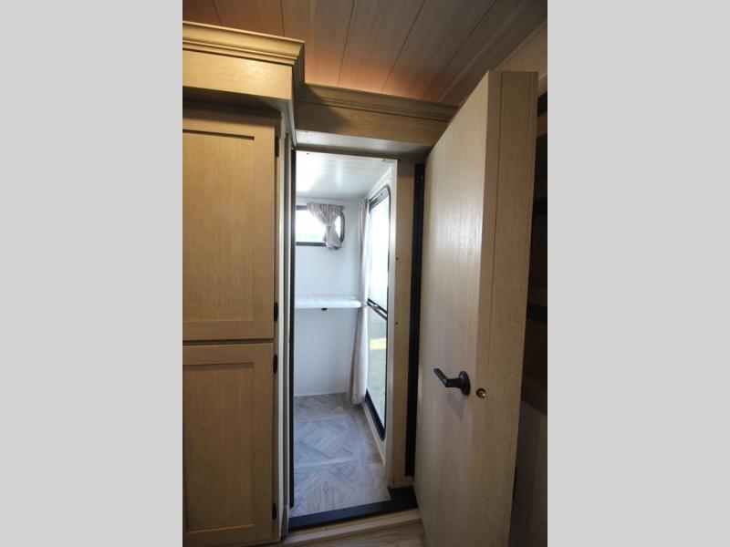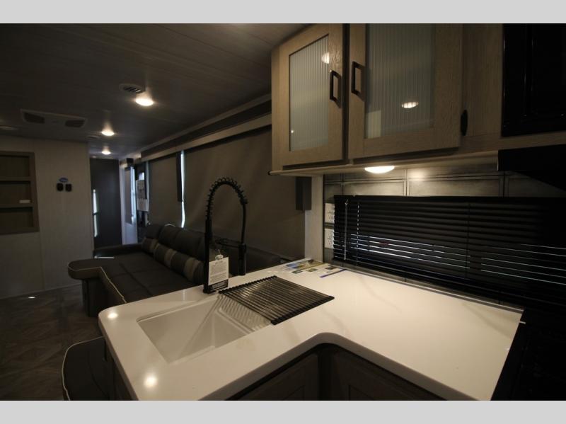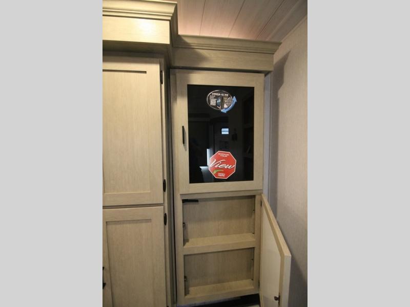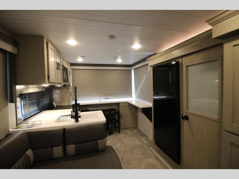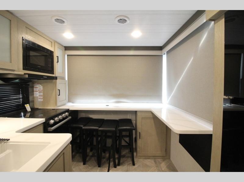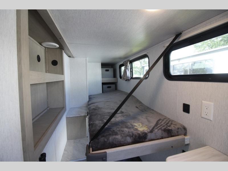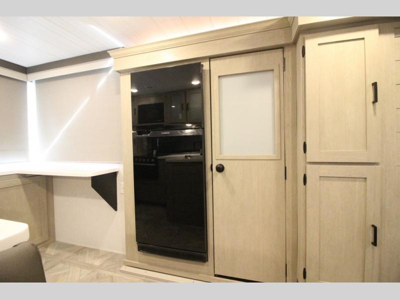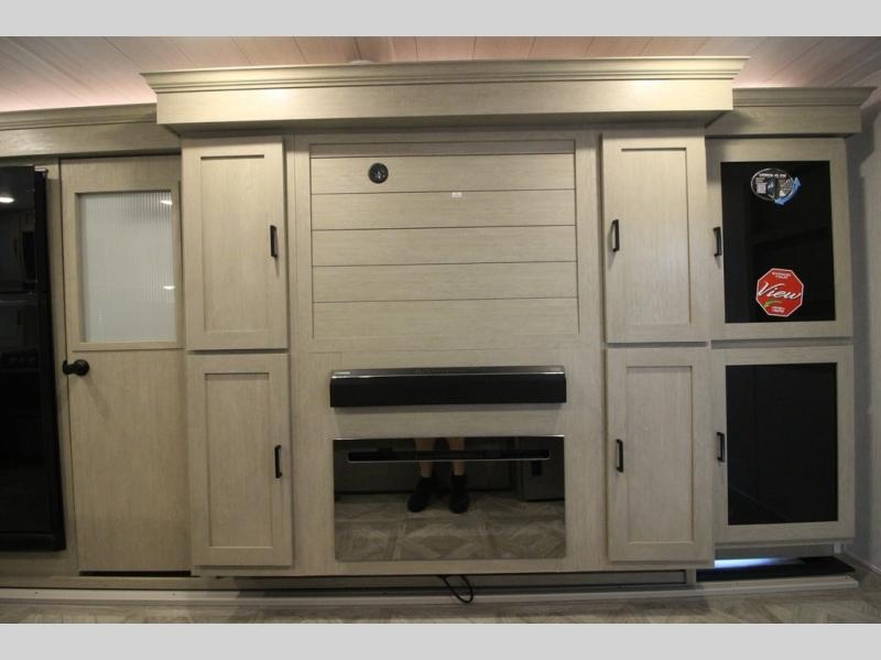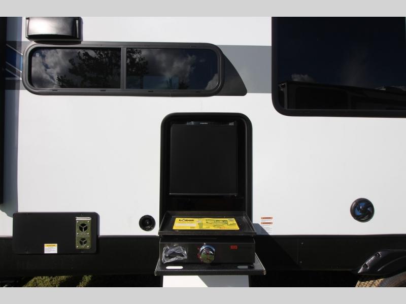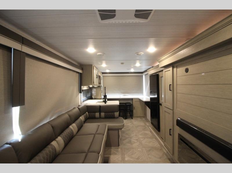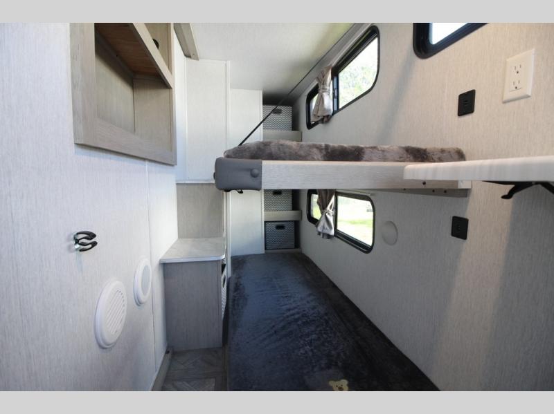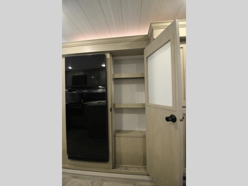 Your family of four will enjoy this Salem View bunk model featuring 105 square feet of window space for unbelievable views of your surroundings. A Versa Slide features a refrigerator, pantry, and entertainment center with a door leading to a bunk space including a set of 30" x 70" bunks with top flip-up bunk, storage cubbies for your things, and a desk with bar stool for any office work that you may need to do while you travel. All is neatly tucked away within the slide behind a shiplap featured entertainment wall with fireplace opposite the sectional sofa which is great for relaxing and entertaining family and friends indoors. The rear kitchen area offers 18 linear feet of countertop space with four bar stools, plus a three burner range and double sink. Your refrigerator and pantry will hold all of your perishables and dry goods, and those are nearby within the Versa slide. Up front, a private bedroom with Versa-Tilt custom king bed which provides 14-1/2" of additional walking around space, plus you will find a wardrobe that has been prepped for a washer and dryer if you choose to add, as well as dual nightstands beneath wardrobes on either side of the bed. A large pass-through storage compartment offers plenty of space for your outdoor gear, and if you enjoy outdoor cooking, you might want to add the outside kitchen option as well.