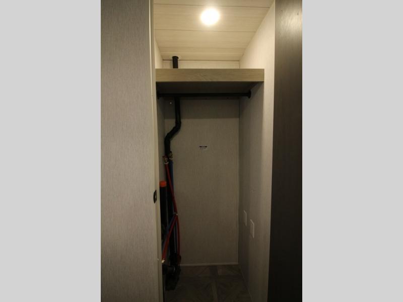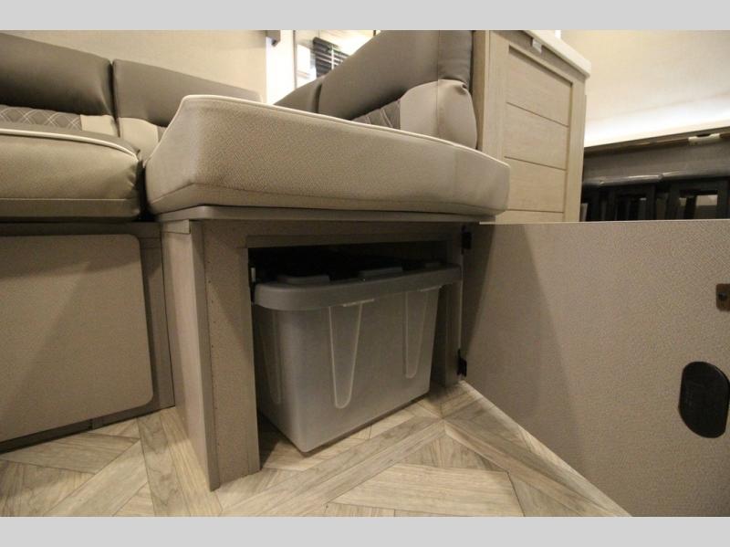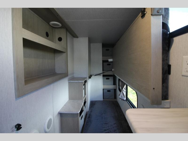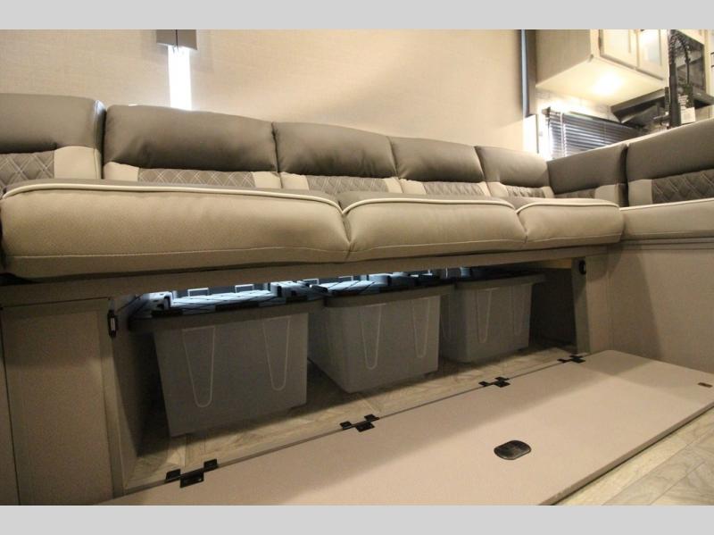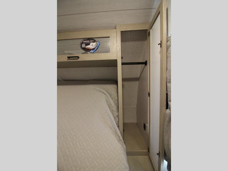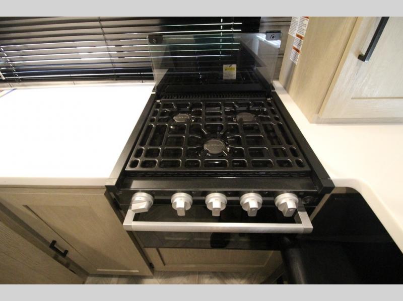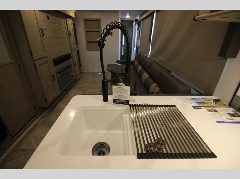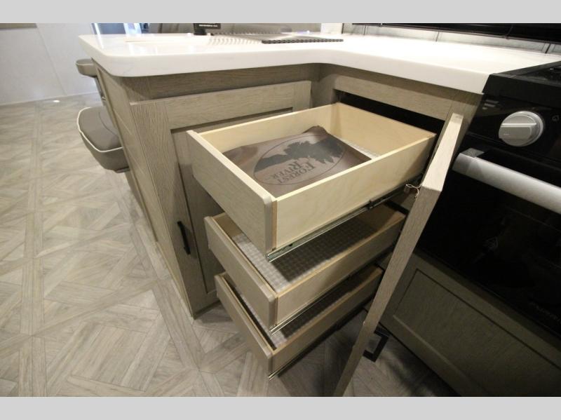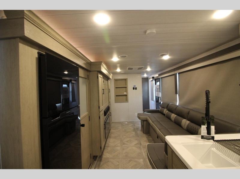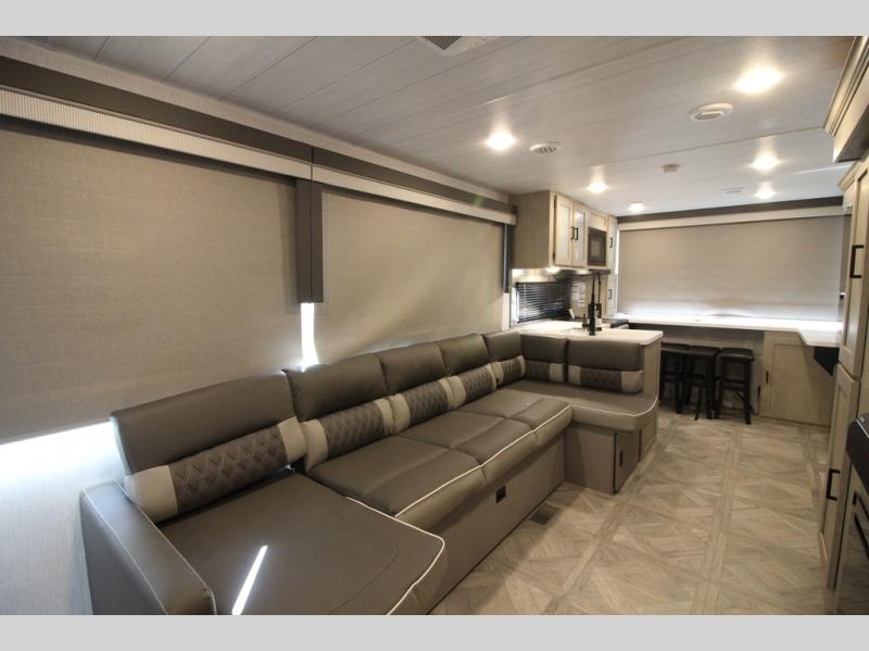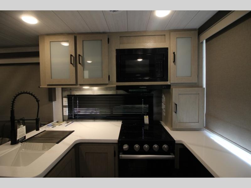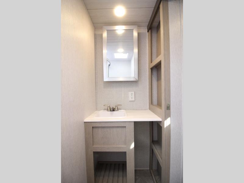 Your family of four will enjoy this Salem View bunk model featuring 105 square feet of window space for unbelievable views of your surroundings. A Versa Slide features a refrigerator, pantry, and entertainment center with a door leading to a bunk space including a set of 30" x 70" bunks with top flip-up bunk, storage cubbies for your things, and a desk with bar stool for any office work that you may need to do while you travel. All is neatly tucked away within the slide behind a shiplap featured entertainment wall with fireplace opposite the sectional sofa which is great for relaxing and entertaining family and friends indoors. The rear kitchen area offers 18 linear feet of countertop space with four bar stools, plus a three burner range and double sink. Your refrigerator and pantry will hold all of your perishables and dry goods, and those are nearby within the Versa slide. Up front, a private bedroom with Versa-Tilt custom king bed which provides 14-1/2" of additional walking around space, plus you will find a wardrobe that has been prepped for a washer and dryer if you choose to add, as well as dual nightstands beneath wardrobes on either side of the bed. A large pass-through storage compartment offers plenty of space for your outdoor gear, and if you enjoy outdoor cooking, you might want to add the outside kitchen option as well.