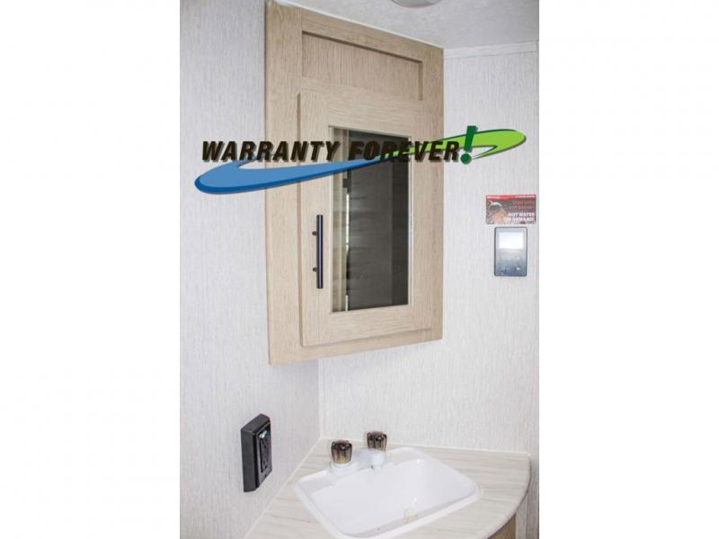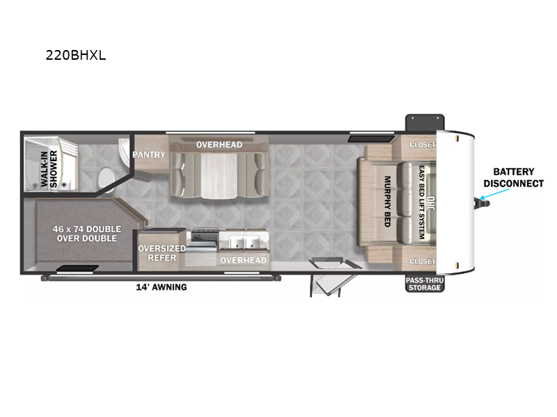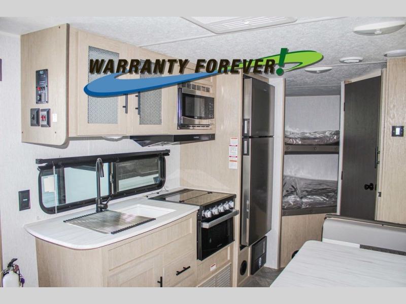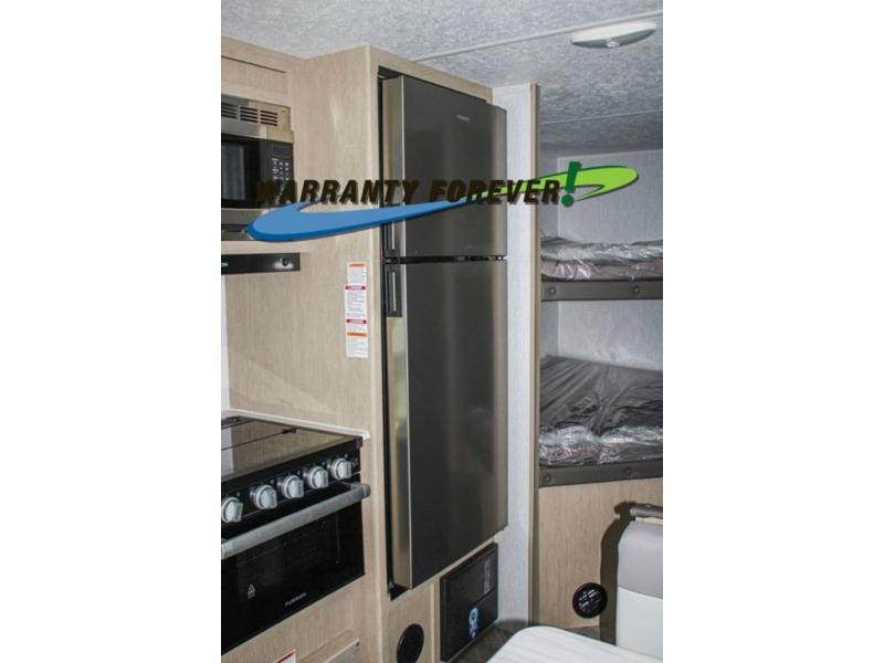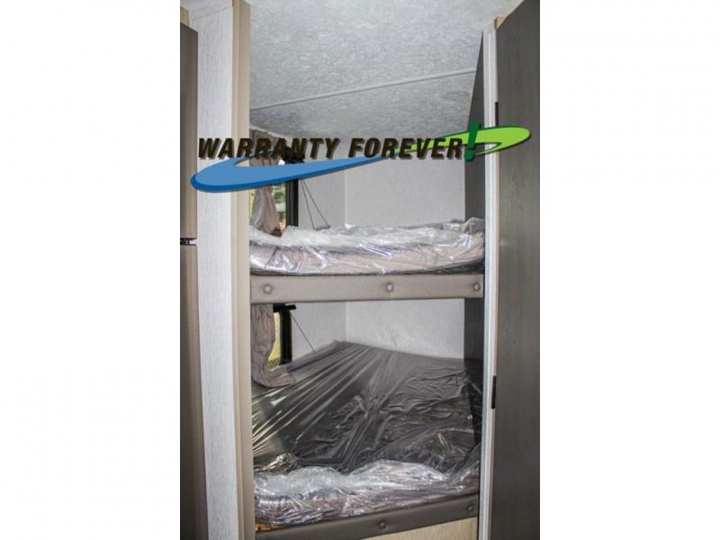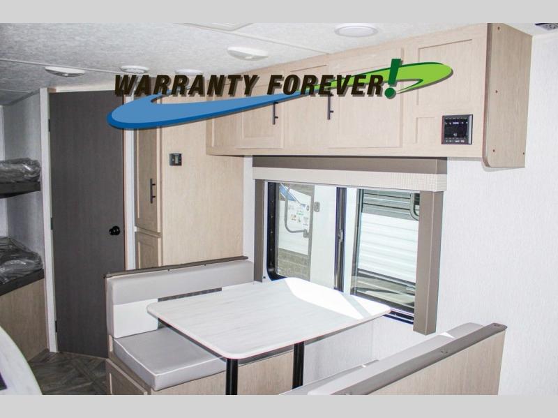 The whole gang can head to the campsite with this travel trailer! The kiddos can sleep on the corner double-size bunks and you can sleep on the front Murphy bed which can transform into a sofa for seating space during the day. You can also transform the booth dinette into an extra sleeping space when you're not using it to enjoy a meal that you made with the three burner cooktop. If there happens to be any leftovers, you can easily store them in the 6 cu. ft. gas/electric refrigerator. Everyone can start and end their days feeling clean and fresh with the rear corner bathroom that has a walk-in shower, and you can also bring your favorite outdoor camping gear and store it in the front outside storage area!