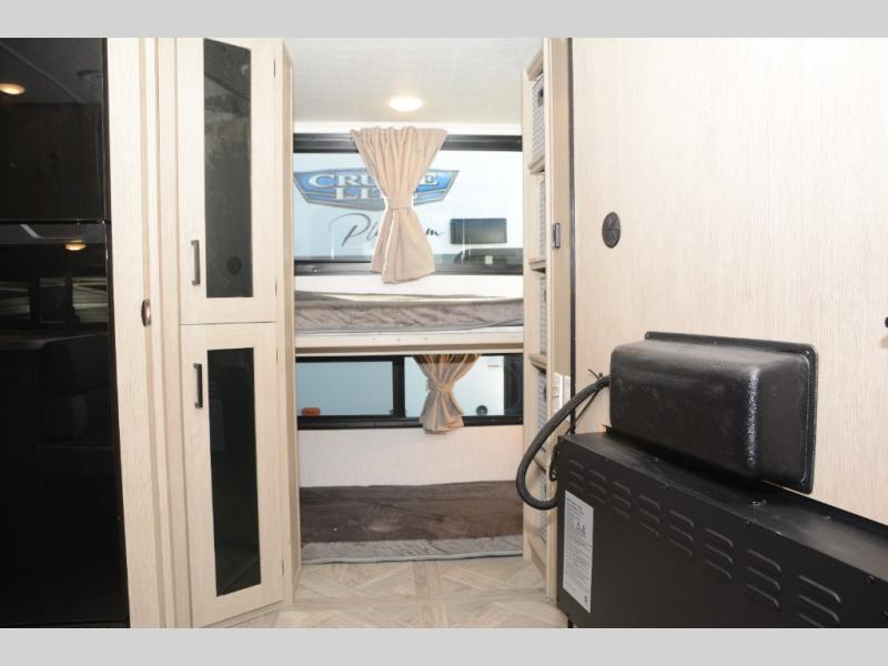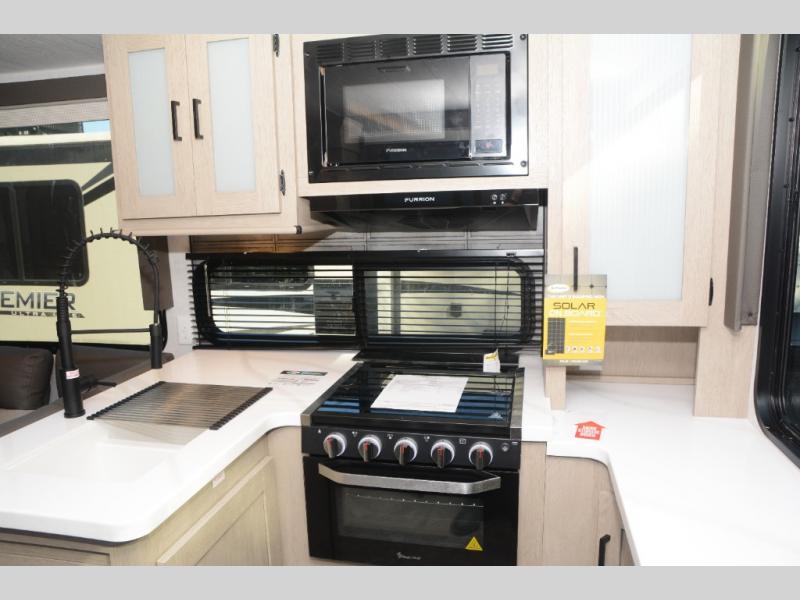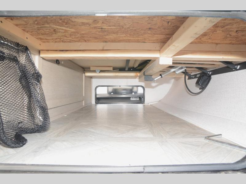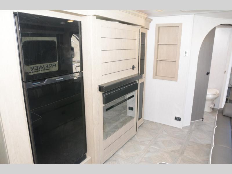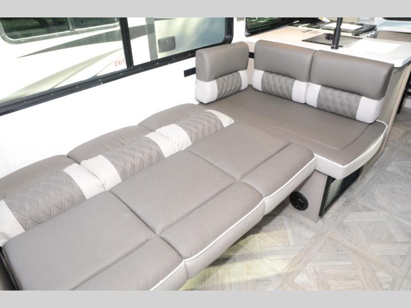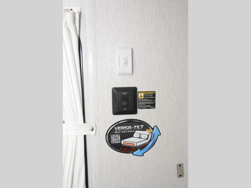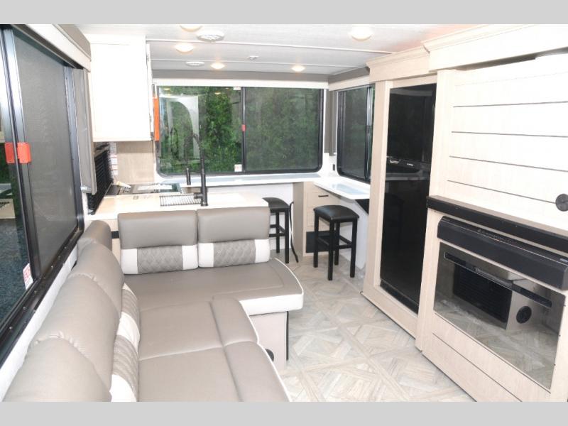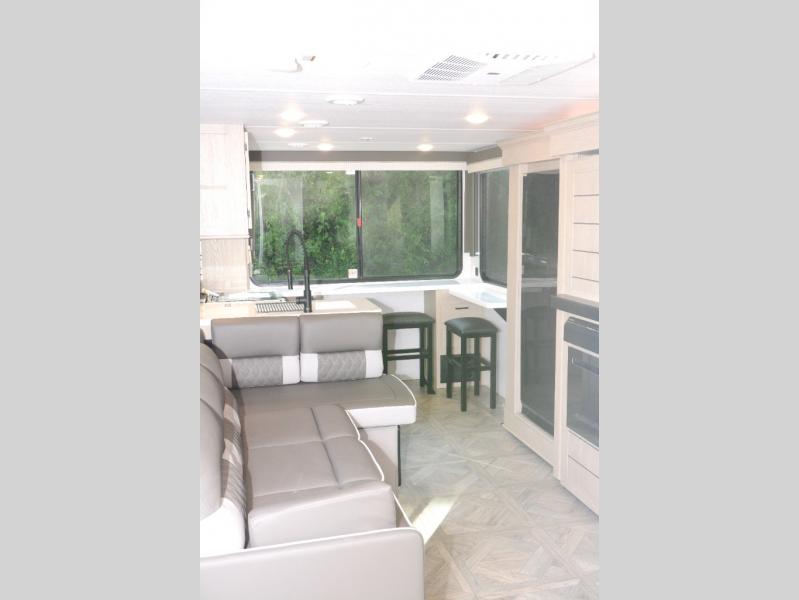 Enjoy your surroundings with 64 square feet of windows! So, no matter where you park, you can easily bring the outdoors right inside. The rear kitchen features 18 linear feet of wrap-around counter space including a double sink and three burner cook-top with an overhead microwave oven. There are bar stools for dining inside along the rear counter, and an L-shaped sofa for additional seating in the open living area. Here, behind the entertainment center, is a multi-purpose space hidden behind a shiplap wall features with fireplace including a hinged top mattress above a lower bunk, a desk beneath the mattress if you need office space during the day, and storage cubbies for your things, all within the Versa-Slide that also houses an oversized refrigerator for all of your perishables. The front private bedroom features a Versa-Tilt custom king bed with dual nightstands and closets, plus overhead storage. You will also find additional storage in a large pass-through beneath on the exterior. Choose an optional exterior outdoor kitchen if you like, and the 18' awning will be a great feature for added living space keeping you protected from rain or the suns rays on a bright and sunny day.
