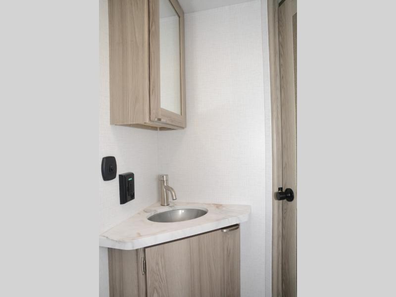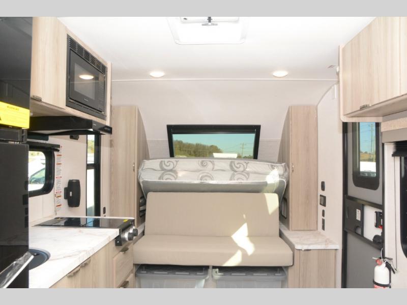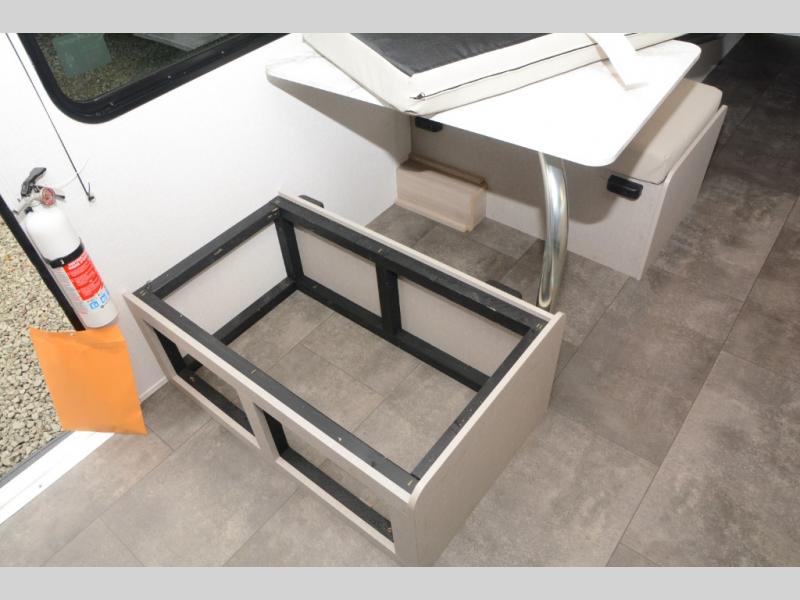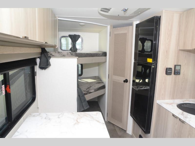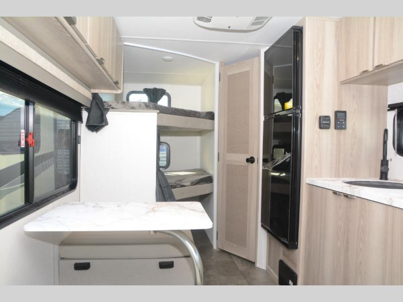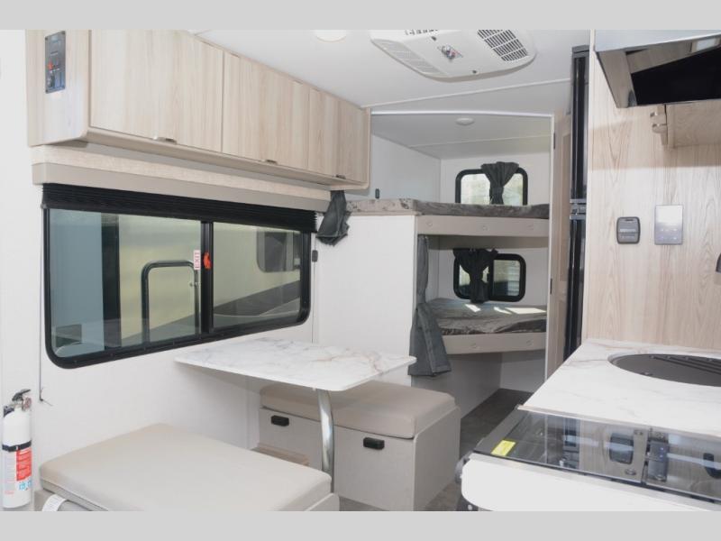 No need will go unmet with this travel trailer! It features a front Murphy bed that will double as seating and sleeping space, double-size bunk beds with storage, plus a booth dinette. You can prepare your best home cooked meals indoors with the two burner cooktop or head to the outside kitchen to fry up some burgers while breathing in some fresh air. You will also appreciate the outside shower and the front exterior full pass-through storage area for all your outdoor gear.
