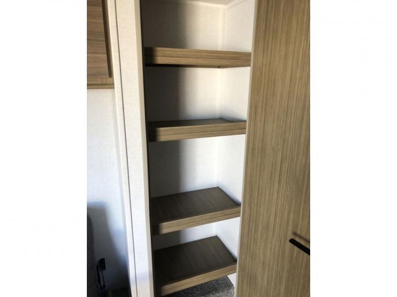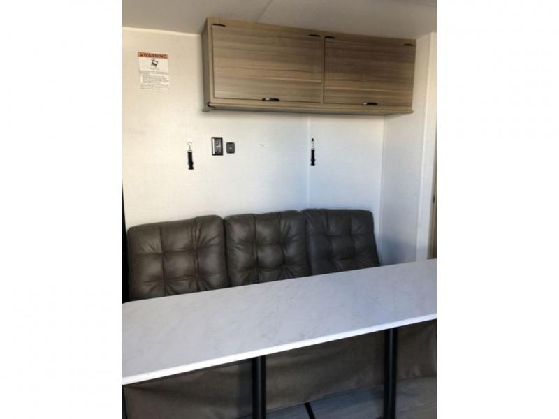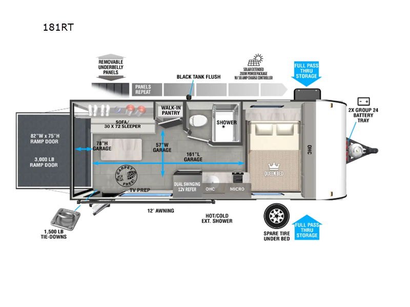 You don't have to leave your favorite off-road toys home with this toy hauler! They can easily be loaded with the 82" x 75" 3,000 lb. ramp door, and stored in the 13' 5" x 4' 9" garage space. Once you have arrived, you can set up the flip down sofa with removable table, unpack the pass-through storage, and grab a snack from the walk-in pantry. The private bathroom has a shower to freshen up in each morning. Prepare your best meals with the two burner cooktop and store any leftovers in the refrigerator. Get a good night's rest on the front queen bed, and store your belongings in the overhead cabinet.