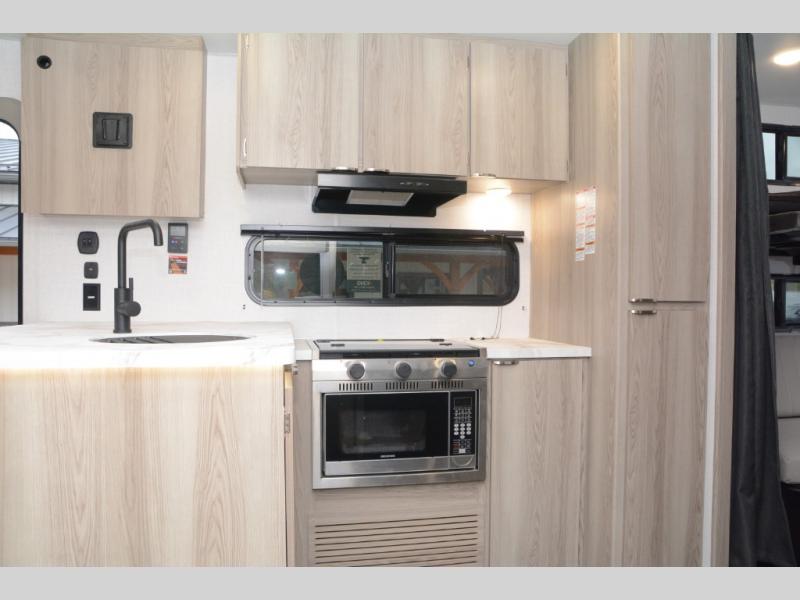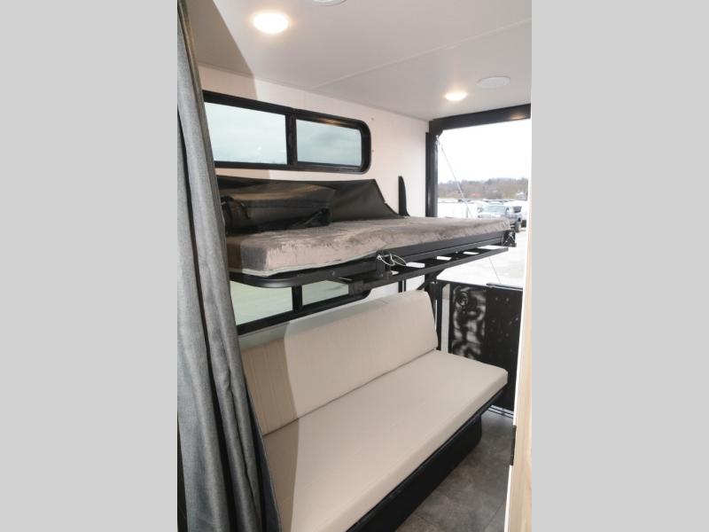 Pack your bags and load up your toys in this versatile toy hauler. After your toys are unloaded from the 7' garage, head inside to relax on the tri-fold sofa with a queen bed, or on the front sofa that can fold down to a Murphy bed. There are dual wardrobes to keep your clothes tidy, a pantry for dry goods, plus a full pass-through storage so nothing gets left at home. Prepare your meals with the 3-in-1 cooker with a convection microwave and three burner cooktop, then dine at the bar with stools, or you can cook on the outside kitchen and eat under the power awning! This model also includes solar extended 200W power package and dual Group 27 battery trays for extended camping power.