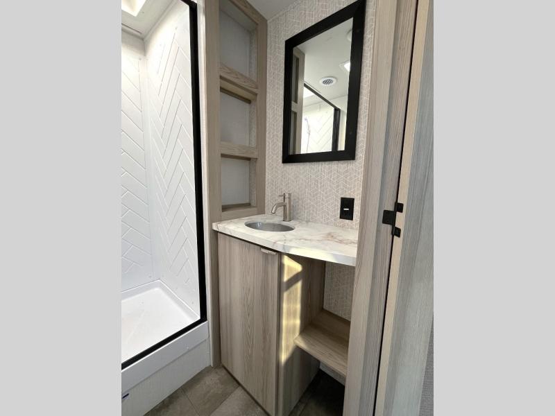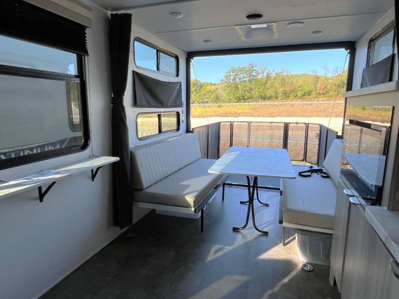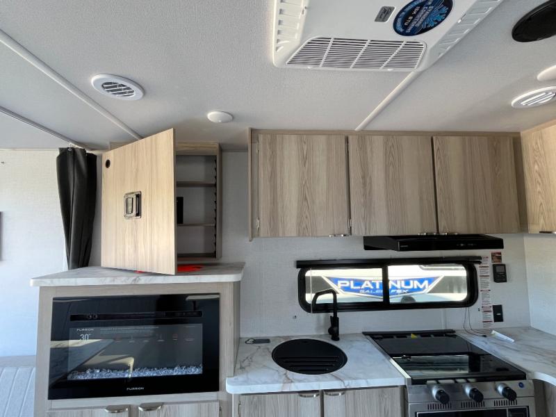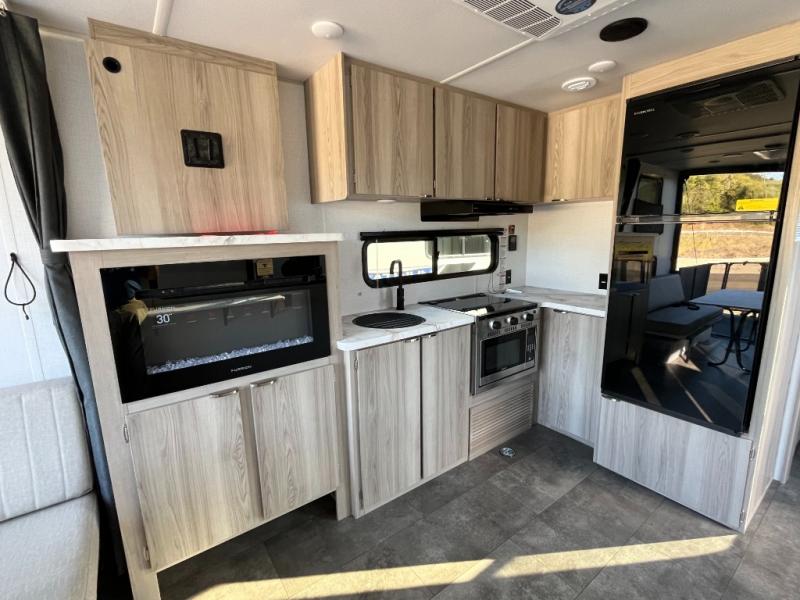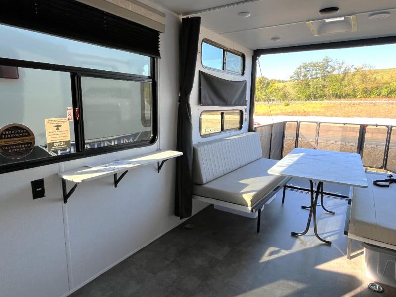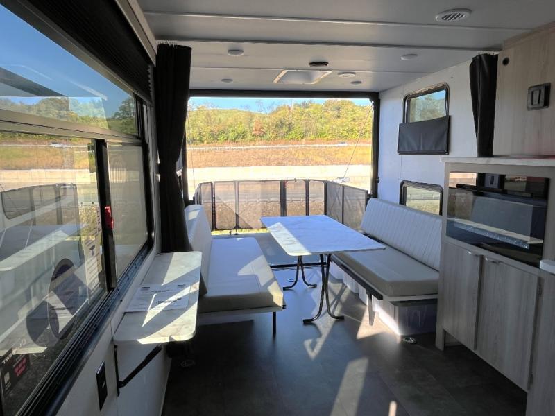 Make the most of your vacations with this Platinum version MAX toy hauler! The 14' garage area includes dual sofa sleepers with a table in between to dine at, plus a 3,000 lb. ramp door for easy unloading. Enjoy the fireplace for a cozy evening indoors while your dinner is cooking on the three burner cooktop or being heated up in the microwave. After a fun day of trail riding, you can clean the mud out of your hair with the 30" x 36" shower with a skylight in the full bathroom. The front private bedroom has a queen bed to lay your head on at night, shoe storage under the bed, a walk-in closet, and wardrobes on either side of the bed for even more clothing storage space.
