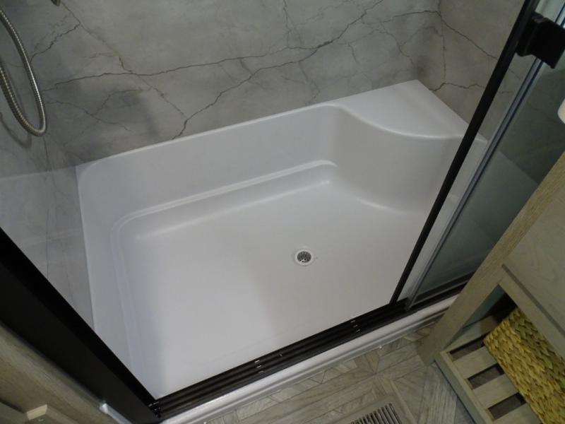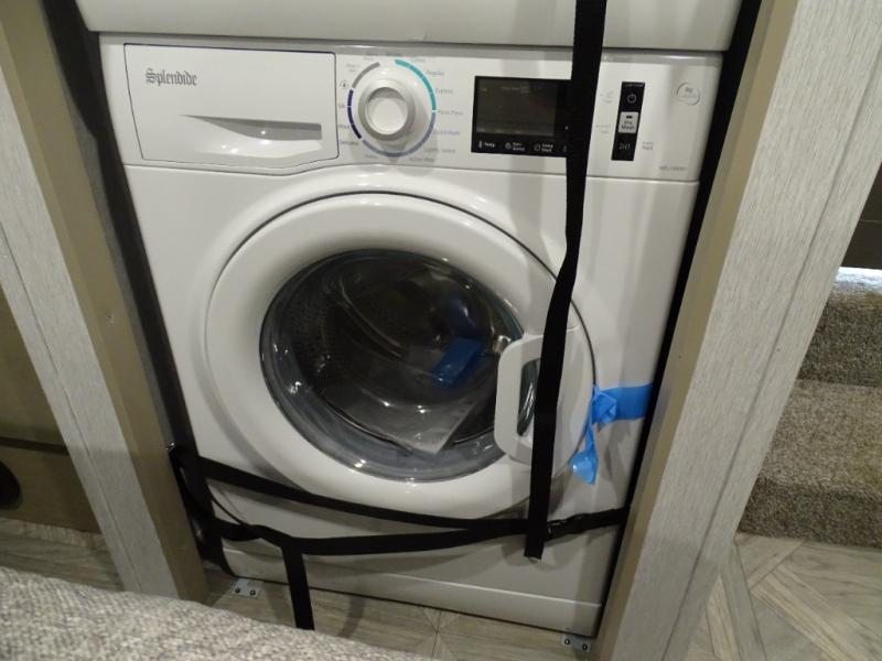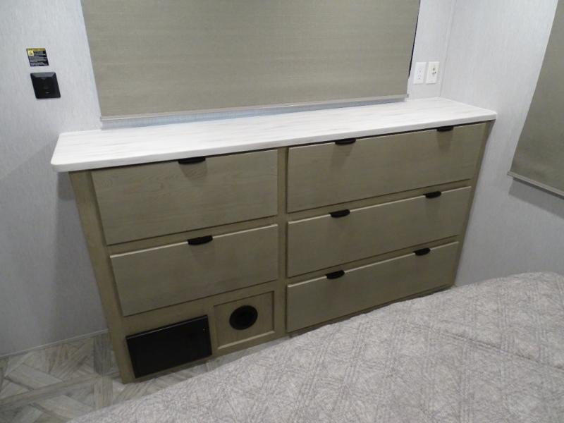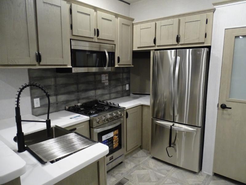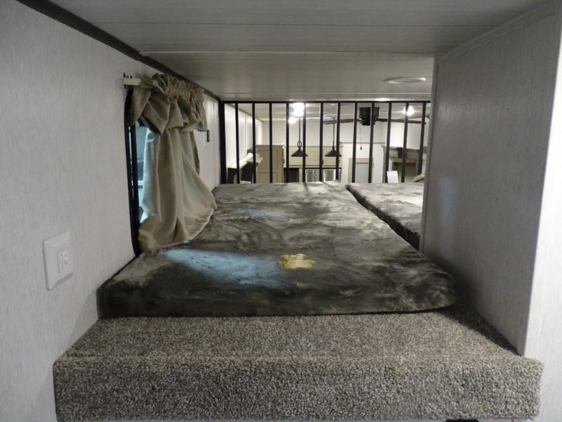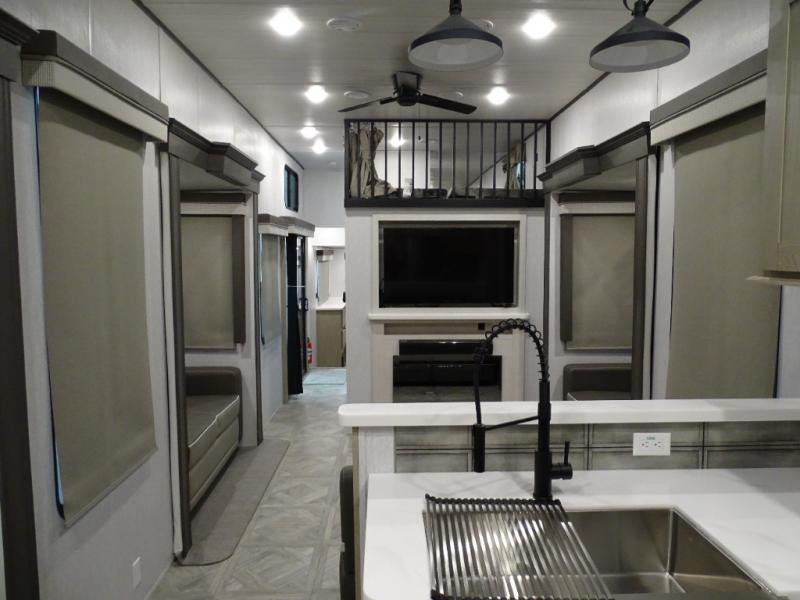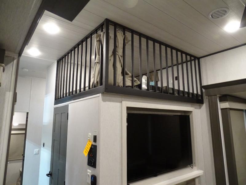 This destination trailer is truly exceptional with its large front kitchen that comes with residential appliances, lots of cabinet and pantry space, and even a free standing dinette so others can play games nearby while you cook! The living area has two opposing sofa slides and theater seating across from the entertainment center with a built-in electric fireplace for a relaxing evening indoors. With a 50" walk-in shower including a seat in the full bathroom, everyone is sure to stay clean. The rear private bedroom not only features a king bed slide with versa-tilt and a closet with a washer/dryer, but also has a double loft above it with four bunk mats in total!