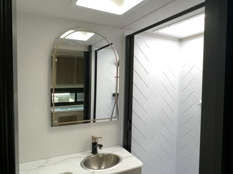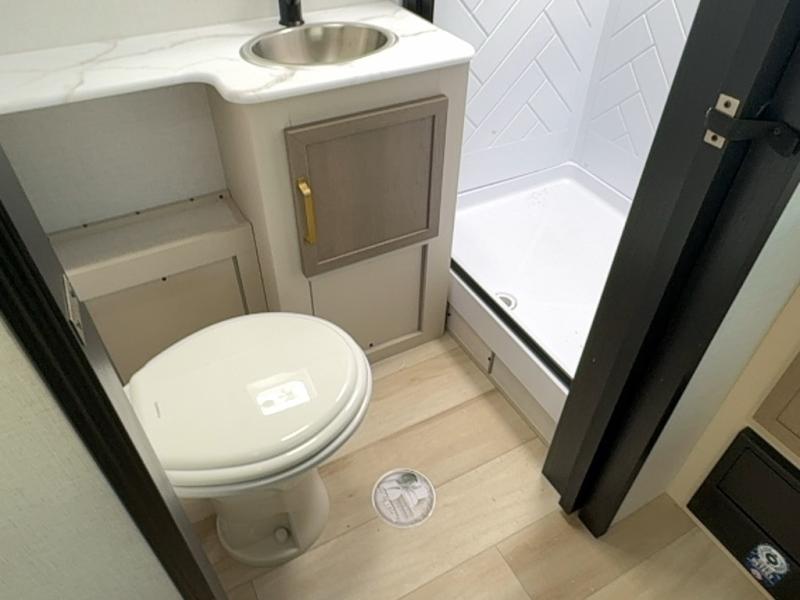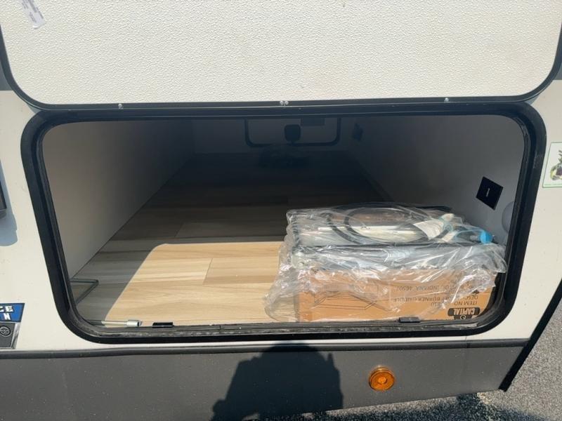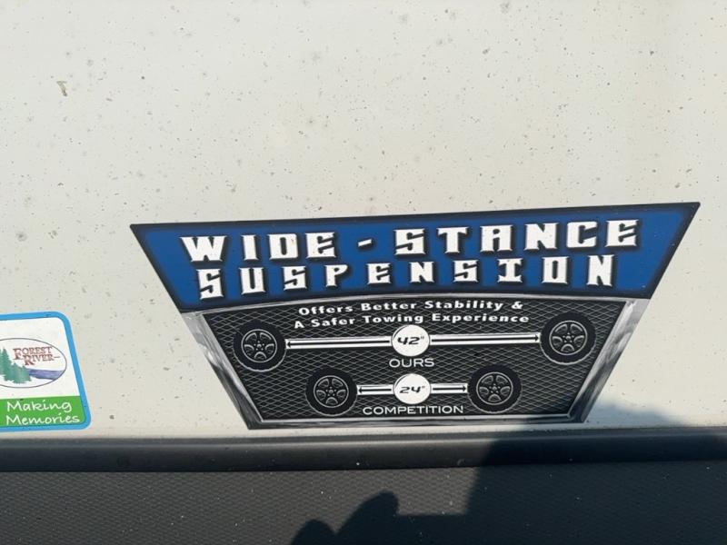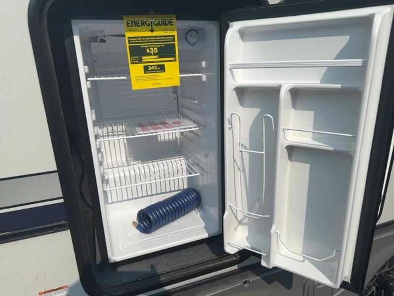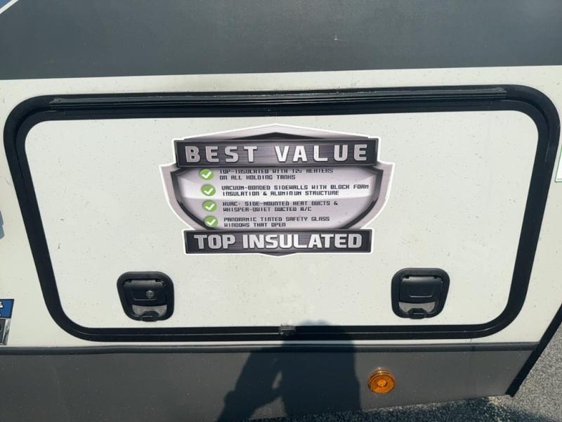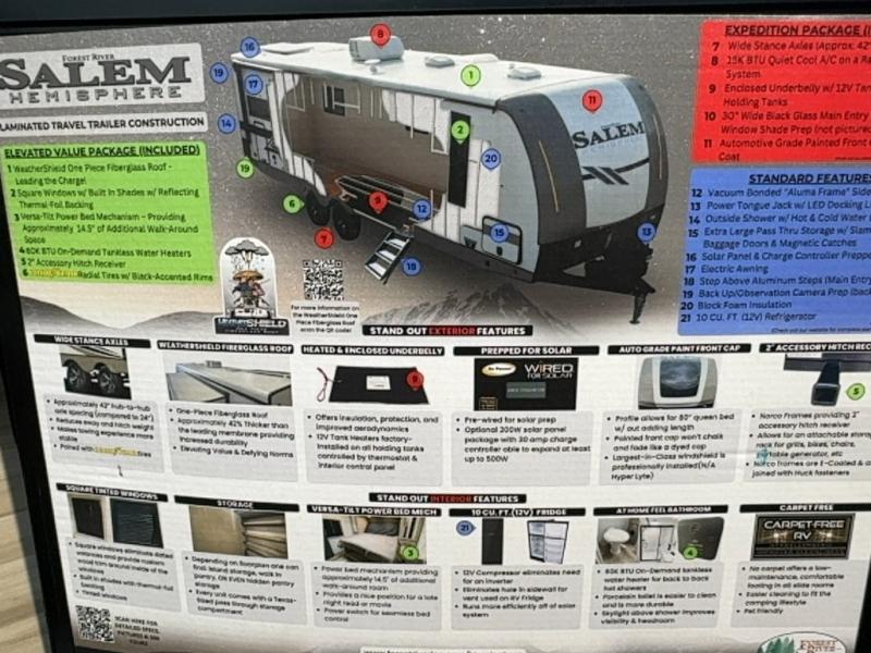 With any Salem Hemisphere Hyper-Lyte travel trailer by Forest River, you will appreciate a wide stance axle and Goodyear radial tires for smooth towing, plus vacuum bonded "Aluma Frame" sidewalls and floor for added durability. There are also square windows with built-in shades with reflecting thermal-foil backing and painted hardwood trim to help keep your trailer cool during the summer. The 2" accessory hitch receiver will allow you to bring along more camp gear and the tankless water heater is a feature you won't want to camp without! Nordic Marble countertops throughout and corresponding Frozen Nordic backsplash will give your space a more modern look, and the LED TV and Furrion soundbar will wash away rainy day blues. Outside, your furry friend will be happy with the shaded pet tether and security hook, and there is even an outside shower with hot and cold water to fill the dogs water bowl and wash off hiking boots!