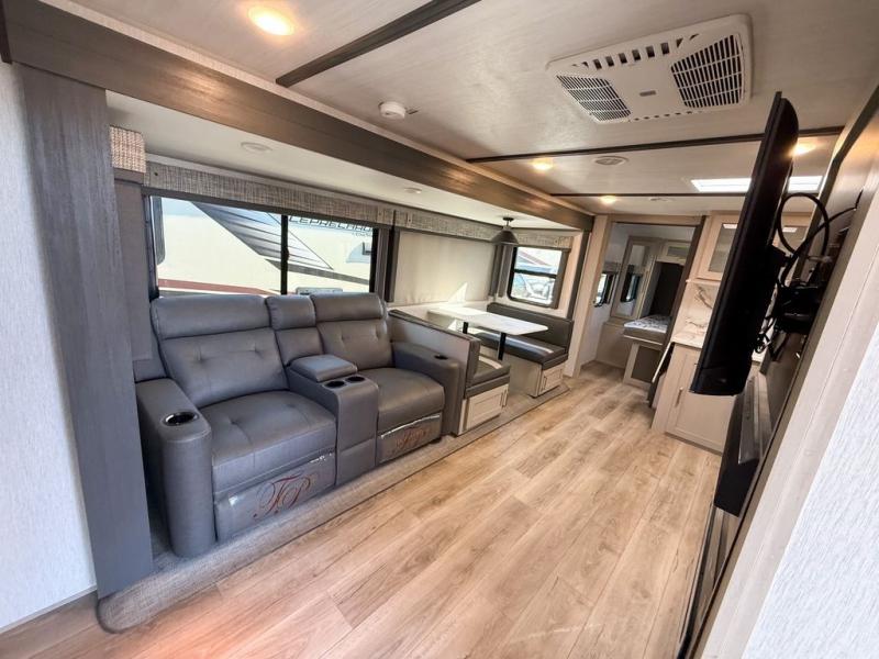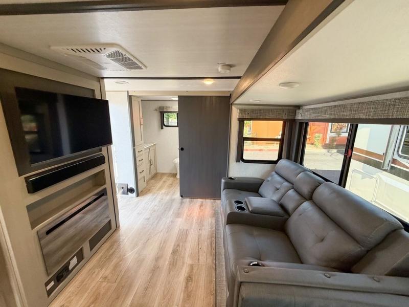 Once you step inside this spacious Salem Hemisphere Hyper-Lyte travel trailer, you'll want to take it out every other weekend for fun with your friends or family! The large slide out opens up the living and kitchen area and allows everyone to move around freely. The chef of the family can prepare dinner on the three-burner range, and they'll love having hidden storage behind the entertainment center for canned goods, snacks, and more. After a day at the lake, get cleaned up in the full rear bath before heading to the living area to relax on the theater seating while you watch a show on the 40" LED TV with a fireplace below. This trailer includes a front private bedroom with a queen bed with Versa-Tilt and space to walk around the bed. You can easily store all your hiking gear in the Texas sized pass-through storage, and cold drinks can go in the outdoor refrigerator!
