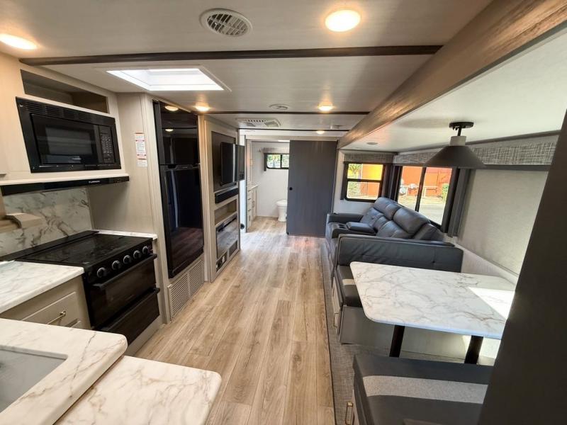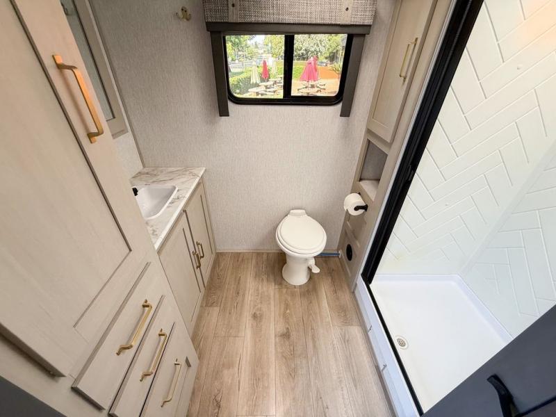 With any Salem Hemisphere Hyper-Lyte travel trailer by Forest River, you will appreciate a wide stance axle and Goodyear radial tires for smooth towing, plus vacuum bonded "Aluma Frame" sidewalls and floor for added durability. There are also square windows with built-in shades with reflecting thermal-foil backing and painted hardwood trim to help keep your trailer cool during the summer. The 2" accessory hitch receiver will allow you to bring along more camp gear and the tankless water heater is a feature you won't want to camp without! Nordic Marble countertops throughout and corresponding Frozen Nordic backsplash will give your space a more modern look, and the LED TV and Furrion soundbar will wash away rainy day blues. Outside, your furry friend will be happy with the shaded pet tether and security hook, and there is even an outside shower with hot and cold water to fill the dogs water bowl and wash off hiking boots!