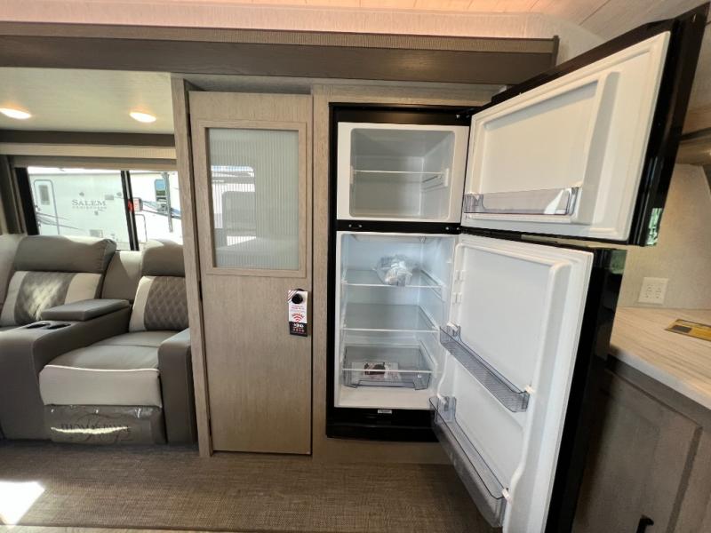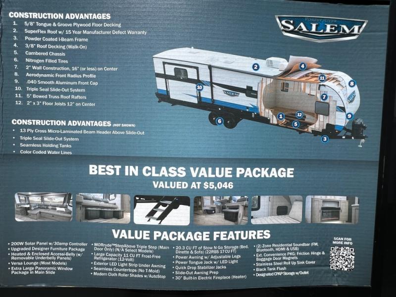 Enjoy years and years of memories with any one of these Forest River Salem travel trailers! They are built with a Dicor PVC roof membrane, a powder coated I-beam frame, and an aerodynamic front radius profile for an easier tow. The triple seal slide out system prevents water from seeping inside and keeps it outside where it belongs. The Best In Class Value Package includes upgraded designer furniture, seamless countertops with no T-mold, and two zone residential soundbars with FM, Bluetooth, HDMI and USB. You will also appreciate the heated and enclosed Accessi-Belly with removable underbelly panels, the power tongue jack with an LED light, and the designated CPAP storage. Some new upgraded features include: a Versa-Tilt bed, a 60K tankless water heater, upgraded showerhead, and so much more!