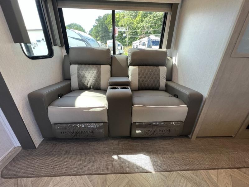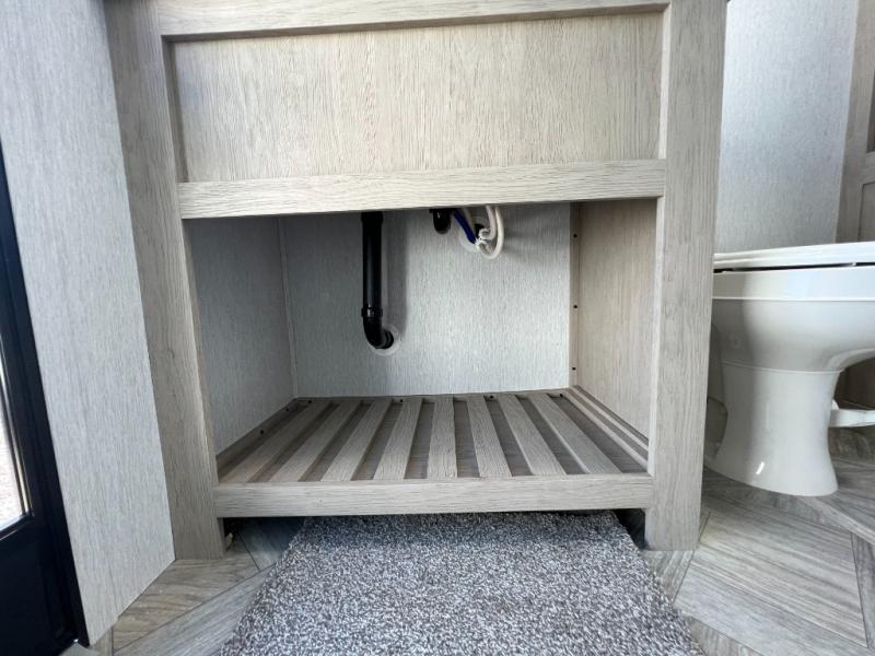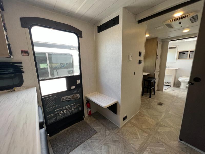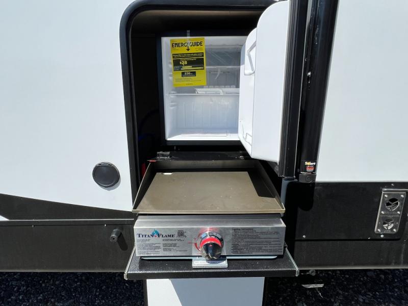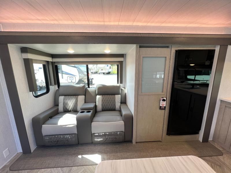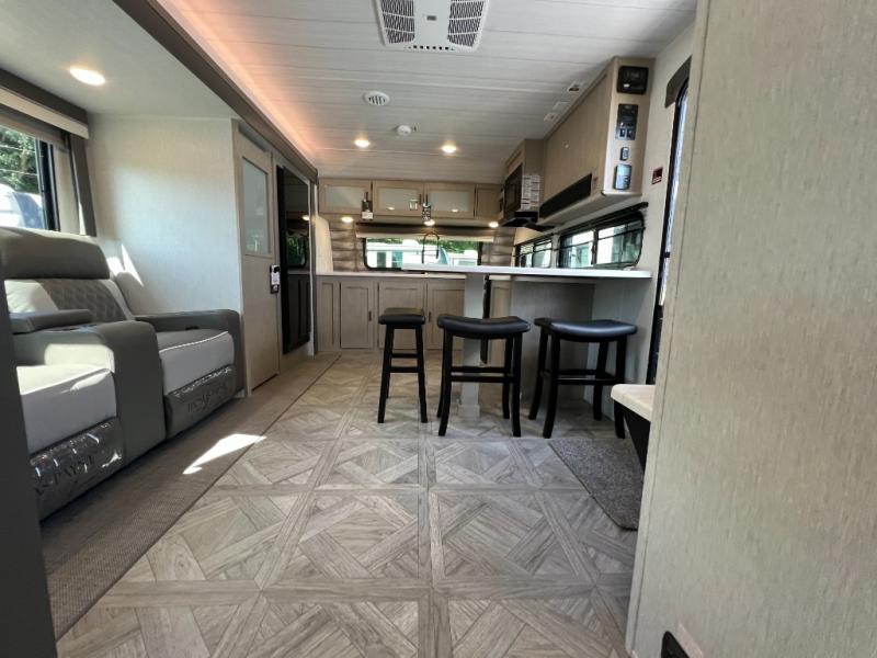 You will fall in love with this travel trailer as soon as you walk through the door! One of the dual entry doors leads directly into the front kitchen and living area which has theater seating, four bar stools to enjoy meals at the countertop, plus a bench right at the entrance to make putting your shoes on easier. Inside the master suite there is a Versa-Tilt custom king bed slide across from a dresser with TV prep above, a washer and dryer prep option, and access to the full rear bathroom. You will find a walk-in shower to freshen up in each morning, recessed storage, and the second entrance/exit door to the unit. You even have an exterior camp kitchen to prepare meals outdoors, a 20' awning to protect you rain or shine, and a Versa garage for your items!