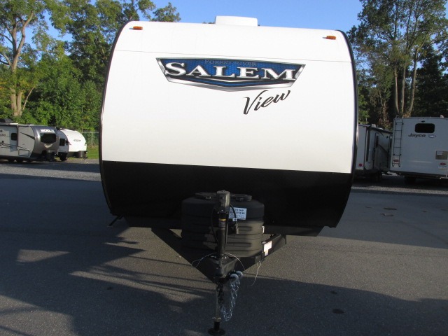 Choose any Salem View travel trailer if you are looking to bring the outdoors inside. With loads of windows you will easily be soaking up your surroundings. All models feature a cambered chassis with a 2" wall construction, 16" (or less) on center, a powder coated I-beam frame with a 3/8" walk-on roof decking and 5/8" tongue and groove plywood floor decking, plus smooth hung fiberglass exterior along with an aerodynamic front radius profile. These units feature seamless holding tanks and color coded water lines as well. The heated and enclosed underbelly allows you to camp through more seasons, and you will enjoy the power tongue jack with LED light, quick drop stabilizer jacks for easy set up, as well as a power awning with adjustable legs, and so much more!