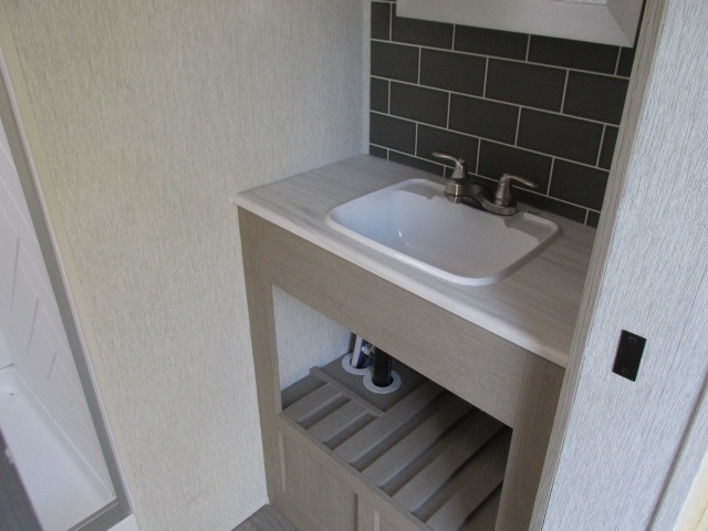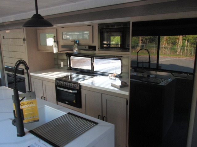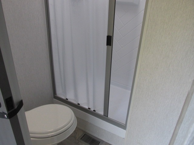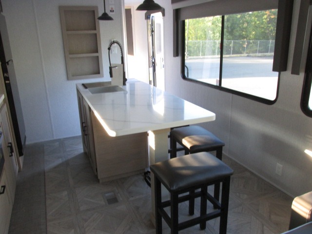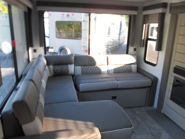 The perfect couple's coach with a view! This Salem View features a 7' kitchen island with a waterfall edge and five bar stools for dining and prep space. The island also houses a double kitchen sink for easy clean-up. Thanks to the island, you will enjoy 15 linear feet of countertop space throughout. The view will be of your choosing thanks to 95.5 square feet of windows that will easily bring the outdoors inside. A sectional sofa across the back of the unit provides ample seating to relax and enjoy a good book or the entertainment center. Behind the entertainment center, you will find hidden storage space with shelves so everything can be tucked out of sight, and an oversized refrigerator will provide enough space for your perishables while you are on vacation as well. A full bath is conveniently located near the main entry featuring StepAbove entry steps. The bath provides a walk-in shower, vanity with sink, toilet, and linen storage. In the private front bedroom, a Versa-Tilt custom king bed will allow you a relaxing and comfortable night's rest, and once again, a great view out the dual opposing windows. On the outside, a 23' awning offers additional living space protected from the elements, and a spacious pass-through storage compartment will allow you to stow away your camp chairs and outdoor equipment and games easily for transport.