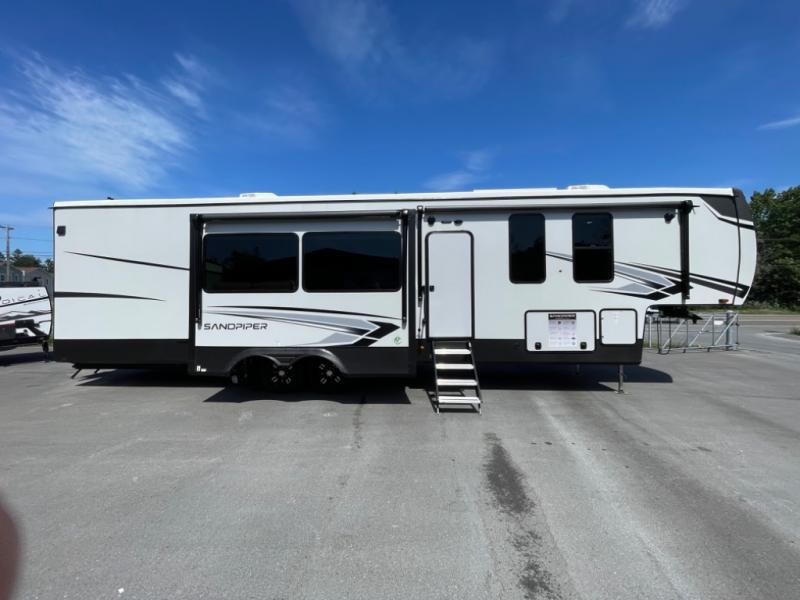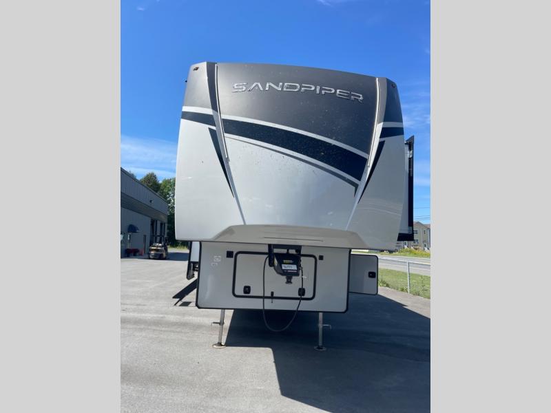 You will find the perfect balance of size, space, features, and luxury with any one of these Forest River Sandpiper fifth wheels! They are constructed with a welded aluminum framed vacuum bonded laminated superstructure, a cambered powder coated frame with rust prohibitor, and a fully enclosed underbelly to protect the units vitals during any season. The large tinted windows come with a 80/20 UV prohibitor or you can choose the optional dual pane windows. Some hassle-free amenities include a 60k BTU on-demand water heater, full coach water filter system, tire pressure monitor system, and an electric leveling system! Inside, you'll enjoy stainless steel appliances, solid surface countertops, upgraded raised panel cabinet doors, and rustic wood plank linoleum to name a few comforts!