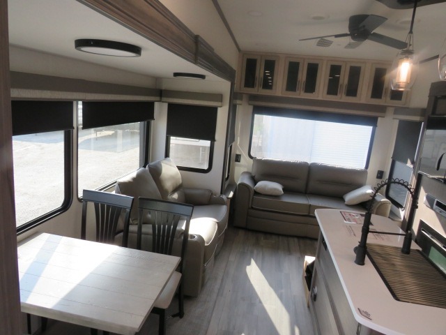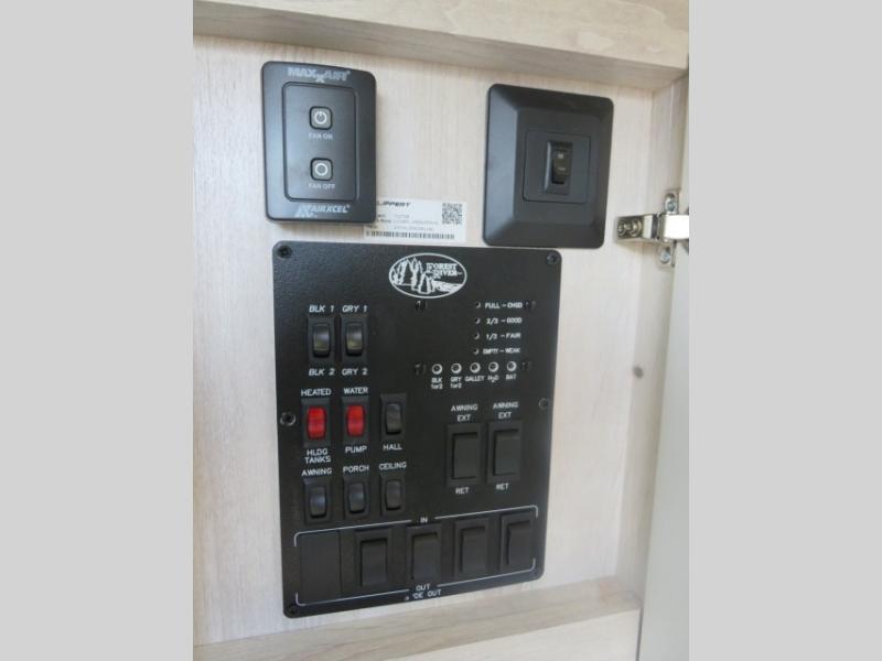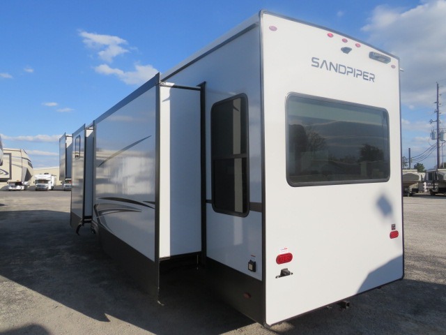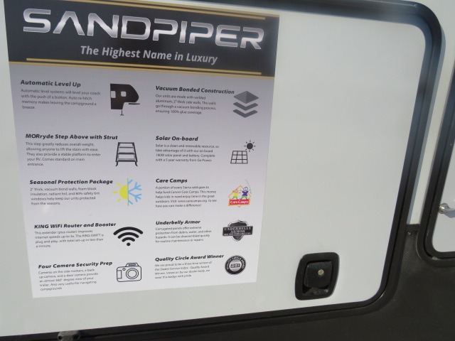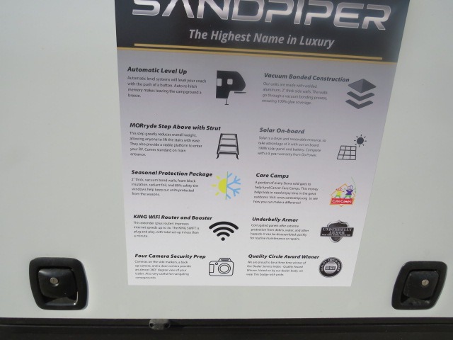 You will find the perfect balance of size, space, features, and luxury with any one of these Forest River Sandpiper fifth wheels! They are constructed with a welded aluminum framed vacuum bonded laminated superstructure, a cambered powder coated frame with rust prohibitor, and a fully enclosed underbelly to protect the units vitals during any season. The large tinted windows come with a 80/20 UV prohibitor and the unobstructed pass-through storage area is big enough to store all of your outdoor gear. You will be able to see clearly even outside at night with the porch light that has an interior switch and the electric awning with an LED light strip. The interiors are designed with modern décor, rustic wood plank linoleum, and stainless steel appliances. Don't pass up your chance to camp in true luxury, come find your model today!