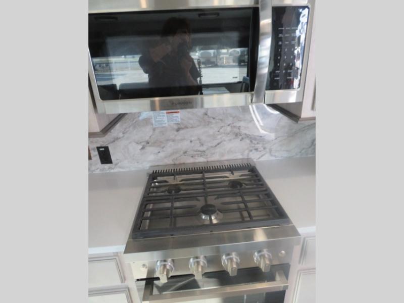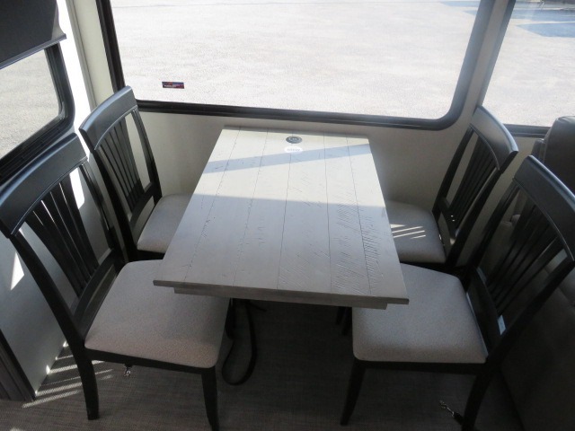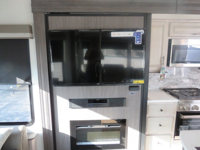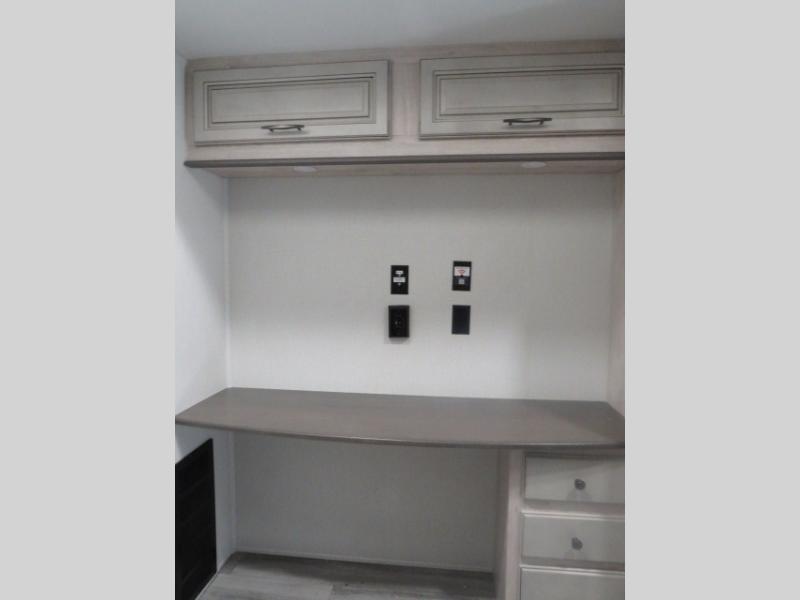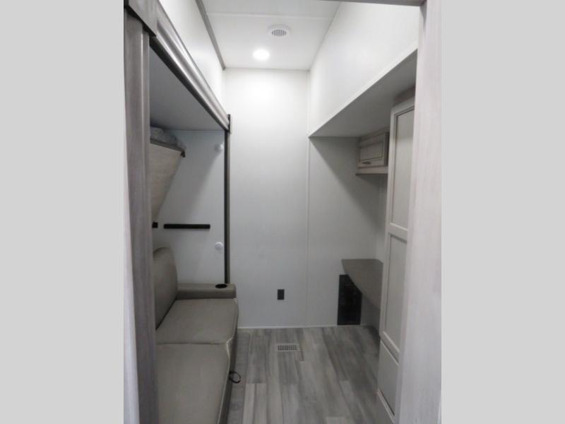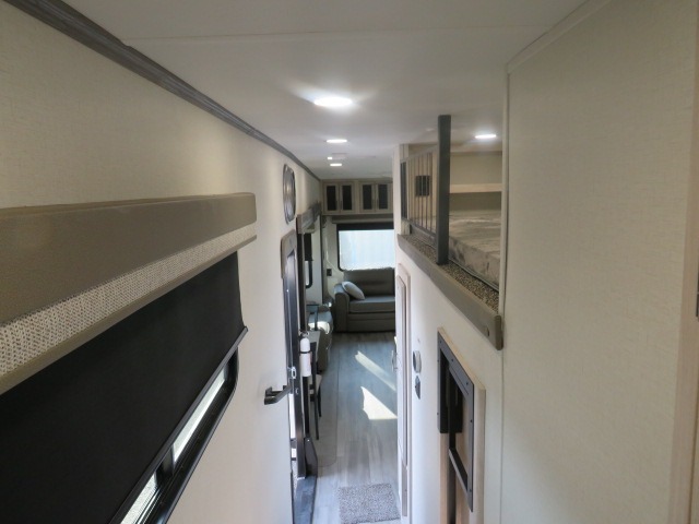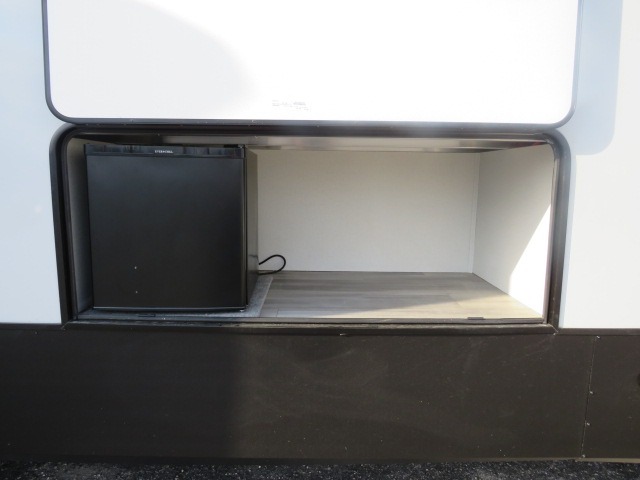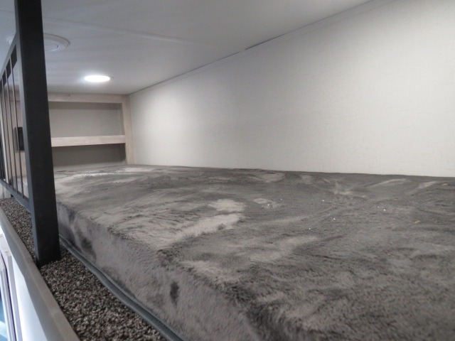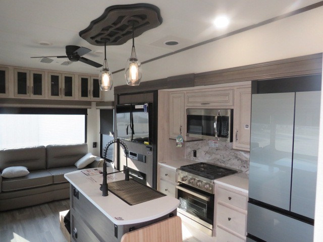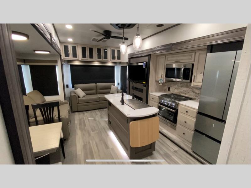 Pick your favorite camping spot and head out for relaxing weekends in this four slide out fifth wheel! You will feel at home in the front private bedroom with its king bed slide out, large front wardrobe with shelves, plus washer and dryer prep if you plan to go full-time. Your guests can make their beds in the middle bunkroom that includes a hide-a-bed sofa with a bunk above, plus a desk if you choose to make this room an office. There is even a loft above this room for more sleeping or storage space. Everyone will love to meet in the middle living area that includes a rear hide-a-bed sofa, theater seating across from the entertainment center, and a free-standing table and chairs for dining. And the chef will enjoy having a kitchen island for more prep space, along with a 17 cu. ft. 12V refrigerator and a three burner high output range with a 22" oven. Don't overlook the exterior with an outside kitchen, 20' power awning, and pass-through storage!