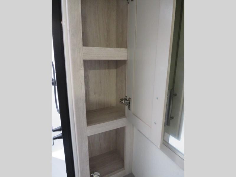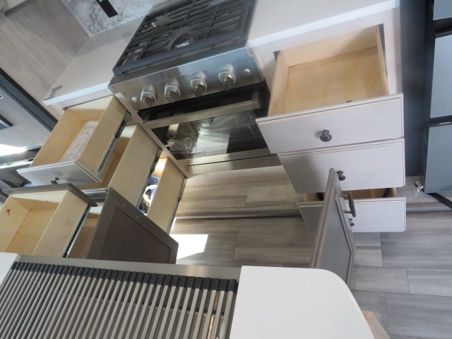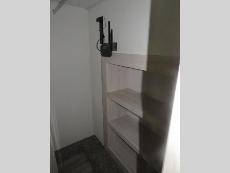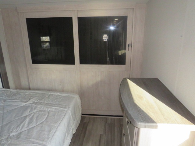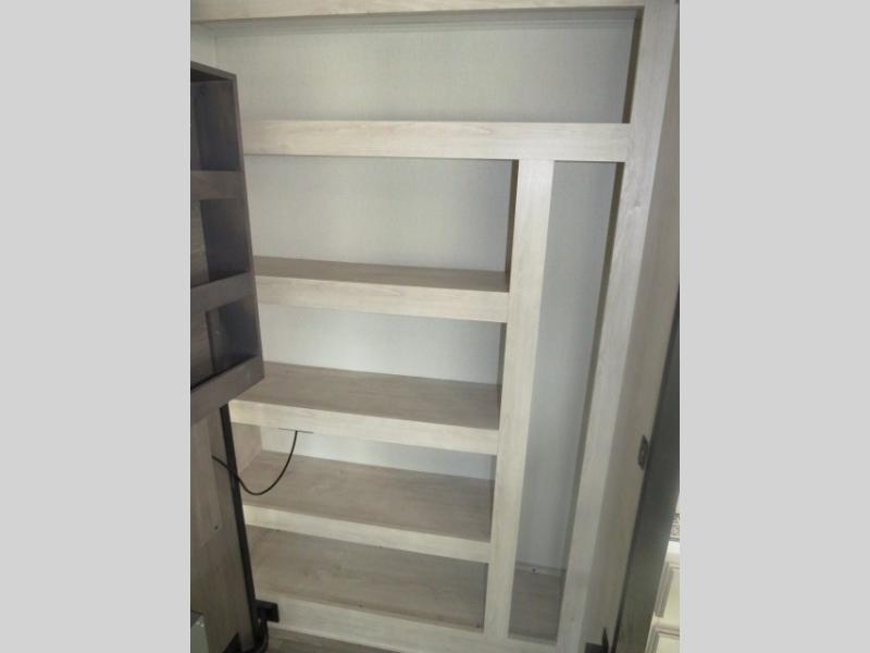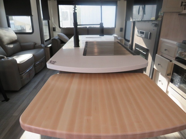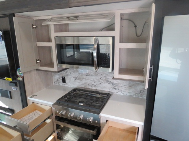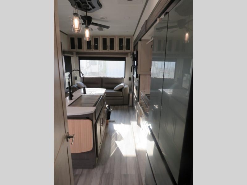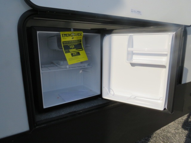 Pick your favorite camping spot and head out for relaxing weekends in this four slide out fifth wheel! You will feel at home in the front private bedroom with its king bed slide out, large front wardrobe with shelves, plus washer and dryer prep if you plan to go full-time. Your guests can make their beds in the middle bunkroom that includes a hide-a-bed sofa with a bunk above, plus a desk if you choose to make this room an office. There is even a loft above this room for more sleeping or storage space. Everyone will love to meet in the middle living area that includes a rear hide-a-bed sofa, theater seating across from the entertainment center, and a free-standing table and chairs for dining. And the chef will enjoy having a kitchen island for more prep space, along with a 17 cu. ft. 12V refrigerator and a three burner high output range with a 22" oven. Don't overlook the exterior with an outside kitchen, 20' power awning, and pass-through storage!