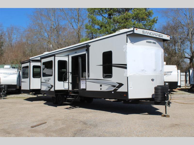 The Sandpiper Destination Trailers by Forest River are ready for extended stays at the location of your choice! The cambered powder coated frame with rust prohibitor will help extend the life of your RV and the Underbelly Armor will protect your trailer and provide better insulation. There are also gel coated color matched exterior fiberglass sidewalls outside, along with rain gutters with extra long drip spouts to prevent black streaking, and exterior speakers to listen to your favorite tunes. The Destination Package includes features to make your trips hassle-free, like the two 15,000 BTU A/C units, detachable hitch, and on-demand water heater. A commercial style kitchen faucet and designer backsplash is included with the Extended Stay Package, as well as a full coach water filter system, solid surface countertops, and a stainless steel apron sink with a strainer to name a few comforts. Available options include a central vacuum system, stabilizer jacks, plus dual pane windows and a 40K BTU furnace!
