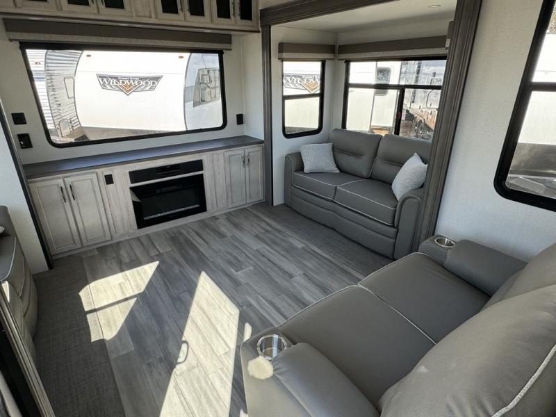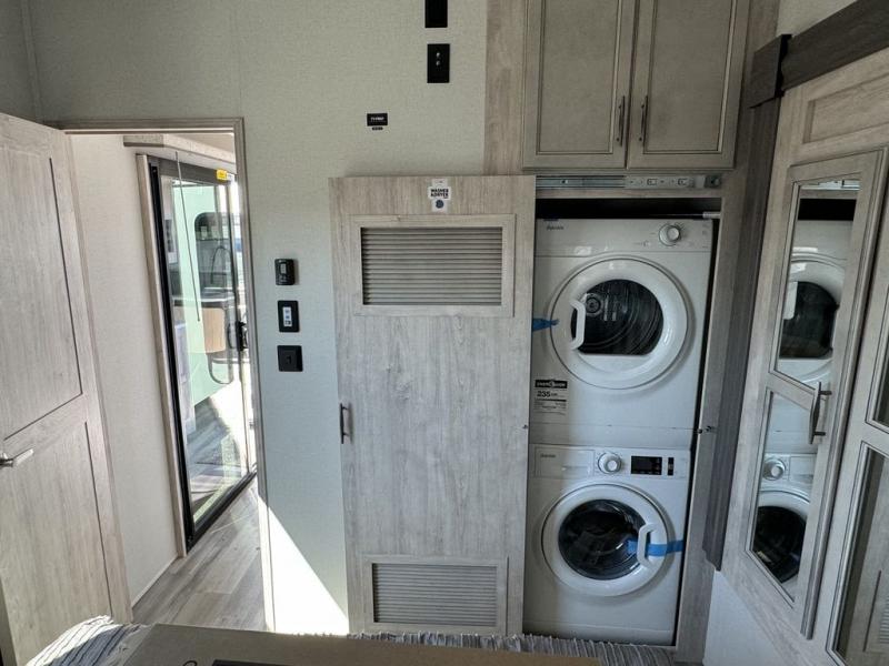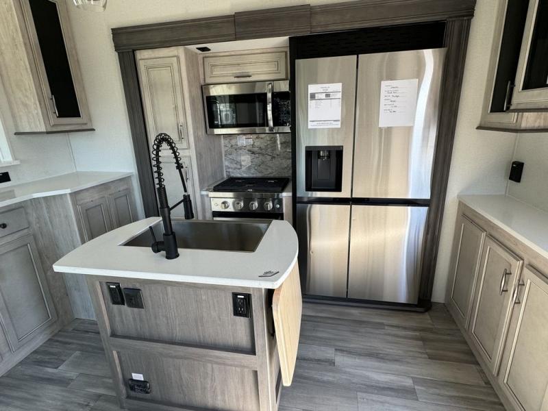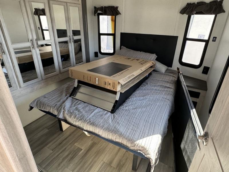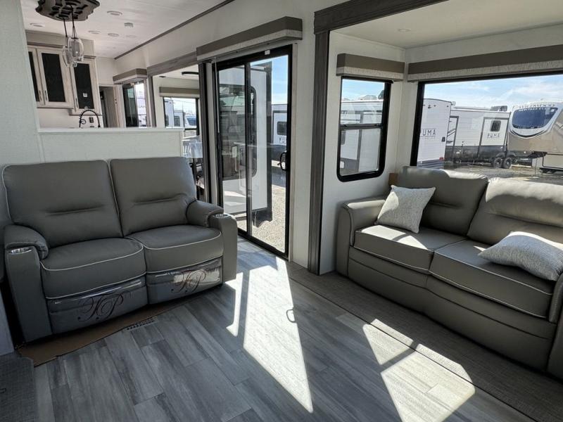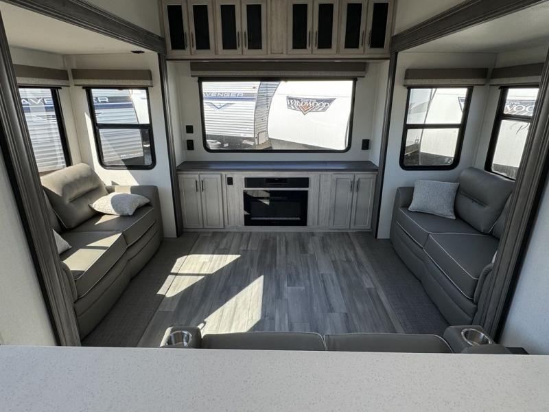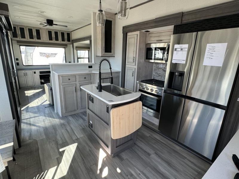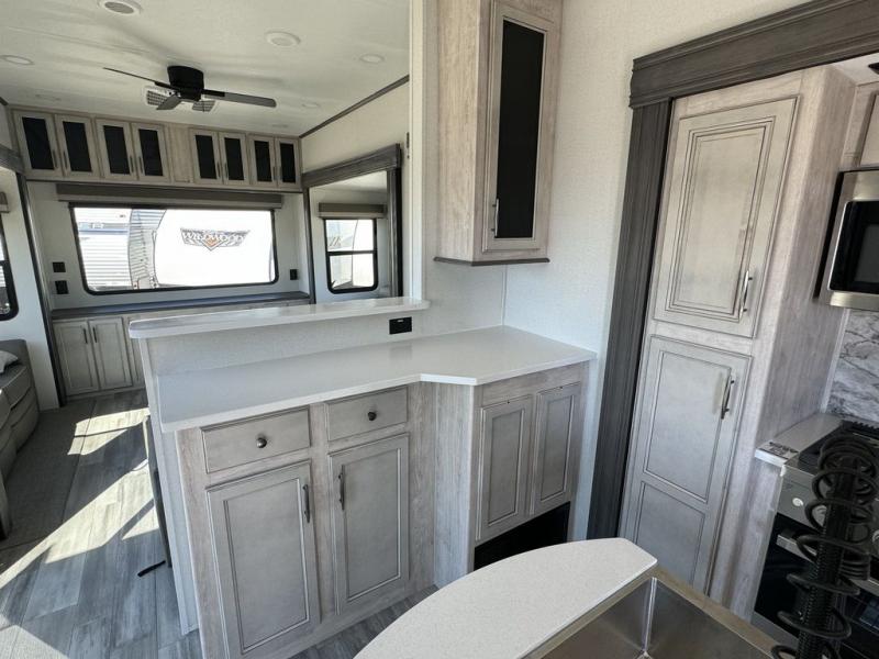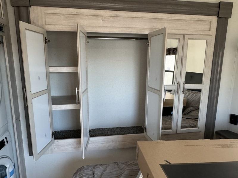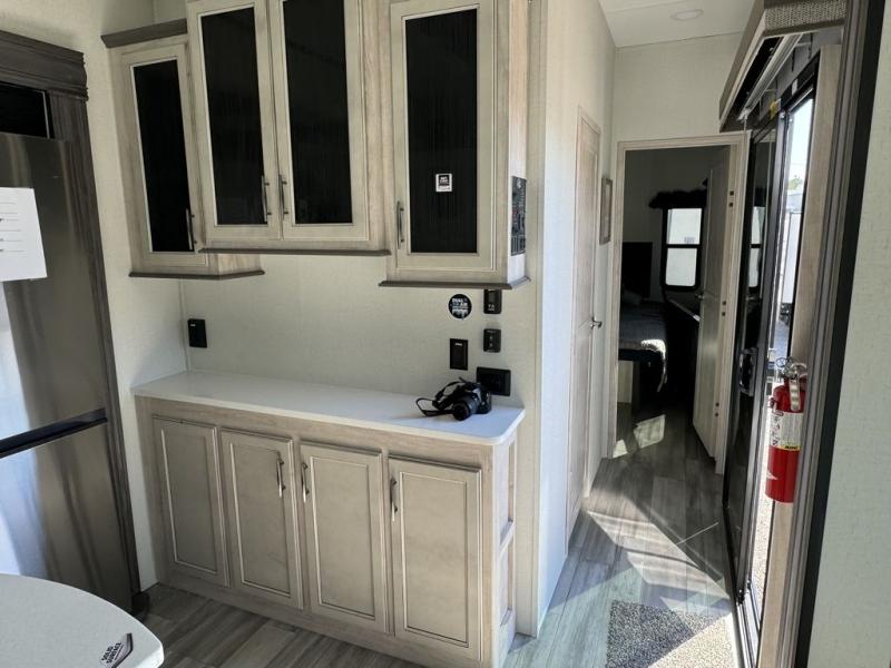 Your search for the perfect trailer is over, now all you have to do is pick your destination! The rear living area can double as a second bedroom for your guests since it includes two hide-a-bed sofas, dual opposing slides, plus theater seating across from the 50" flat screen TV and fireplace. The middle kitchen also includes dual opposing slides for maximum space, and there is buffet style countertops so you can set out a taco bar for lunch! There is also a kitchen island, a hutch, plus a full pantry for snacks galore. The front bedroom features a king bed which will give you more space to stretch out at night, plus there is a wardrobe slide out to keep your clothes neat and tidy!