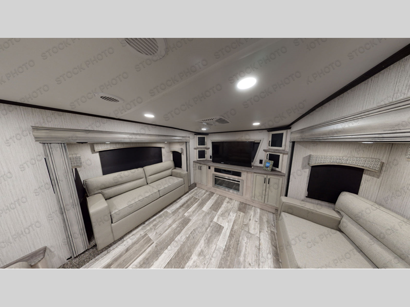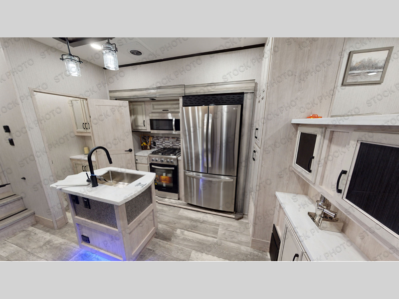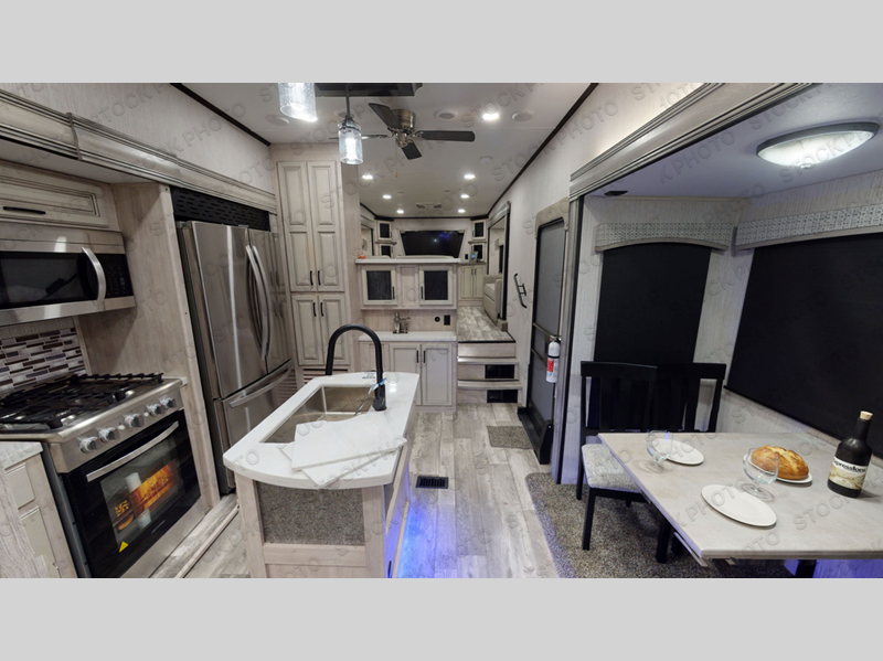 No vacation plan is complete without this Sandpiper Luxury fifth wheel! The master suite is the star of the show with its king bed slide and full bathroom with a dual-sink vanity. There is another aspect of this unit that will also grab your attention, and that is the front separate living room. This room features a front entertainment center with fireplace and 50" flat screen LED HDTV, two opposing hide-a-bed sofas, and theater seating. All of this makes the living room a perfect place to sit down with friends, and the sofas allow you to offer your friends a sleeping space if they choose to spend the night. The kitchen is centrally located, and it contains the half bathroom. As you work up a sweat cooking dinner on the four-burner range, you'll be able to switch on the ceiling fan to cool down, and you'll be able to store practically anything in the 19 cu. ft. stainless steel 12V refrigerator.