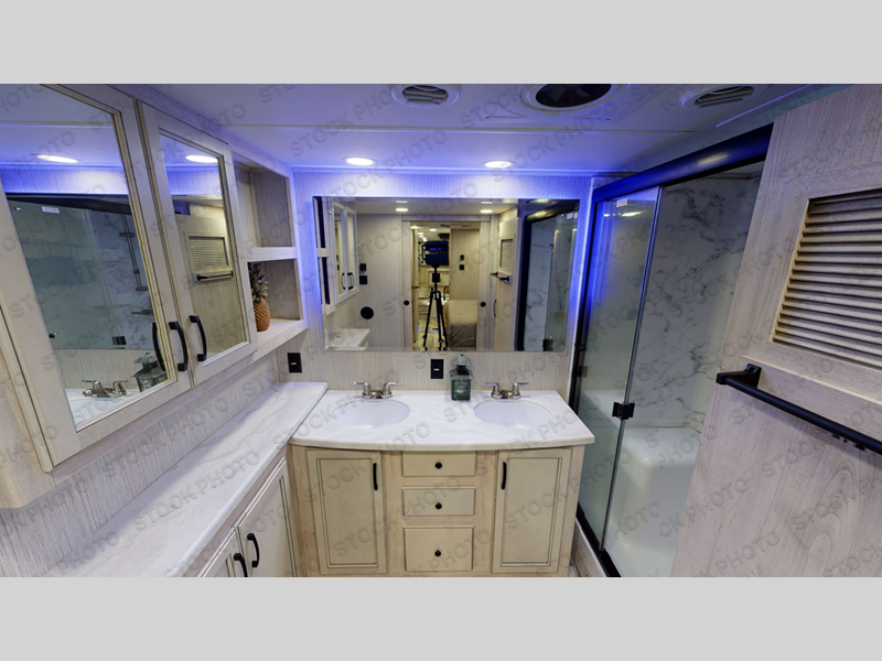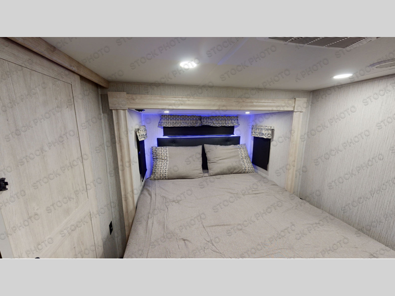 When a brand claims to be luxurious, you expect true luxury, and the Forest River Sandpiper Luxury fifth wheel delivers! The list of included features is outstanding, and the construction itself is top notch. Everything comes together on a welded aluminum-framed, vacuum-bonded laminated superstructure and a cambered powder-coated frame with rust prohibitor. There is a fully enclosed, heated underbelly and an unobstructed drop-frame pass-through storage area with cable jacks and a 110V outlet. Two LED-lit exterior speakers add some fun to the outside, and the docking station includes easy winterization, hot and cold spray port, black tank flush, and pull valves for tanks. There is also a GoPower 200W roof mounted solar panel with a controller and battery that will provide off-grid capabilities! But the true luxury is found inside with the 84" interior height, solid surface countertops, recessed residential lighting, extra-large picture windows, LED-lit headboard, and a premium sound bar with a built-in flush-mount DVD player.