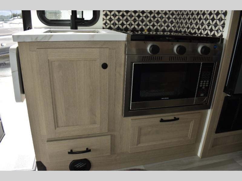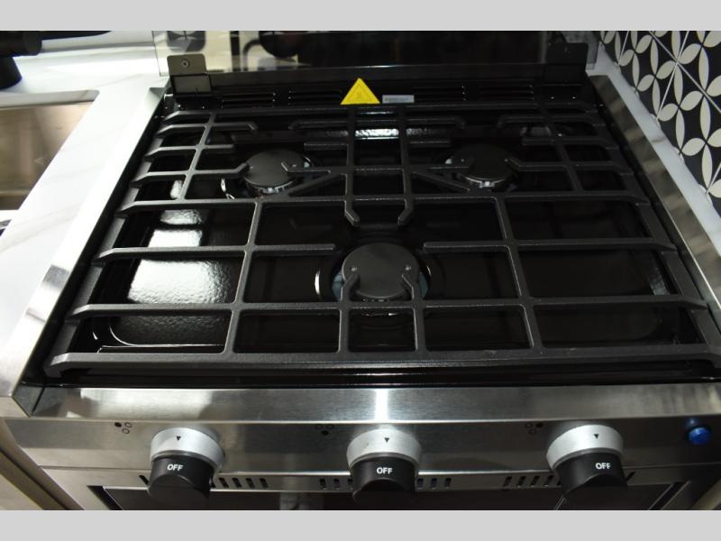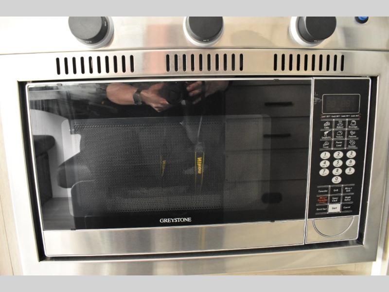 - Three-burner cooktop, convection microwave, and oven offer versatile cooking options.