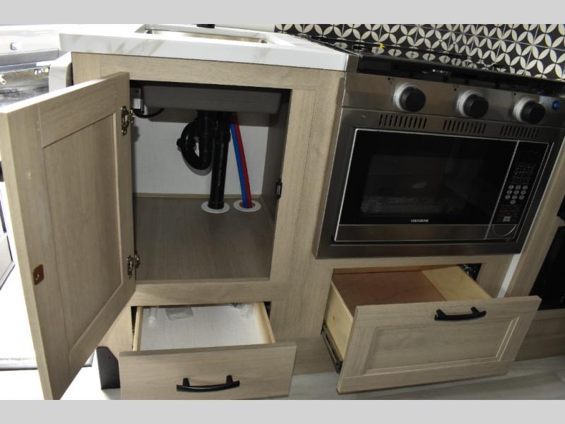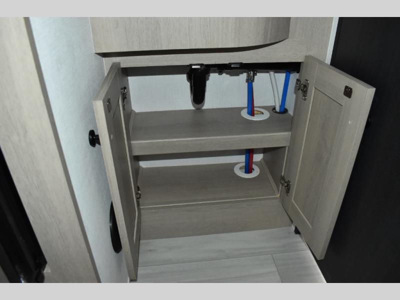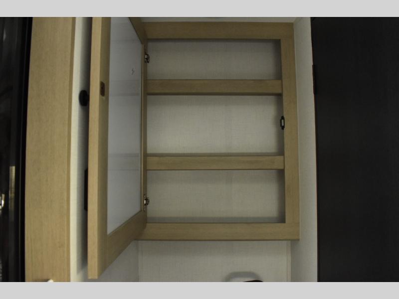 - Bathroom storage cabinets keep toiletries organized for extended trips.