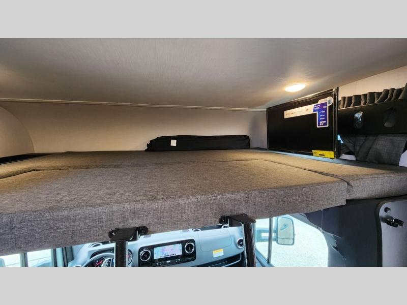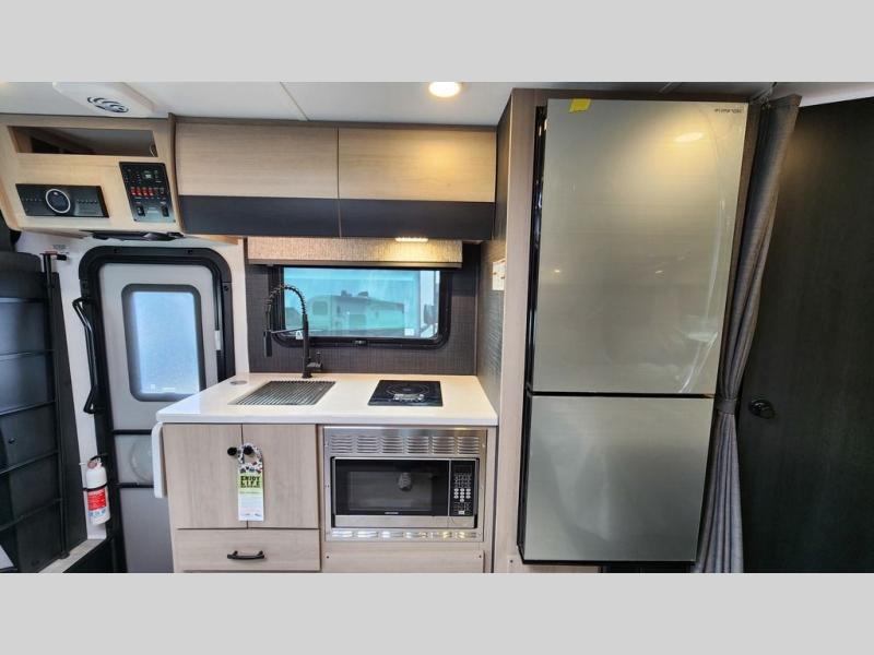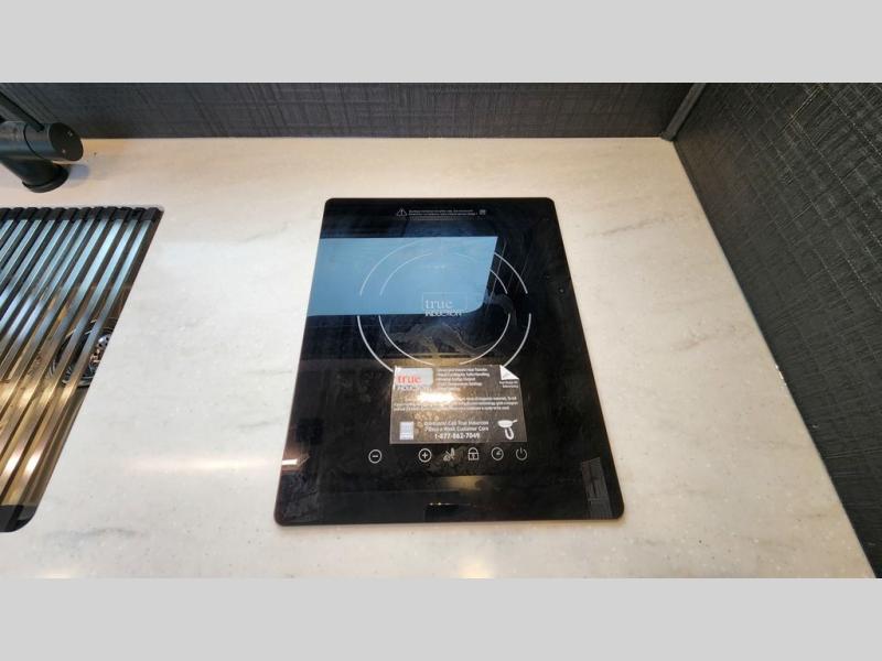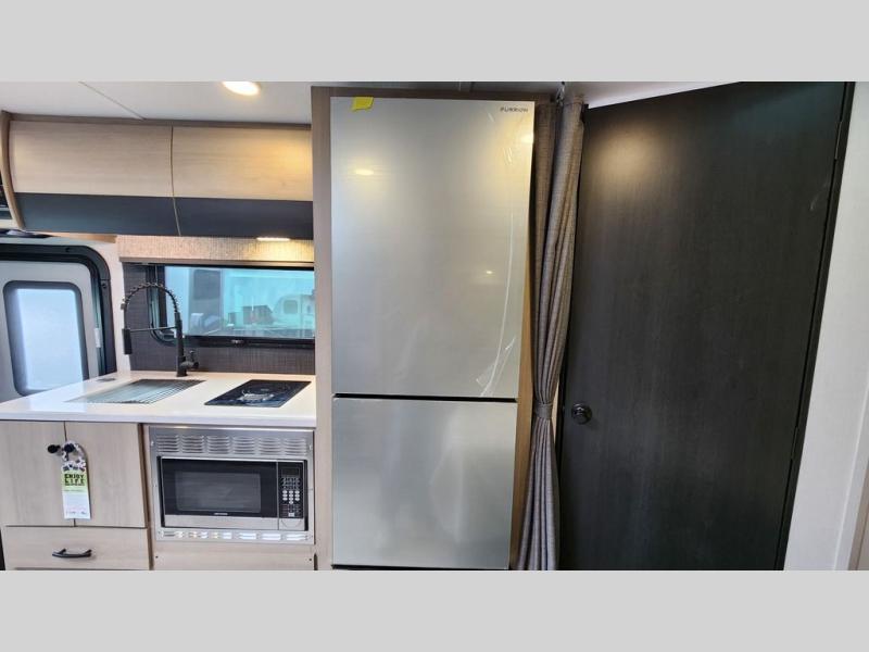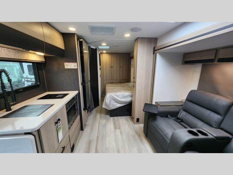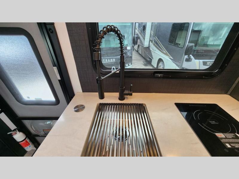 Everything you need is found in this cozy motorhome for five to six people. The swivel captain's seats can become a part of the living area once you park, and your guests can gather around the slide out U-shaped dinette which can also double as sleeping space when needed. Your meals can be prepared each day on the induction stove top, or in the 1.3 cu. ft. stainless steel convection microwave. The flip-up galley counter will provide additional counter space, and your perishables can be stored in the 10.7 cu. ft. 12V refrigerator. The semi-private bedroom features a slide out queen bed, a 12V TV, plus a wardrobe. You can also choose to add an optional 12V exterior TV if you enjoy watching the big game outdoors!