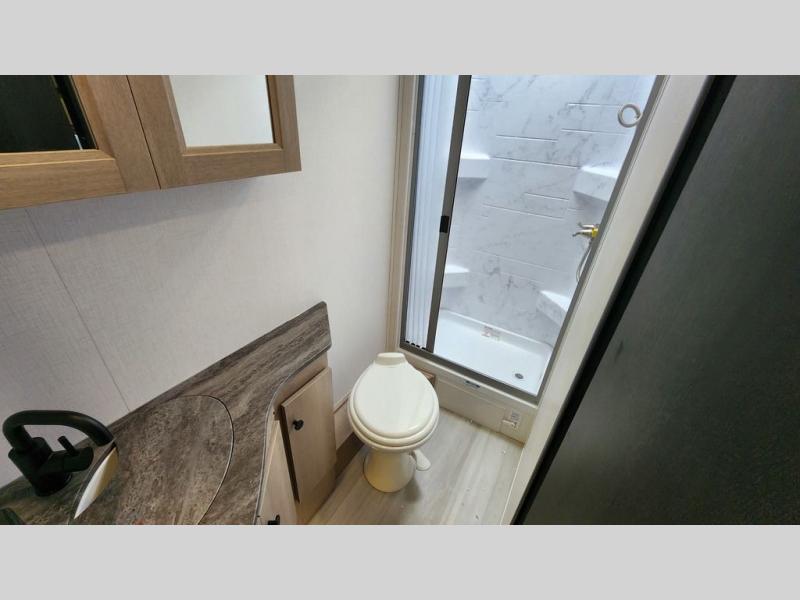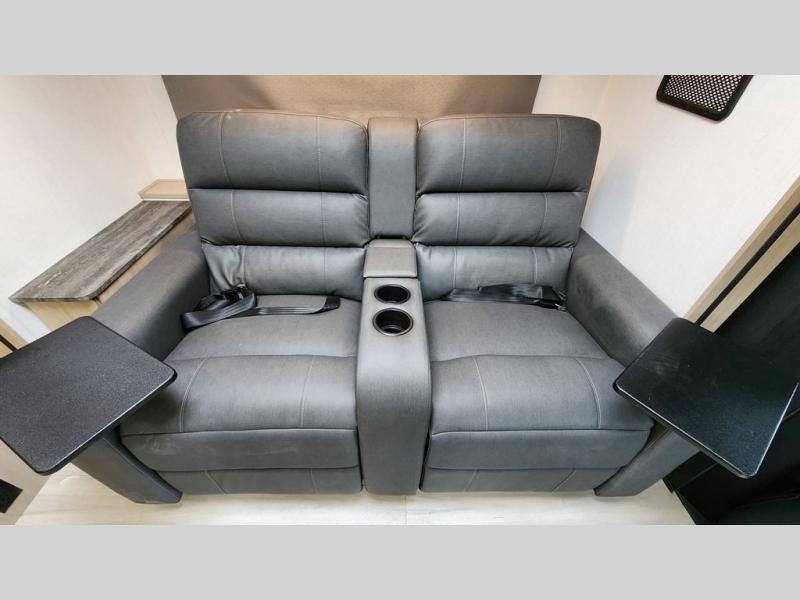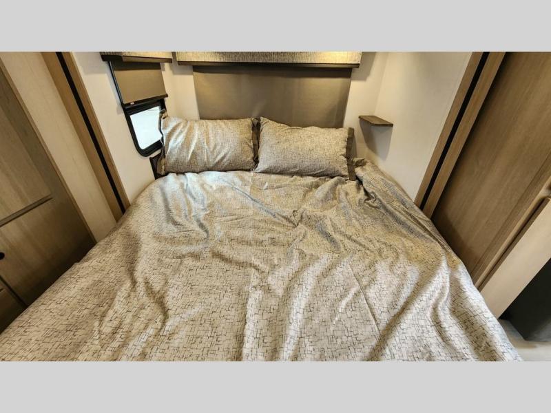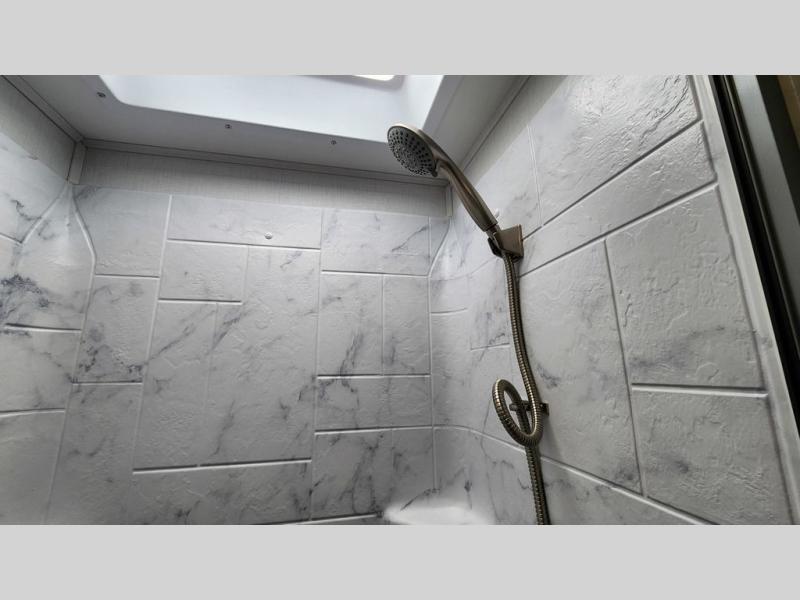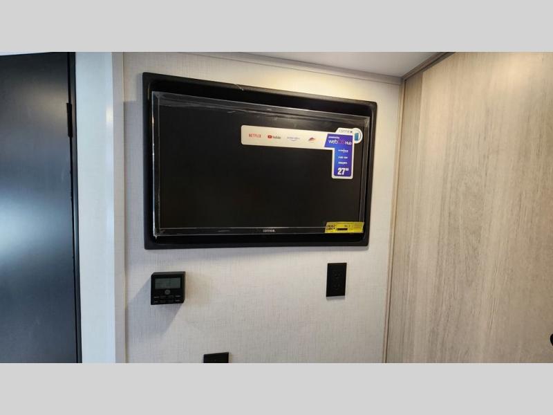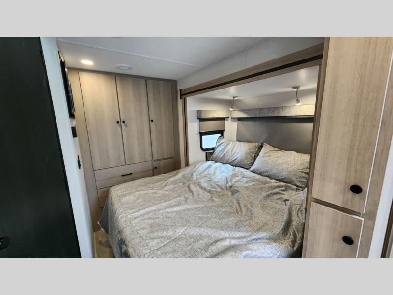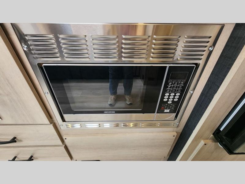 Everything you need is found in this cozy motorhome for five to six people. The swivel captain's seats can become a part of the living area once you park, and your guests can gather around the slide out U-shaped dinette which can also double as sleeping space when needed. Your meals can be prepared each day on the induction stove top, or in the 1.3 cu. ft. stainless steel convection microwave. The flip-up galley counter will provide additional counter space, and your perishables can be stored in the 10.7 cu. ft. 12V refrigerator. The semi-private bedroom features a slide out queen bed, a 12V TV, plus a wardrobe. You can also choose to add an optional 12V exterior TV if you enjoy watching the big game outdoors!