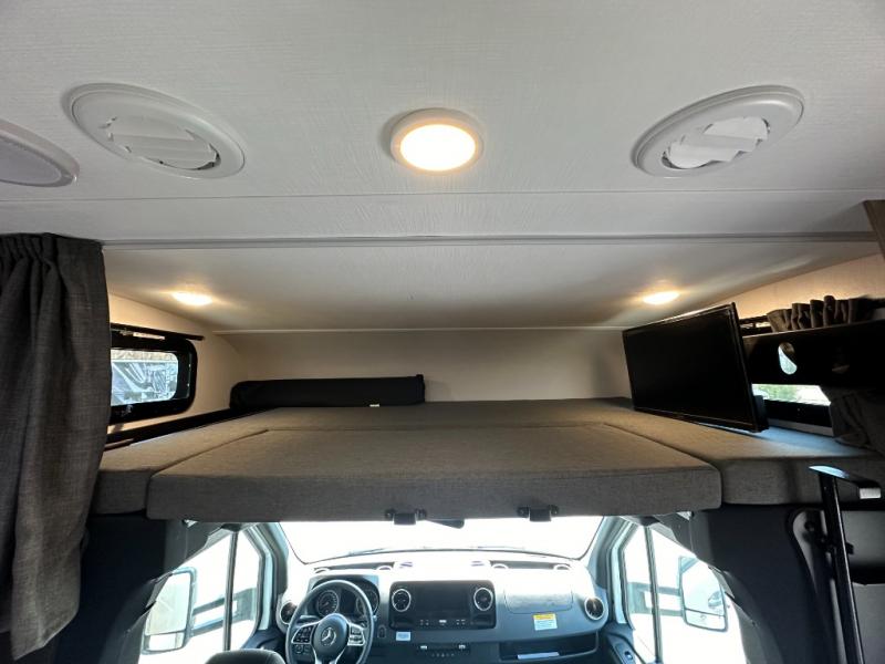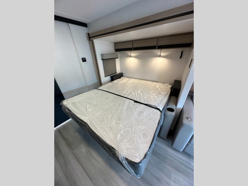 Relax after a day of adventure in the rear queen bed with memory foam mattress. Surrounding overhead cabinets and a wardrobe closet provide plenty of storage, and privacy doors give you a true bedroom feel—something rare in compact Class C RVs.