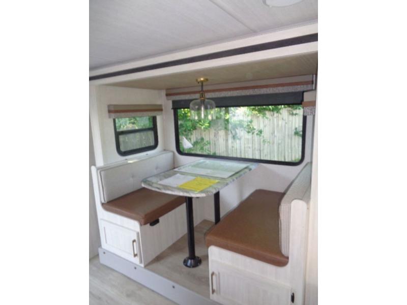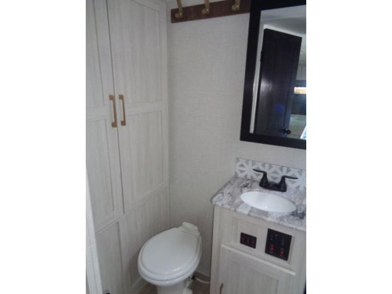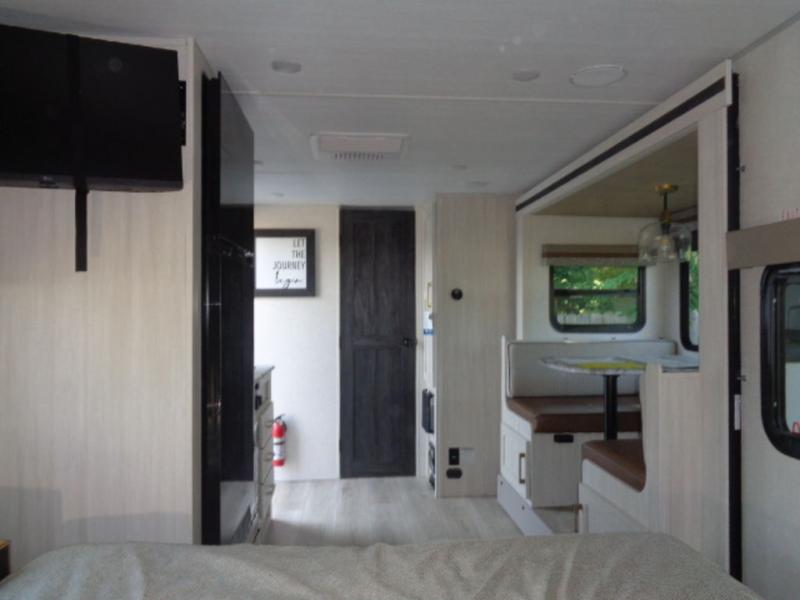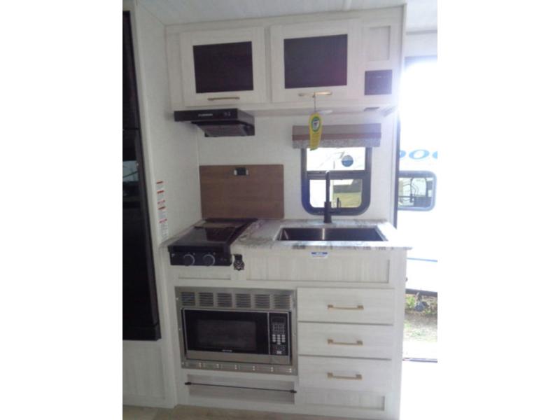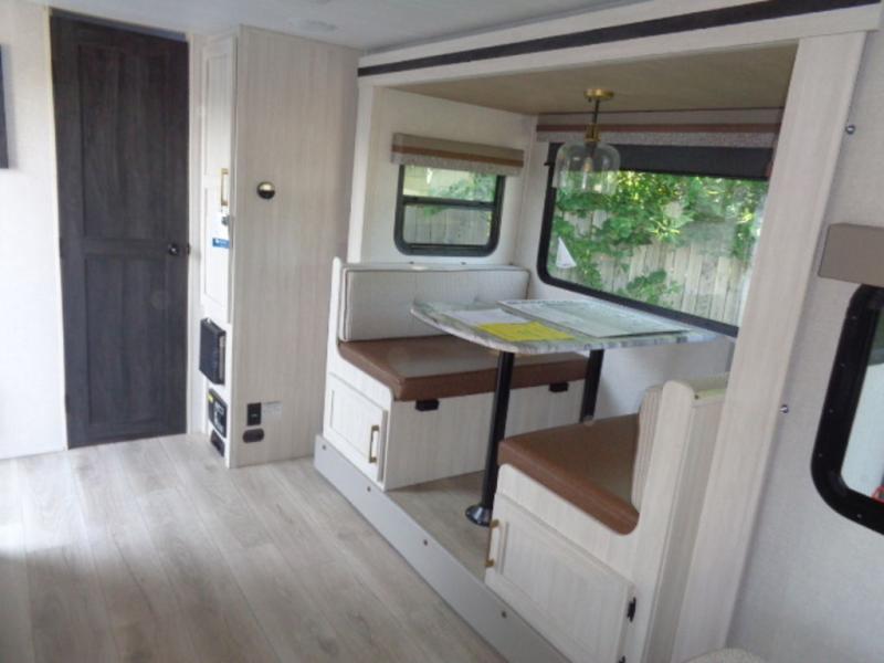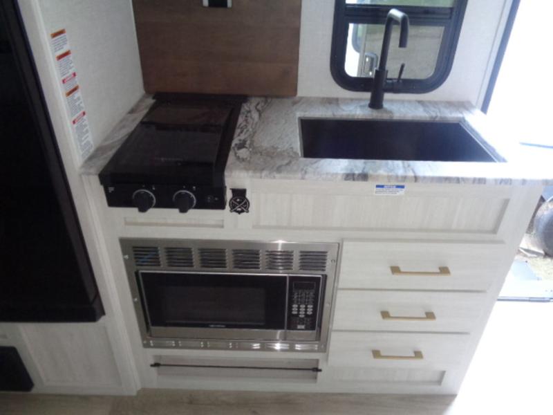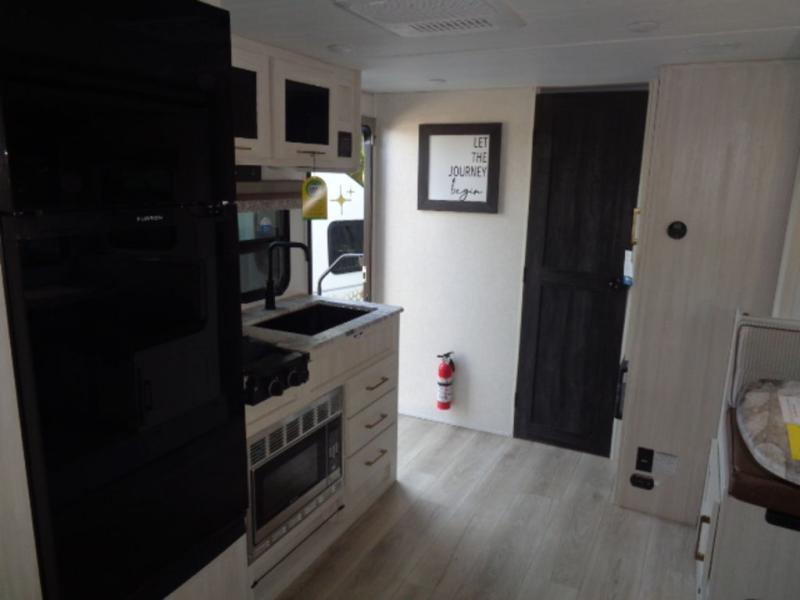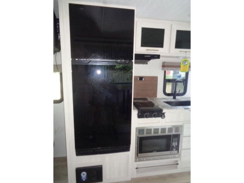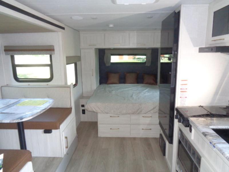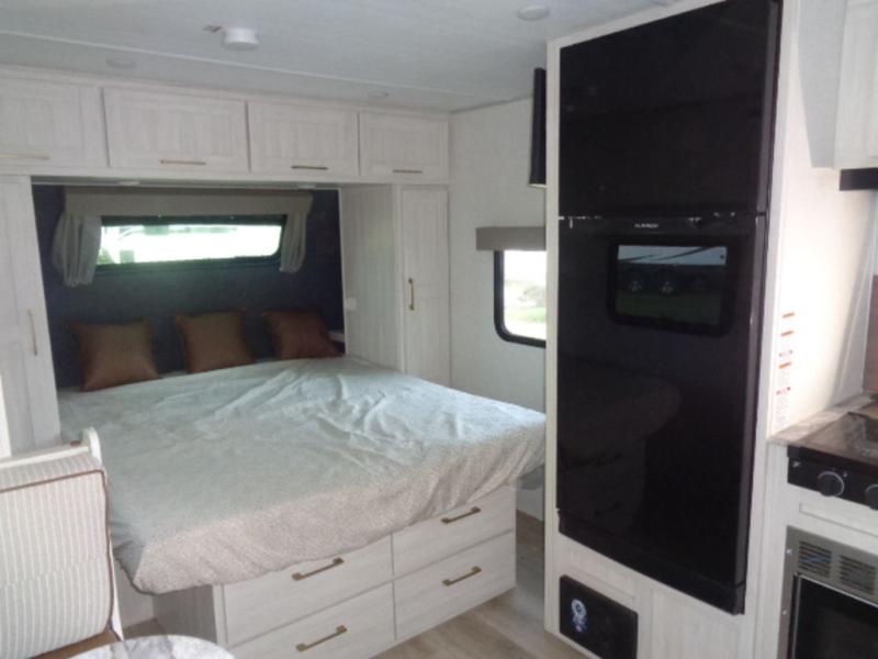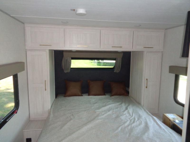 This couple's trailer resembles the layout of model 19MBLE, but with a queen-size bed up front instead of a Murphy bed. If you have an overnight guest or two little ones, they can sleep on the dinette slide, and everyone will appreciate the privacy of the full rear bath. You will have everything needed each day to prepare meals, including a two burner cooktop, a convection microwave, plus an outside kitchen. The pass-through storage will be be perfect for fishing poles, tackle boxes, or lawn chairs, and there is a 15' electric awning with LED lights to relax under!