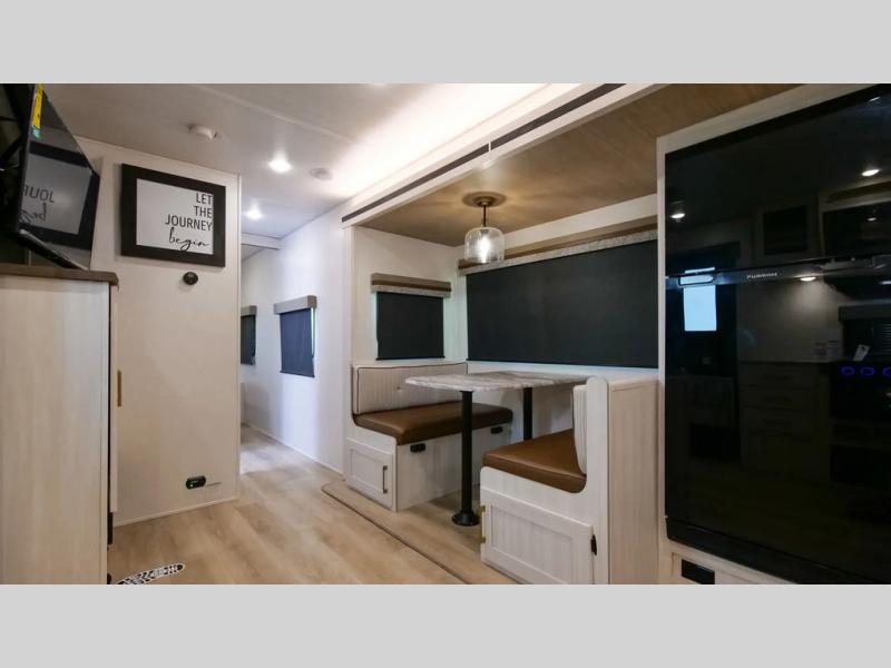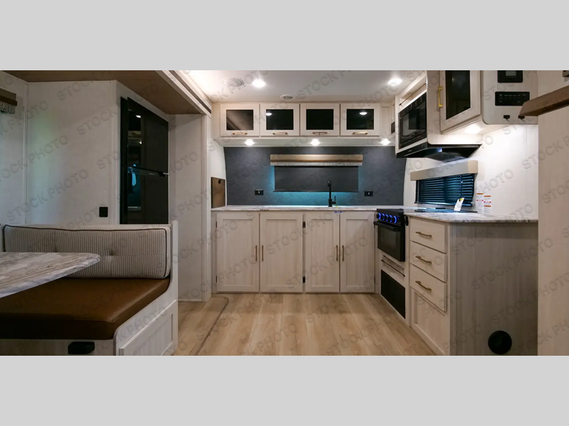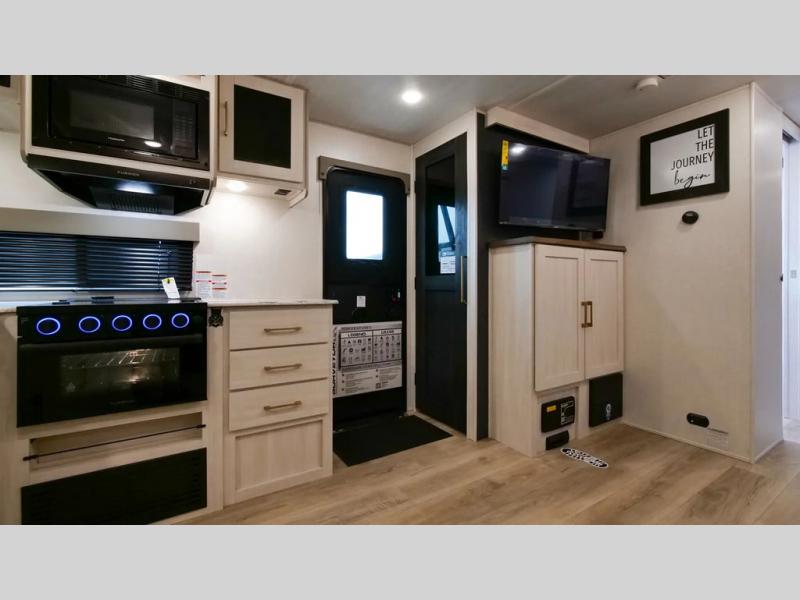 This dual entry, front kitchen travel trailer is perfect for three to four campers. You will have a rear private bedroom with a walk-around queen bed, dual wardrobes, TV prep, plus your own exterior entry door. Your guests can sleep on the booth dinette within the slide out, or you can choose the optional tri-fold sofa with a removable table. Preparing meals each day will be a breeze in the front kitchen that includes ample counter space, a residential range top with a glass cover, plus a spacious walk-in pantry. There is also an outside kitchen with a refrigerator, an 18' power awning with LED lights, and a pass-through storage for camp gear!