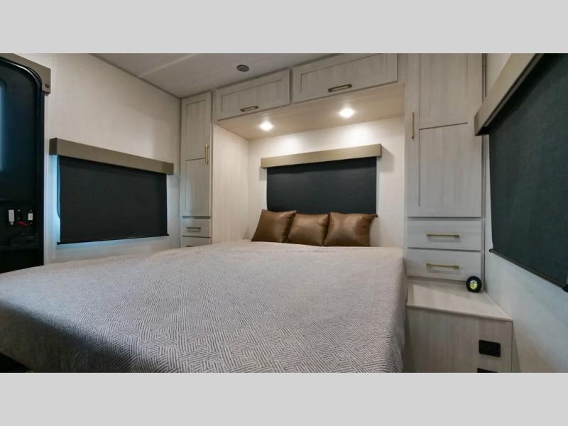 With any Surveyor Legend travel trailer by Forest River you will enjoy quality craftsmanship, convenient amenities, and at-home comforts. The Azdel composite walls provide a longer-lasting trailer, and the power tongue jack with a hitch light will get you back on the road in no-time. There are also Goodyear tires and a tire pressure monitoring system for hassle-free towing. Each model includes the Surveyor Legend Package that comes standard with oversized dinette storage access doors, front slam latch baggage doors, plus an automotive style tinted front windshield. You'll appreciate camping with a tankless water heater for endless hot showers, a 2" accessory hitch to bring bikes along, plus carpet-free interiors and a central vacuum system for easy clean up.