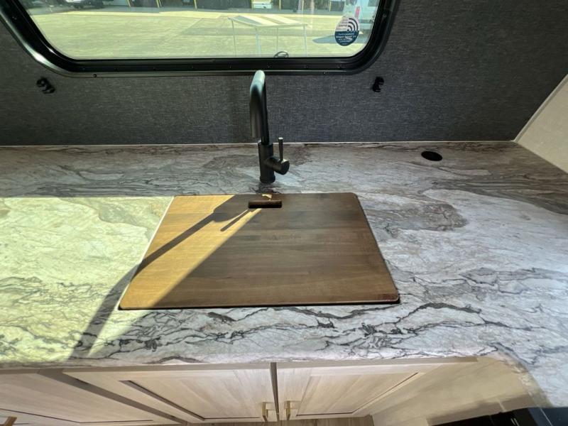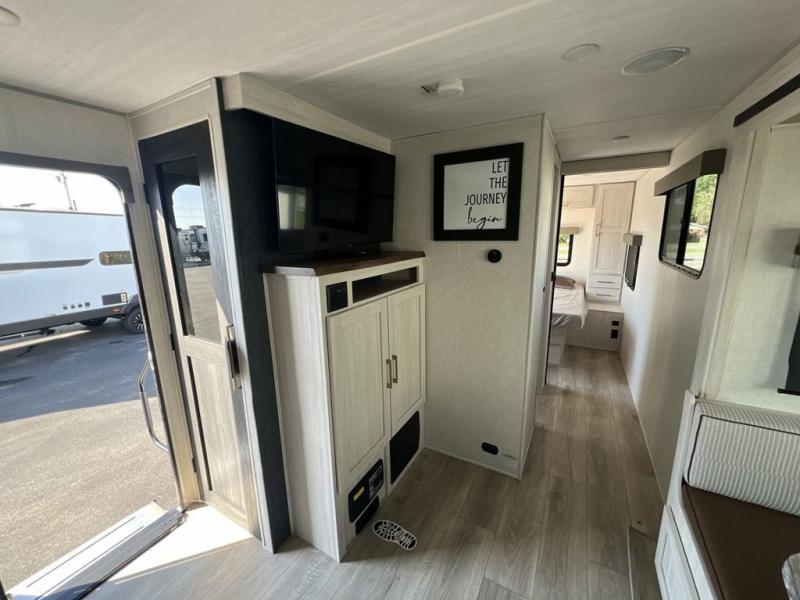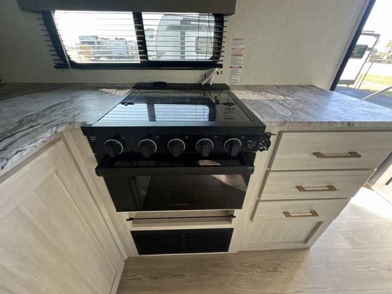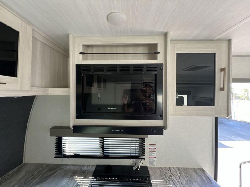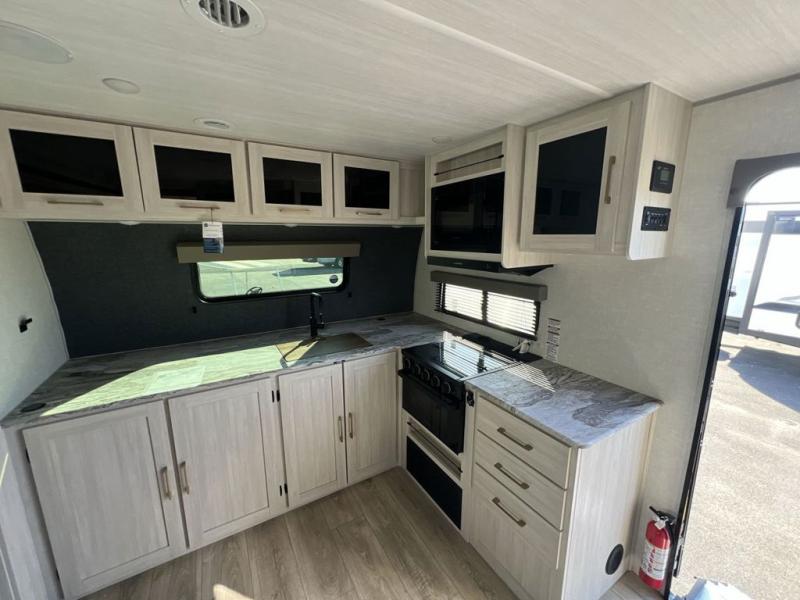 This dual entry, front kitchen travel trailer is perfect for three to four campers. You will have a rear private bedroom with a walk-around queen bed, dual wardrobes, TV prep, plus your own exterior entry door. Your guests can sleep on the booth dinette within the slide out, or you can choose the optional tri-fold sofa with a removable table. Preparing meals each day will be a breeze in the front kitchen that includes ample counter space, a residential range top with a glass cover, plus a spacious walk-in pantry. There is also an outside kitchen with a refrigerator, an 18' power awning with LED lights, and a pass-through storage for camp gear!